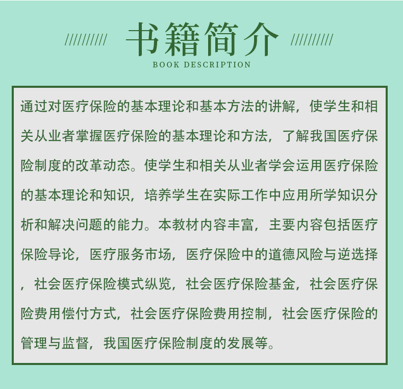 通过对医疗保险的基本理论和基本方法的讲解,使学生和相关从业者掌握医疗保险的基本理论和方法,了解我国医疗保险制度的改革动态。使学生和相关从业者学会运用医疗保险的基本理论和知识,培养学生在实际工作中应用所学知识分析和解决问题的能力。本教材内容丰富,主要内容包括医疗保险导论,医疗服务市场,医疗保险中的道德风险与逆选择,社会医疗保险模式纵览,社会医疗保险基金,社会医疗保险费用偿付方式,社会医疗保险费用控制,社会医疗保险的管理与监督,我国医疗保险制度的发展等。