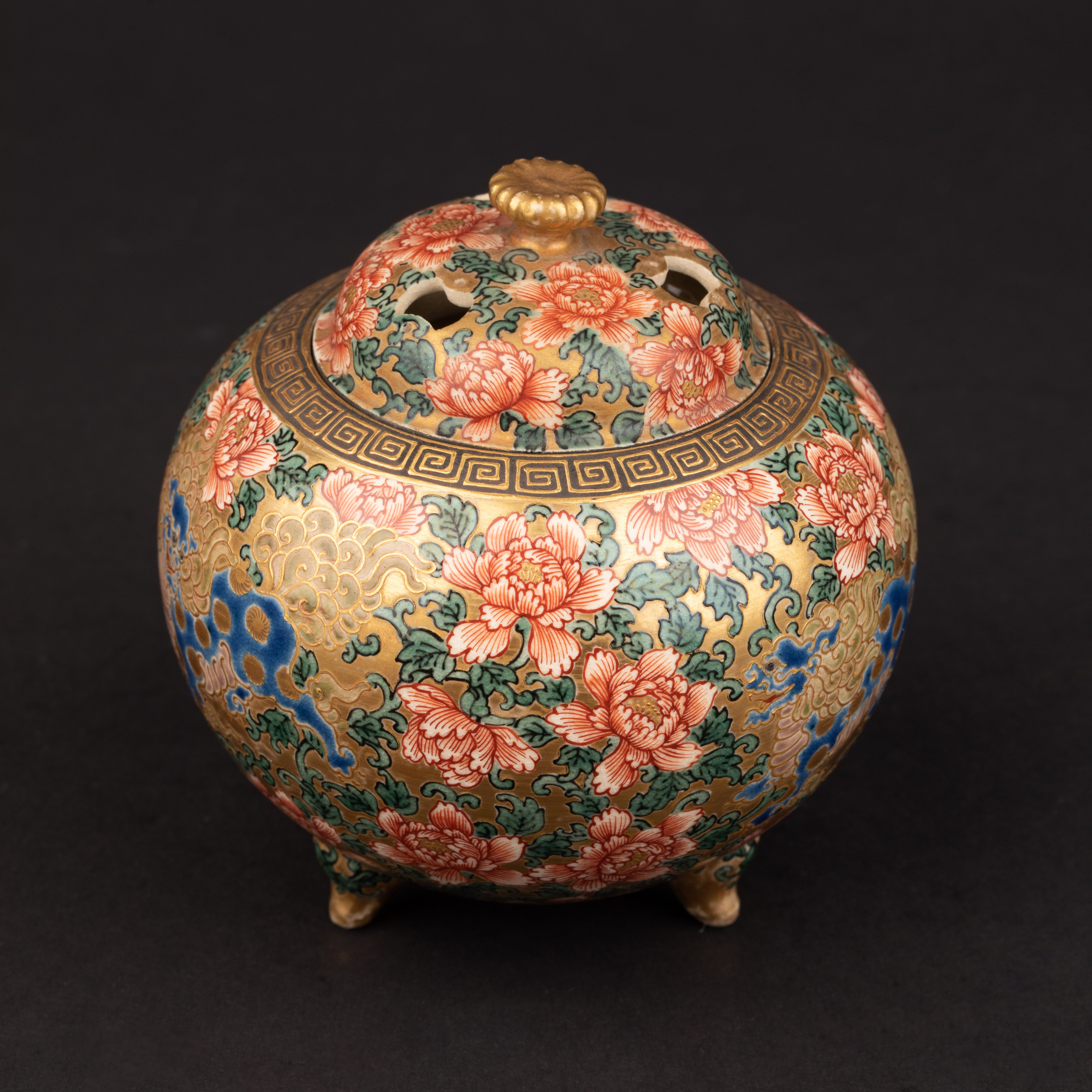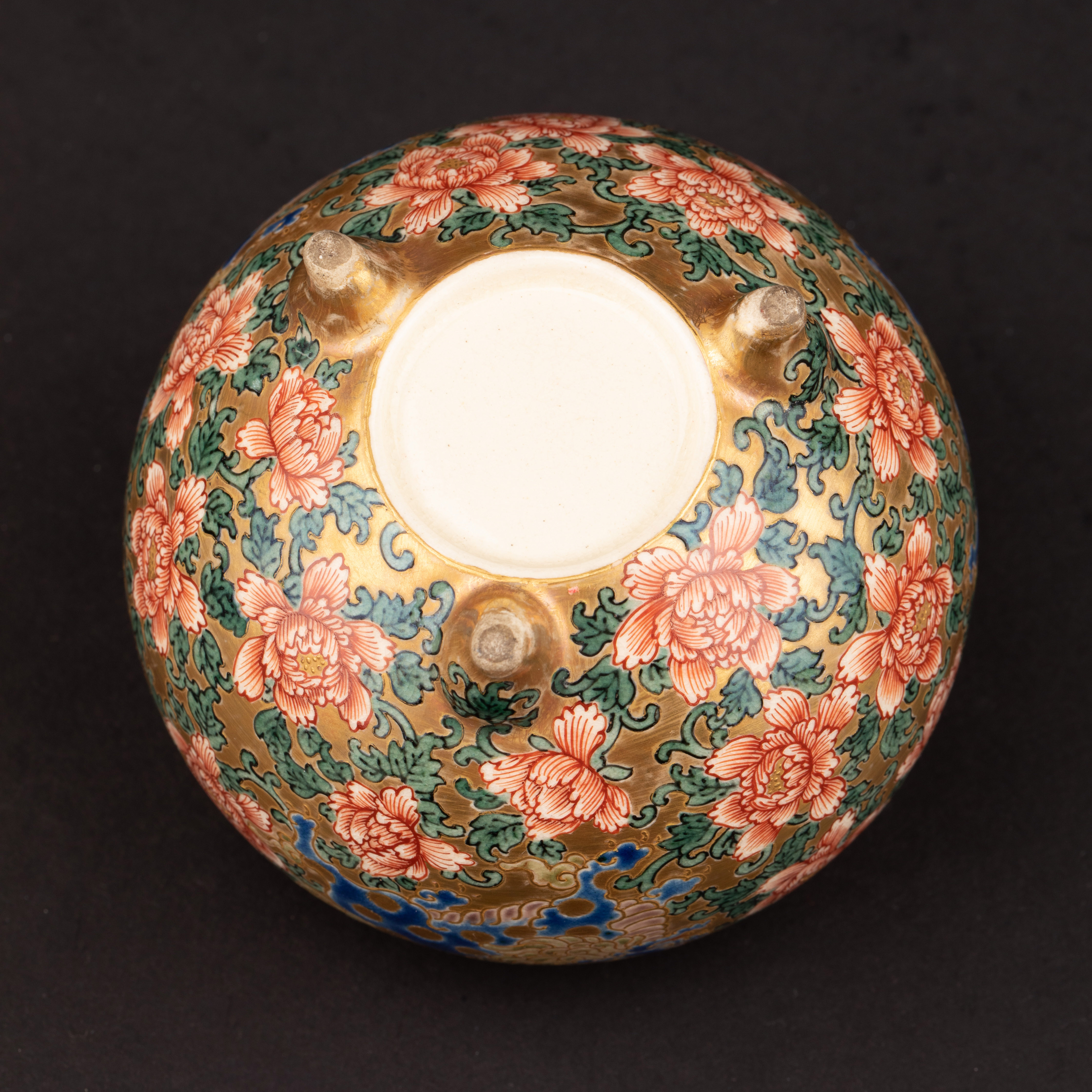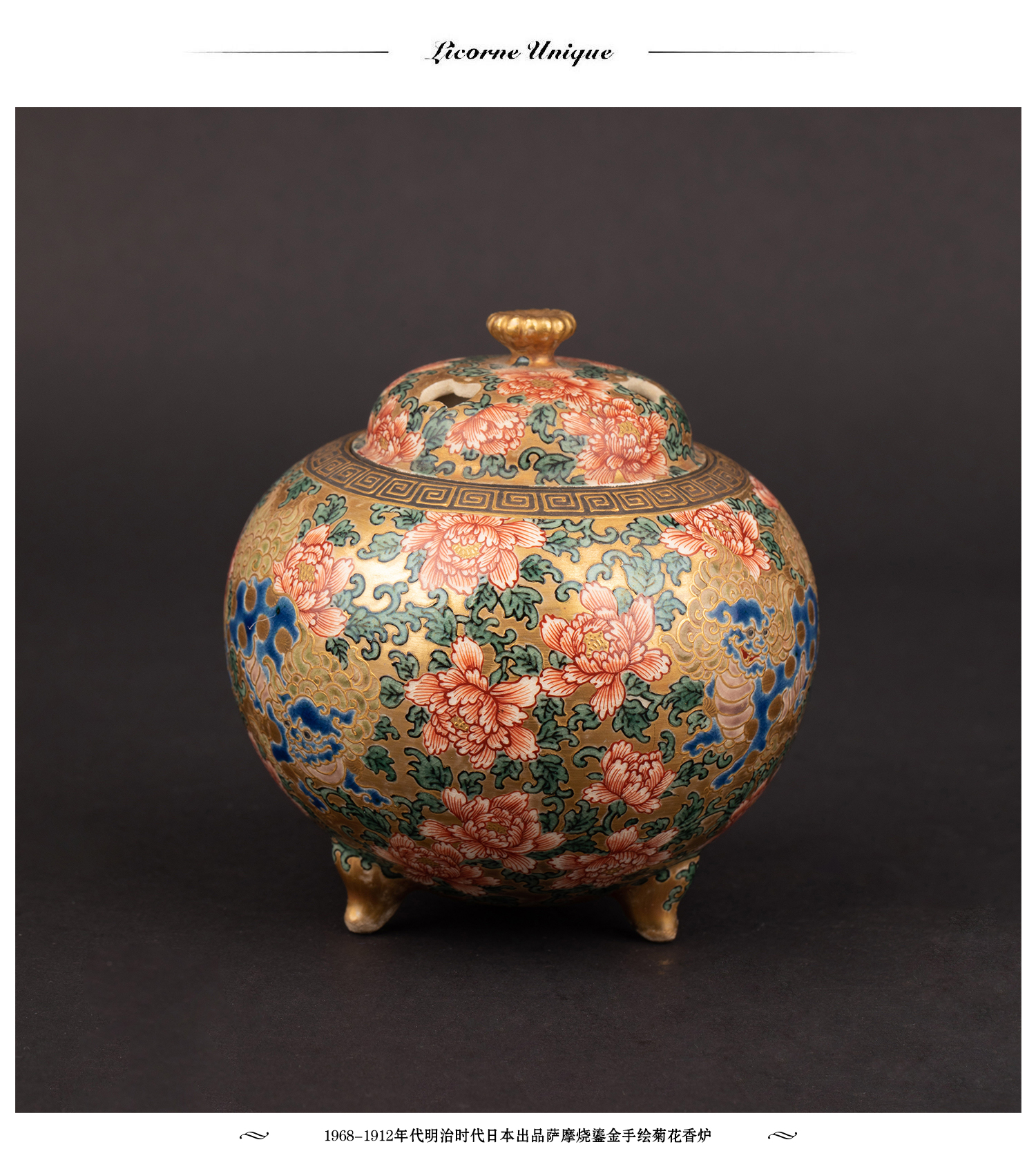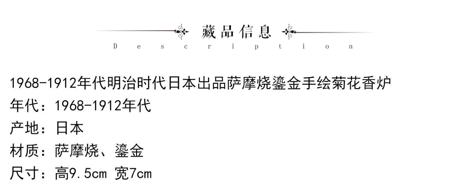独角鹿西洋古董明治时代日本萨摩烧鎏金手绘菊花香薰炉摆件