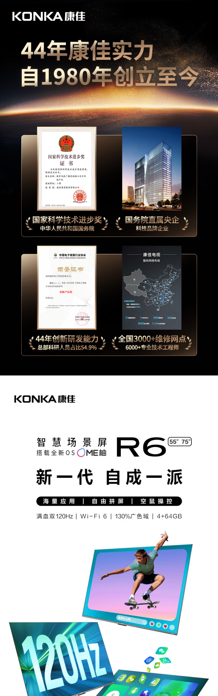 康佳(912543)电视 75R6 75英寸 120Hz高刷 WIfi6 4+64GB 4K超清全面屏 智能网络 液晶平板游戏电视机巨幕