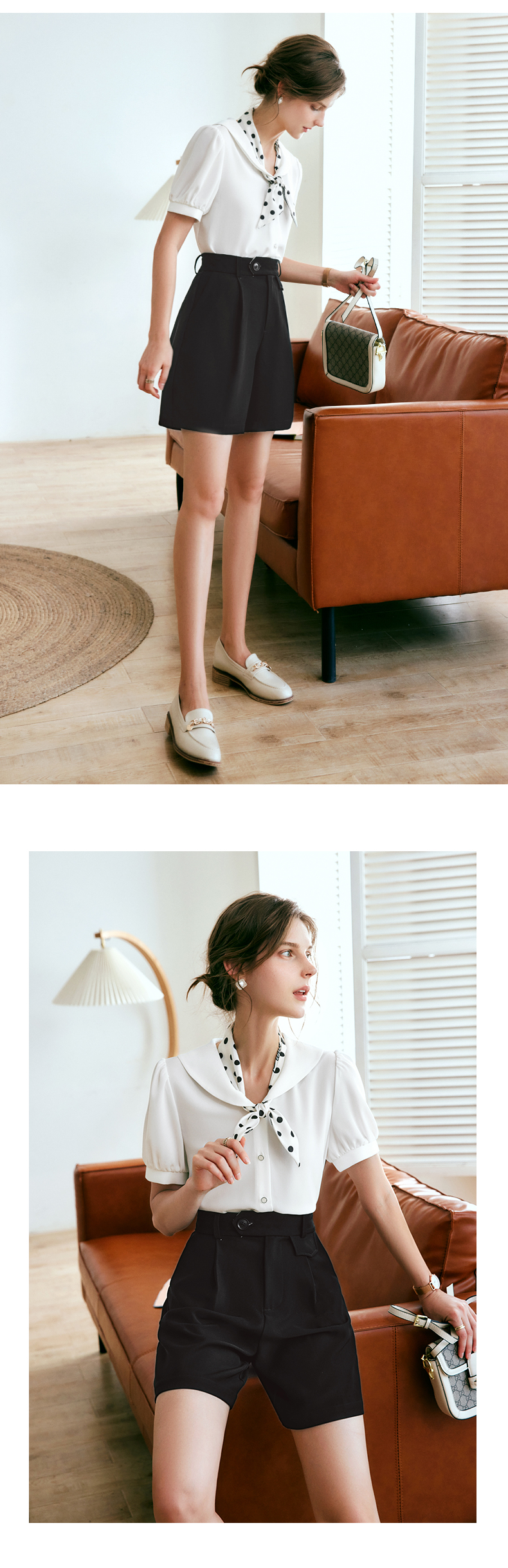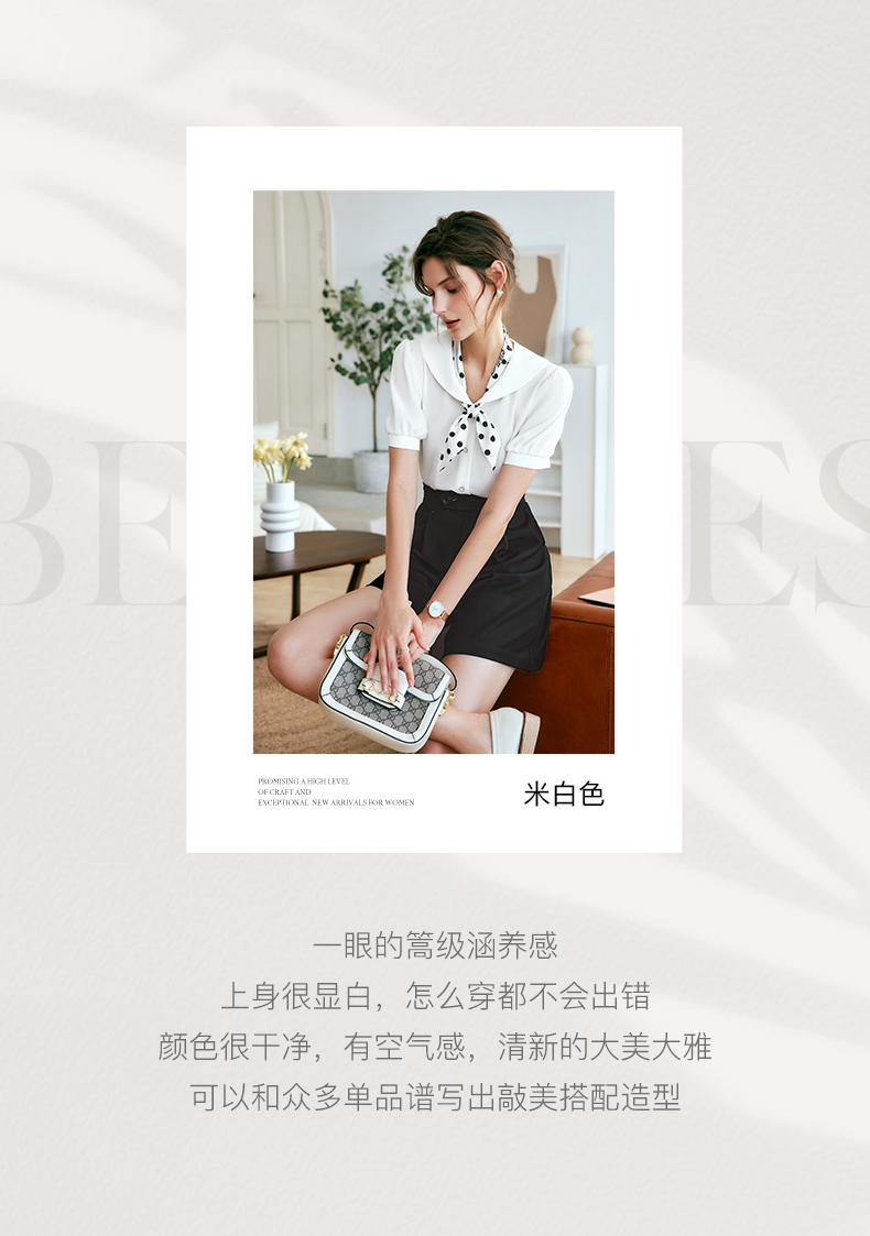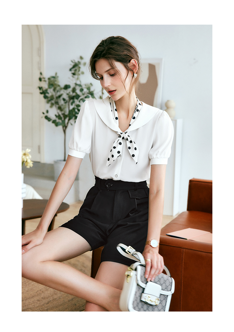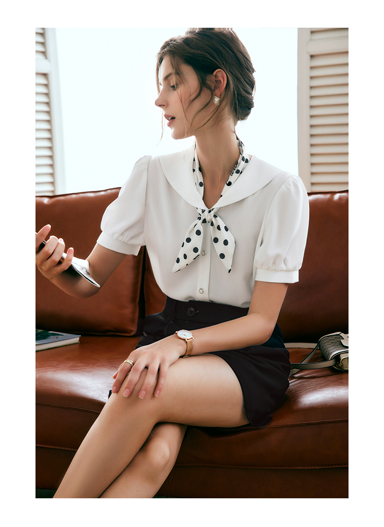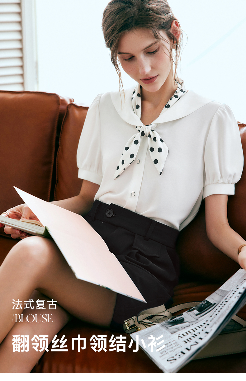 欧芮儿OLrain法式白色雪纺衫女夏季2022新款复古丝巾人字纹上衣