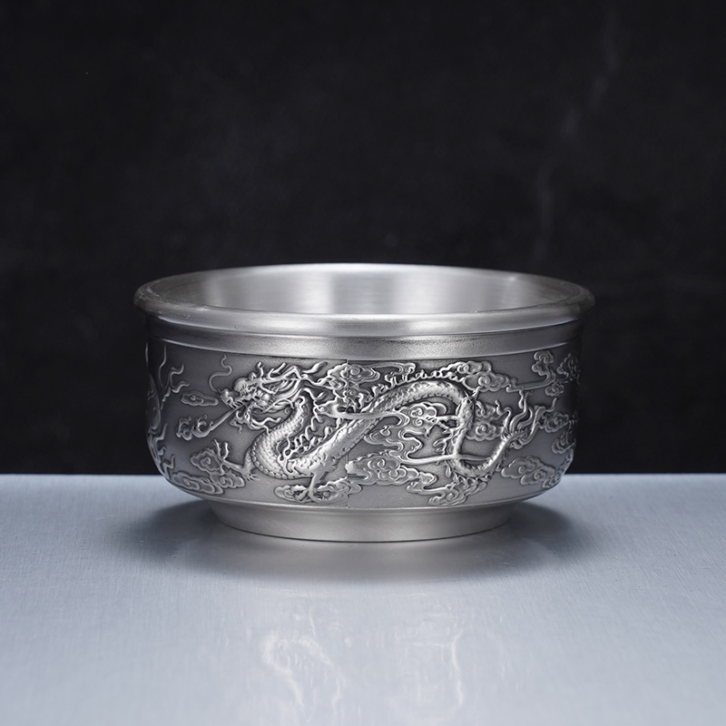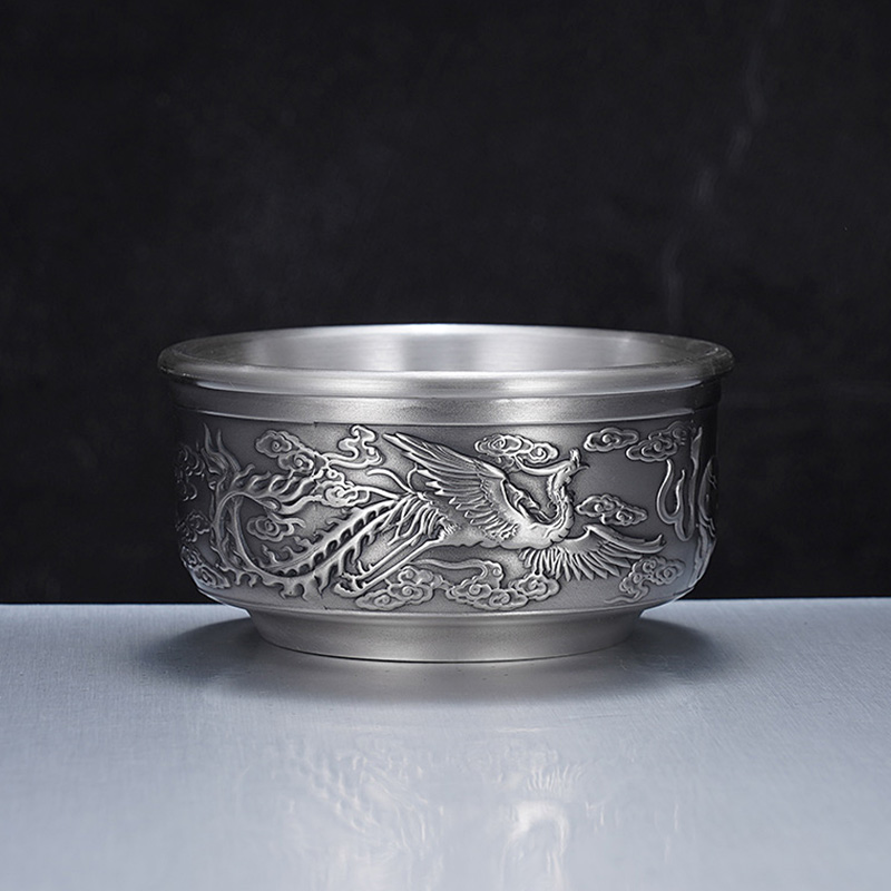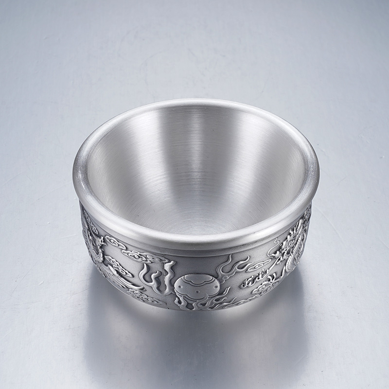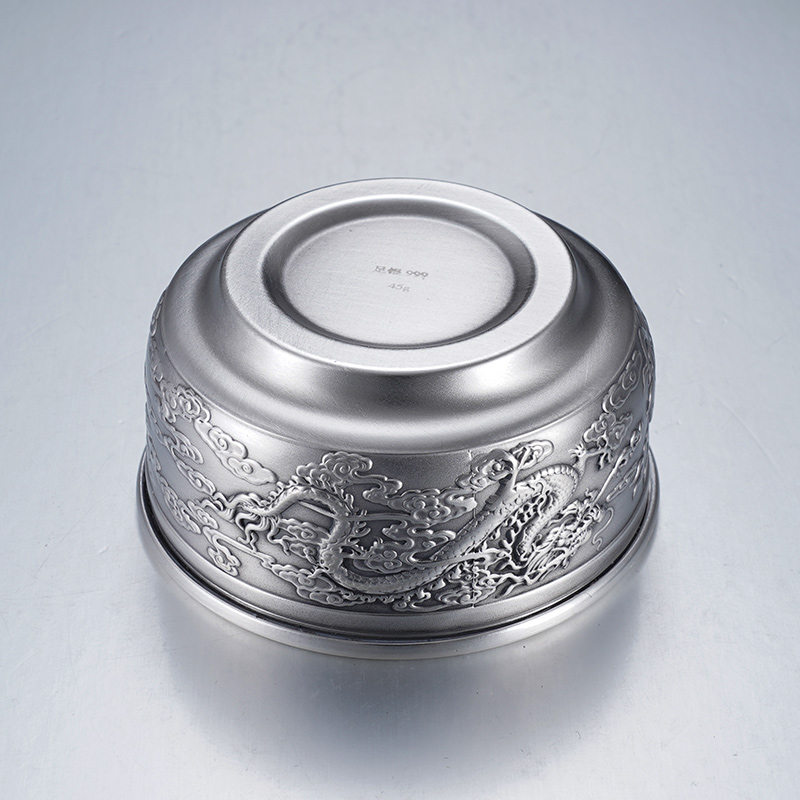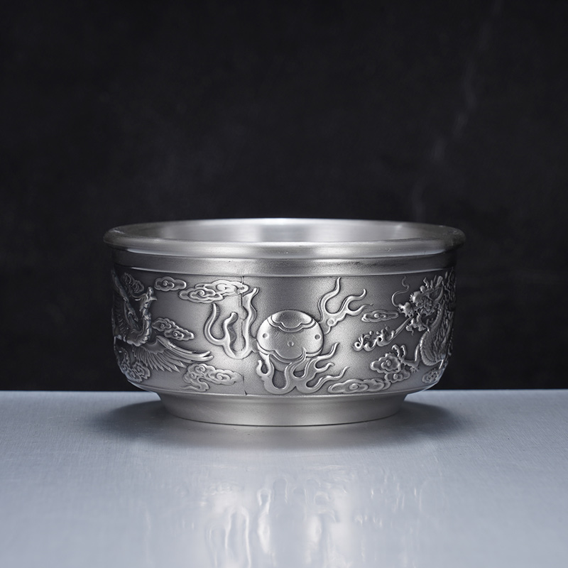 【寓意】:足银茶杯之上雕刻龙凤戏珠图案。龙凤身姿矫健,神采飞扬,其毛发纹理清晰,几近飘动之态,尽显工艺之精湛。此作品寓意吉庆祥和、繁荣昌盛。