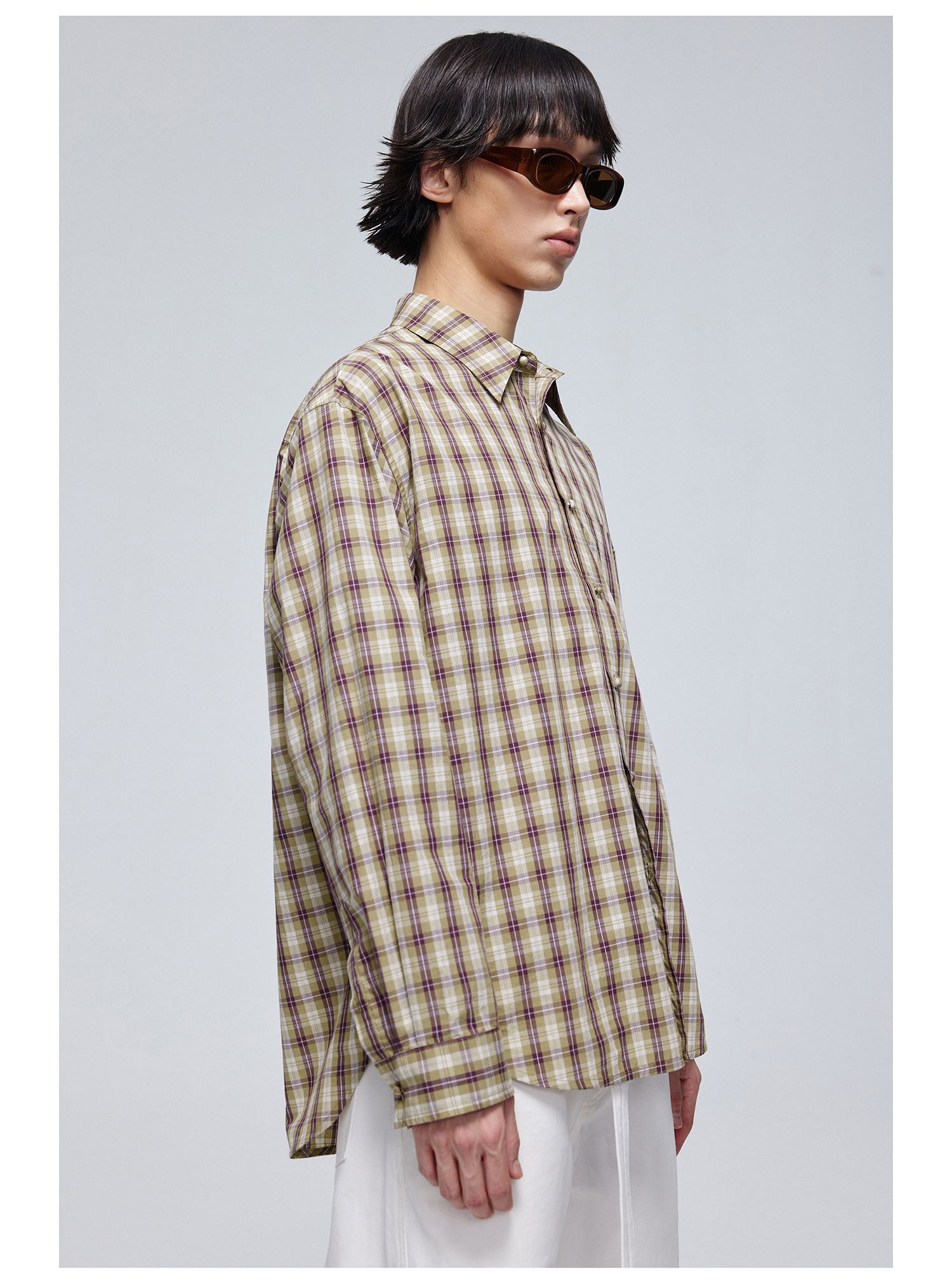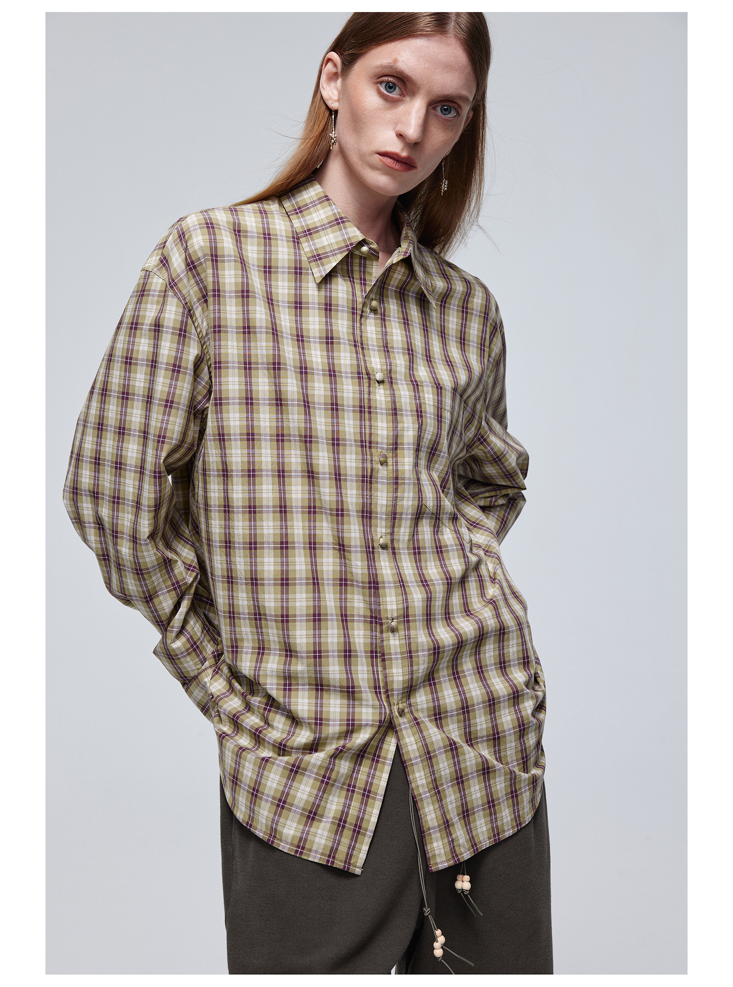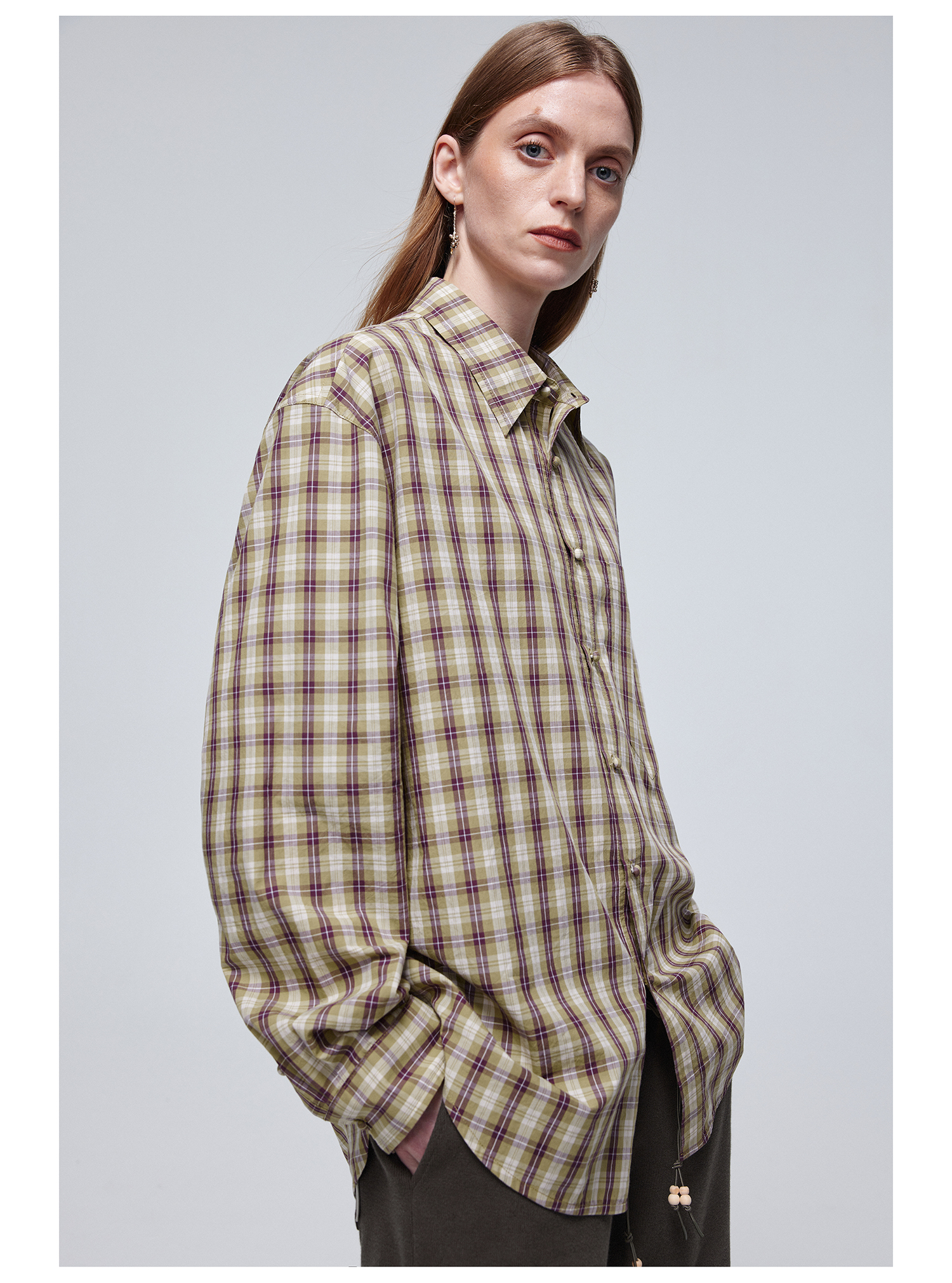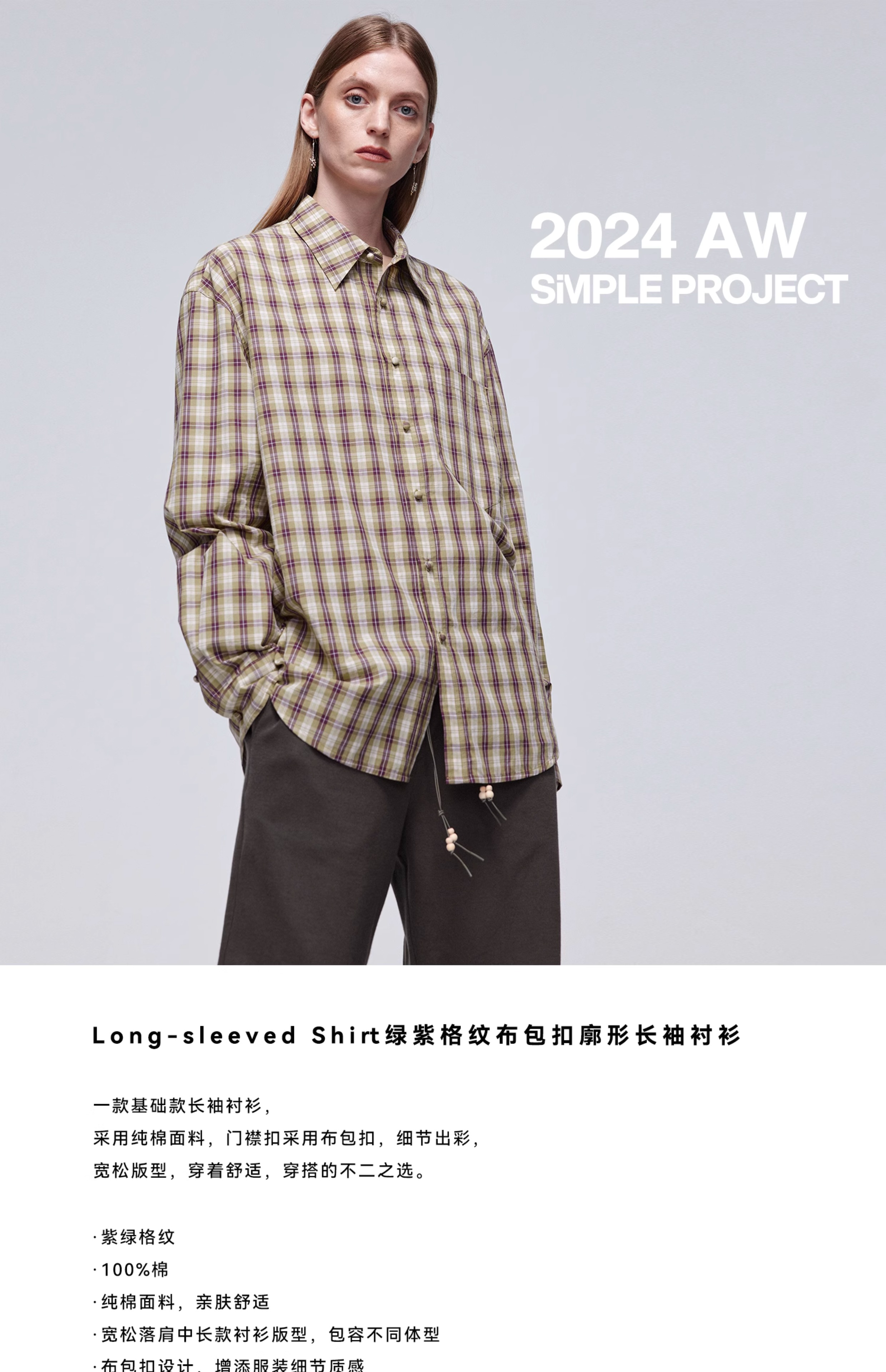 Simple Project/Y24120/绿紫格纹布包扣廓形长袖衬衫
