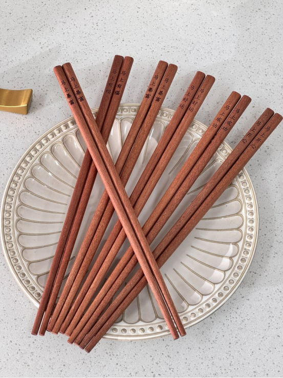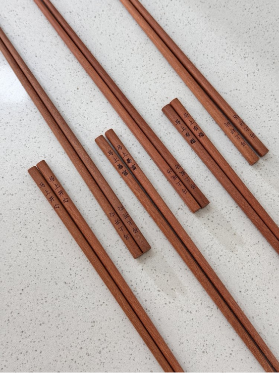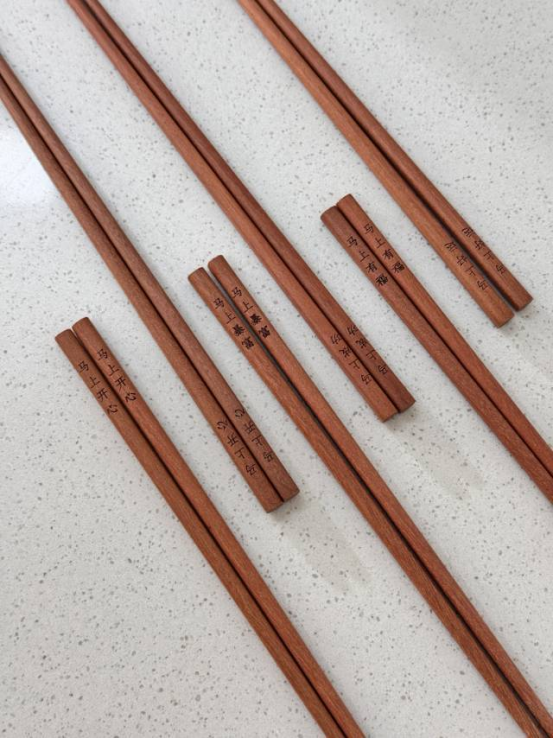 花梨木因色泽温润、纹理精美 如同皇后一般雍容华贵 受到文人雅士、贵族阶层的喜爱 是追求品质生活的首选之材! 本次升级款花梨木筷,在原有的基础上加粗 .让握持手感更舒适、更好用!