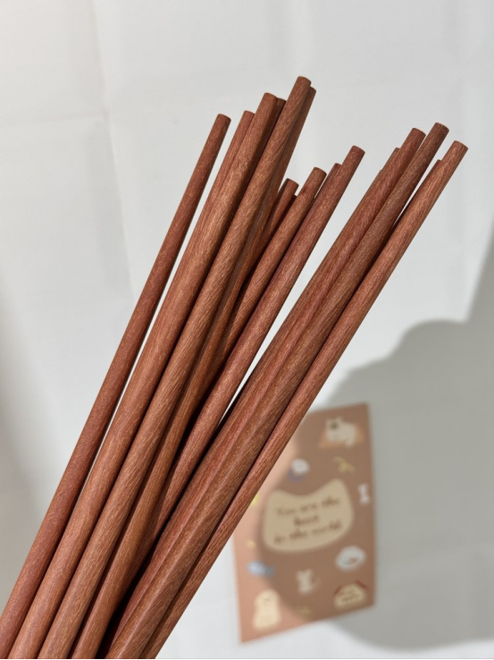 筷子都是食品接触级材质 大人小孩都可以放心使用 不抛光❗不打蜡❗不加油漆❗ 不生虫❗不腐烂❗避水性好❗ 长时间使用,也不容易发霉 自带淡淡香气,就是木材本身的原木味道❗