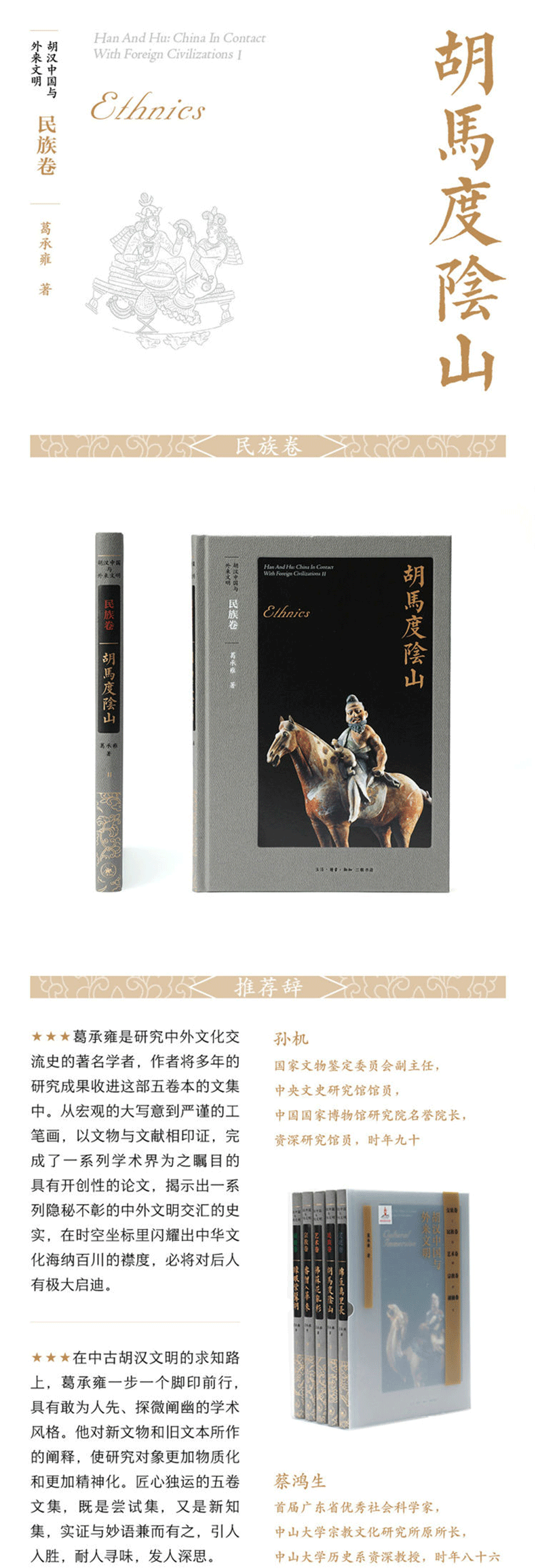 全书总书名为《胡汉中国与外来文明》,分为五卷,即《交流卷:绵亘万里长》《民族卷:胡马度阴山》《艺术卷:拂菻花乱彩》《宗教卷:番僧入华来》《胡俑卷:绿眼紫髯胡》。在书中,作者纵论胡汉文化如何在汉唐时期进行深入交流互动,具体考察了入华胡人的生活状况,探讨外来文明对中原建筑、书法、绘画、雕塑以及生活习俗等方面的影响,挖掘祆教、摩尼教、景教等在中原地区的传播。作者长期工作于考古文博的一线,亲身接触大量新出土但尚未刊布的考古文物及文献成果,在此基础上,作者撰写多篇文章并配以重要的图片,这些研究文章对于推动历史学、考古学的研究,对于建立中国学者与国际学术界的交流有着极其重要的意义。同时,作者关注的地域空间大多与汉唐以来丝路沿线的族群、政权相关联,对于这些地区的历史、文化、宗教、艺术的基础性研究,对于扎实推进“一带一路”构想有着积极作用。