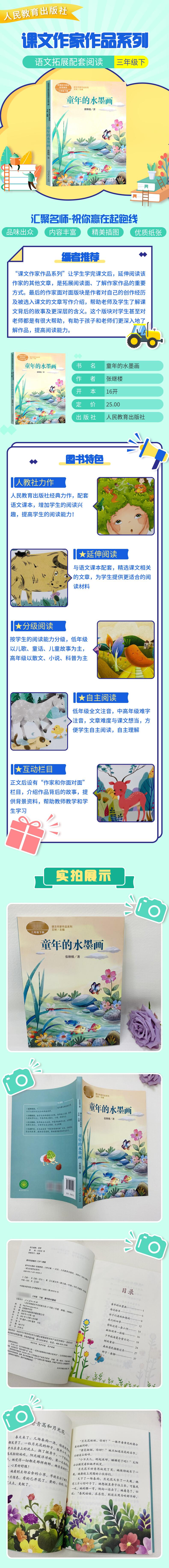 《童年的水墨画》是“课文作家作品系列”中三年级上册中的一本。本书收录了张继楼的经典儿歌及童话,为小学生量身打造,配有多幅彩色插图。最后的作家面对面版块是作者对自己的创作经历及被选入课文的《一块奶酪》这篇文章的写作介绍,帮助老师及学生了解课文背后的故事及更深层的含义。这个版块对学生甚至对老师都是有很大帮助,有助于孩子和老师们更深入地了解作品,提高阅读能力。