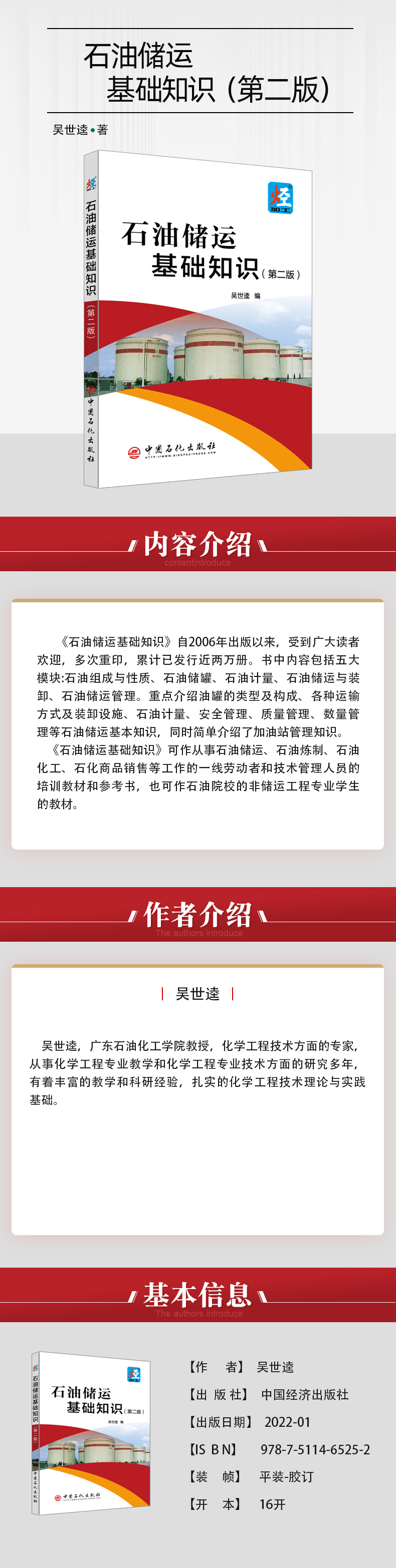 《石油储运基础知识》自2006年出版以来,受到广大读者欢迎,多次重印,累计已发行近两万册。书中内容包括五大模块:石油组成与性质、石油储罐、石油计量、石油储运与装卸、石油储运管理。重点介绍油罐的类型及构成、各种运输方式及装卸设施、石油计量、*管理、质量管理、数量管理等石油储运基本知识,同时简单介绍了加油站管理知识。