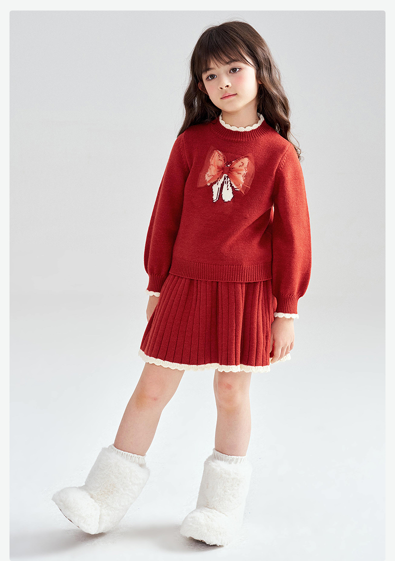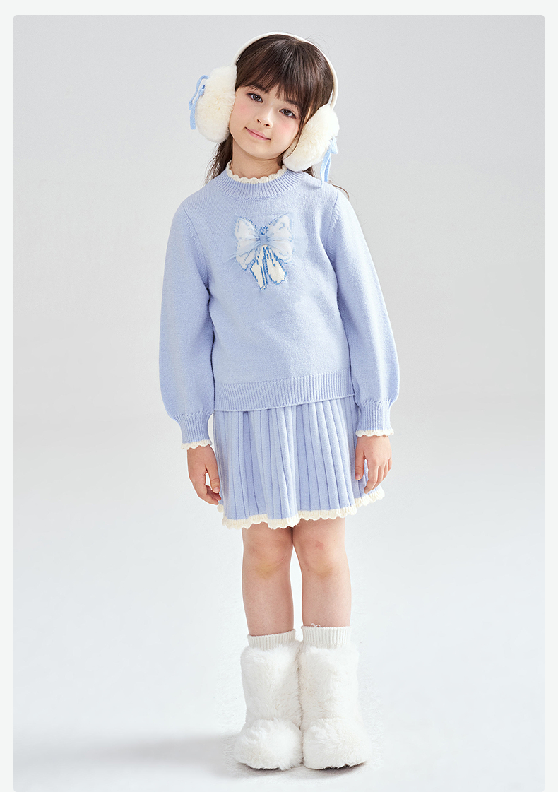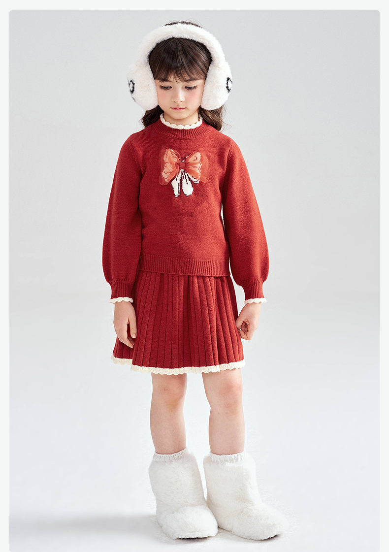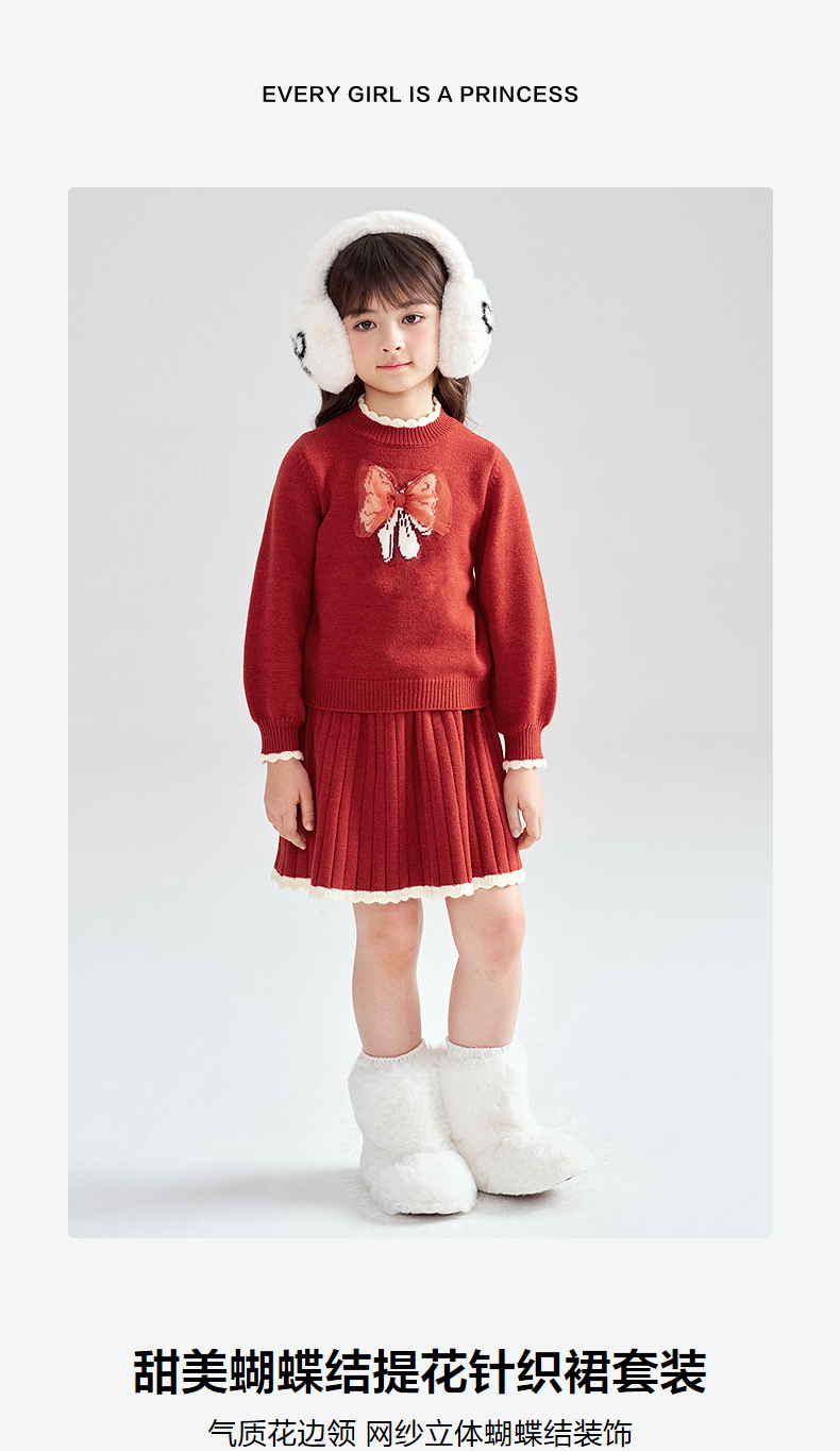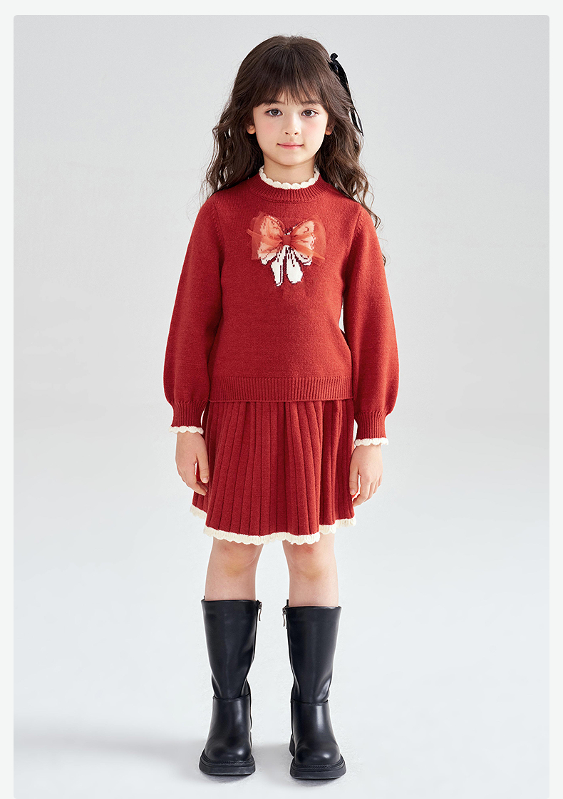 笛莎Deesha 2025冬季女童甜美蝴蝶结提花针织裙套装