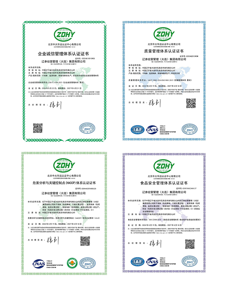 公司全面通过ISO9001质量管理体系、ISO22000食品安全管理体系、危害分析与关键控制点(HACCP)体系、ISO14001环境管理体系、ISO45001职业健康管理体系以及GB/T31950企业诚信管理体系以及有机产品、绿色食品等八大体系认证。