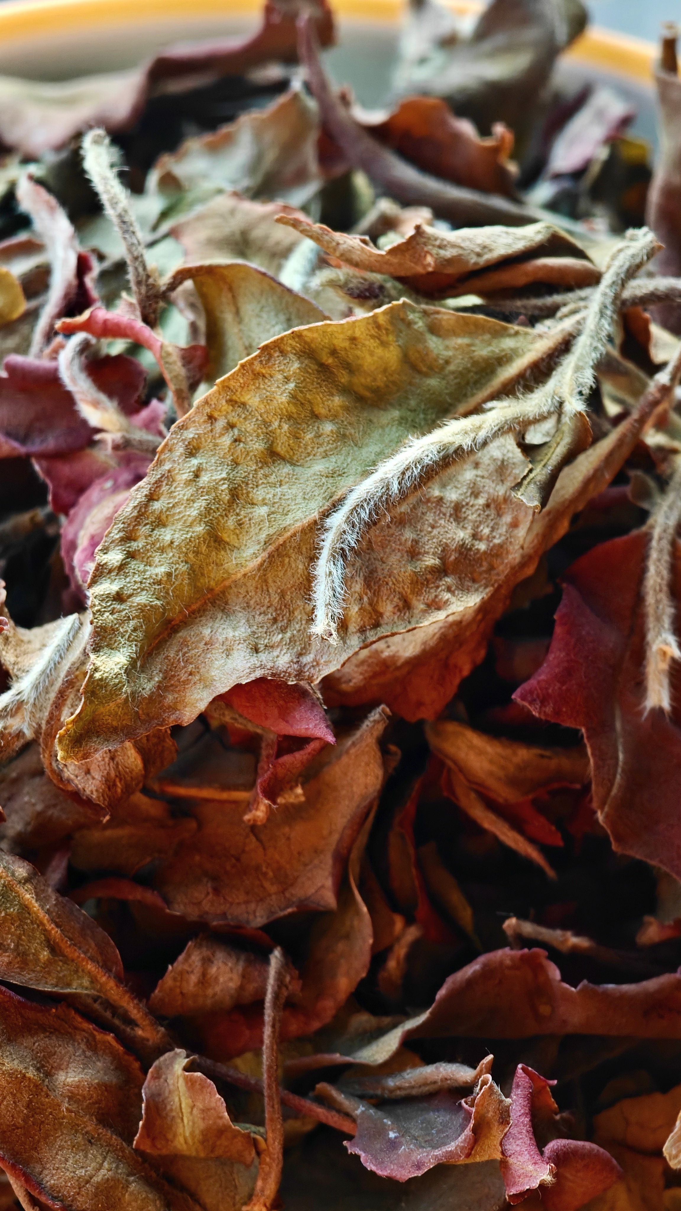 荒野牡丹,生活环境不太好,为了保护自己,它芽头上的白毫,生得比台地的白茶更加浓密,更加的厚实,更加的粗壮。