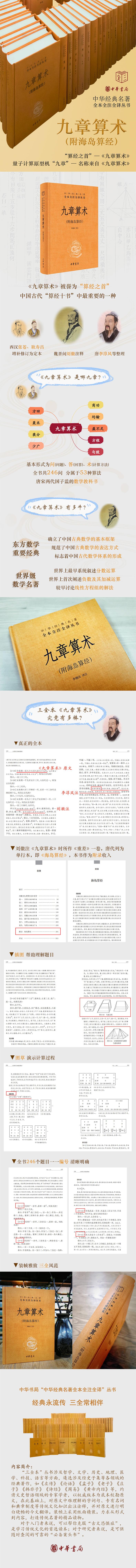 一、《九章算术》被誉为“算经之首”,是中国古代“算经十书”中最为重要的一种。它由西汉张苍、耿寿昌增补修订为定本后,经魏晋间人刘徽注释,唐代李淳风等人整理,而在唐宋两代作为国家高等学府数学教科书使用。它确立了中国古典数学的基本框架,规范了中国古典数学的表达方式,标志着中国古代数学体系的形成。 二、《九章算术》既是东方数学的重要经典,又是一部重量数学名著。它是世界上最早系统叙述分数运算的著作;在世界数学目前首次阐述了负数及其加减运算法则;较早讨论了线性方程组的解法,并使用了矩阵初等变换的方法。《九章算术》不仅流传到日本、朝鲜,其中的一些内容还传播到印度、阿拉伯,甚至欧洲。 三、《九章算术》的内容十分丰富。各章名称分别是:方田、粟米、衰分、少广、商功、均输、盈不足、方程、勾股,代表了中国传统数学的分科。所涉及的内容,涵盖测地学、商业数学、经济数学、工程数学、管理数学、农用数学、布点测量等领域。 四、三全本《九章算术附海岛算经》收入了《九章算术》原文、魏晋间人刘徽的《九章算术注》、唐李淳风等的《九章算术注释》,并将刘徽注释《九章算术》时所作的《重差》一卷(即唐时列为单行本的《海岛算经》)作为附录收入,为读者提供了一个“全”本。 五、《九章算术》作为一本应用问题集,其基本形式是“问(题目)、答(回答)、术(计算方法)”。全书246问,分属于53种算法。为方便读者阅读理解,并清晰、明确地演示其中的算法,“三全本”《九章算术(附海岛算经)》对全部题目进行了编号,体例上不仅包含题解、原文、注释、译文,而且根据需要配有插图和图草(演示计算过程)。 2020年4月,《九章算术》列入《教育部基础教育课程教材发展中心 中小学生阅读指导目录(2020年版)》初中段。 2020年12月,中国科学技术大学宣布成功构建了量子计算原型机,它的名字“九章”正是来源于《九章算术》。 【内容简介】