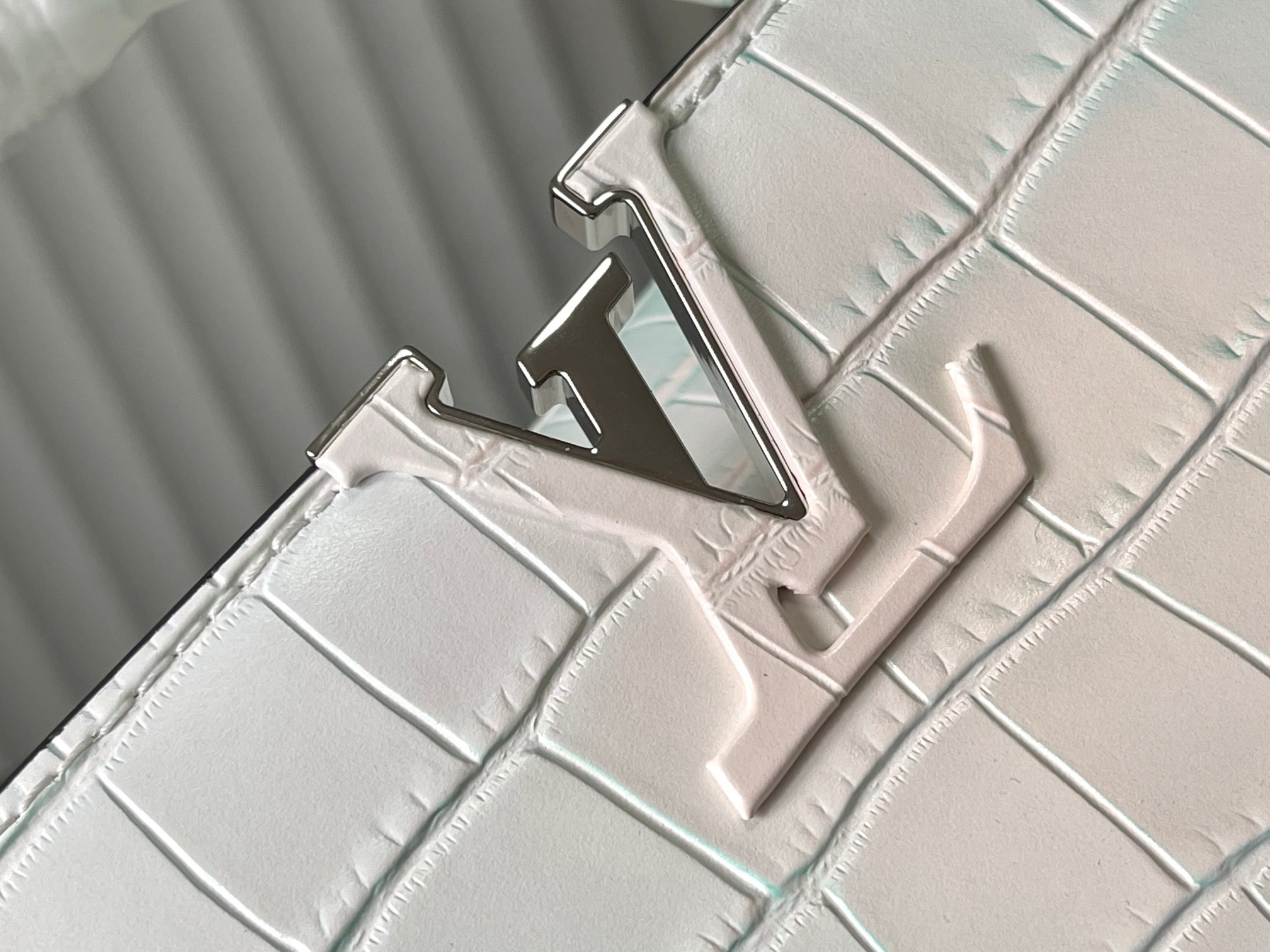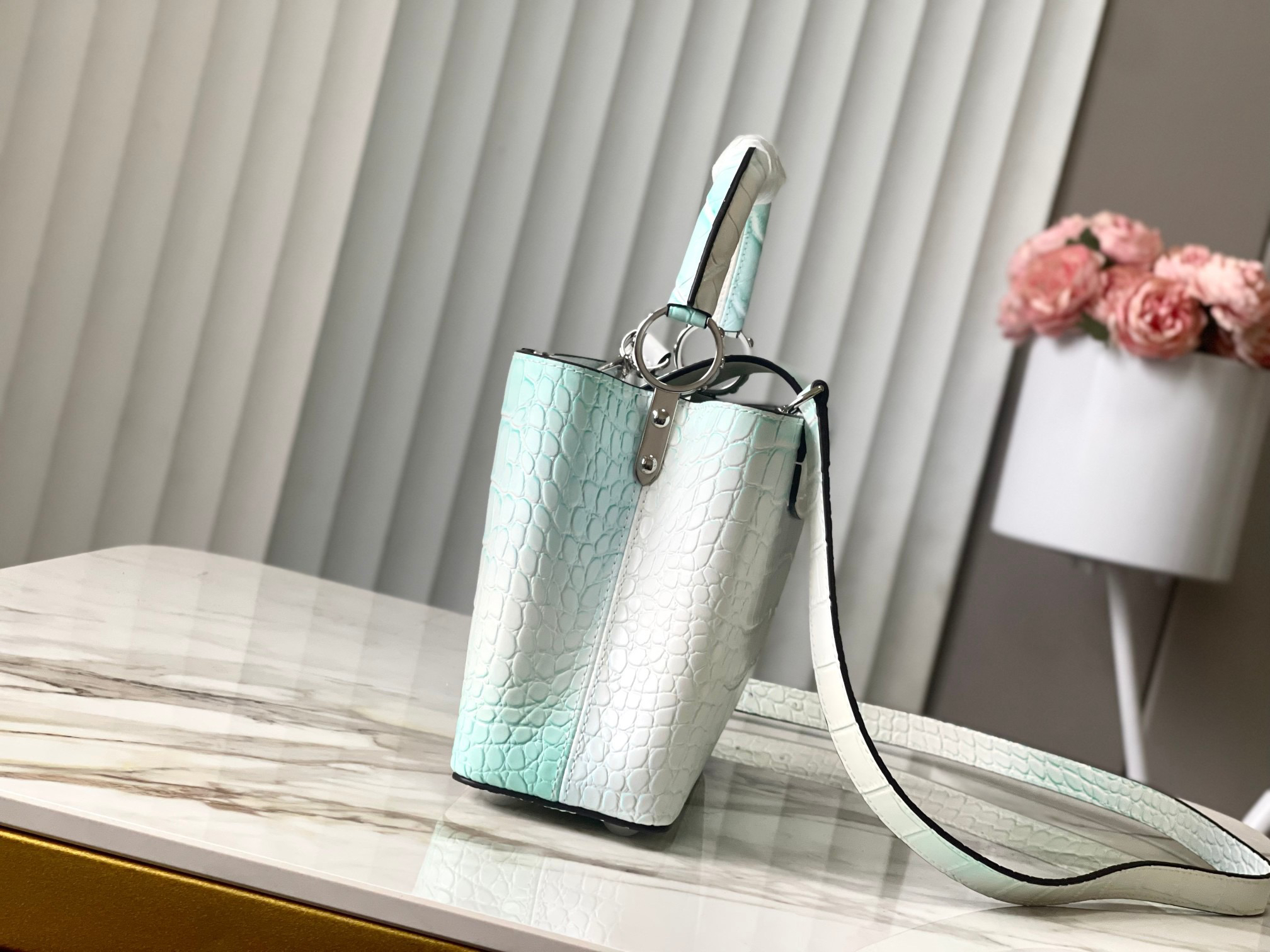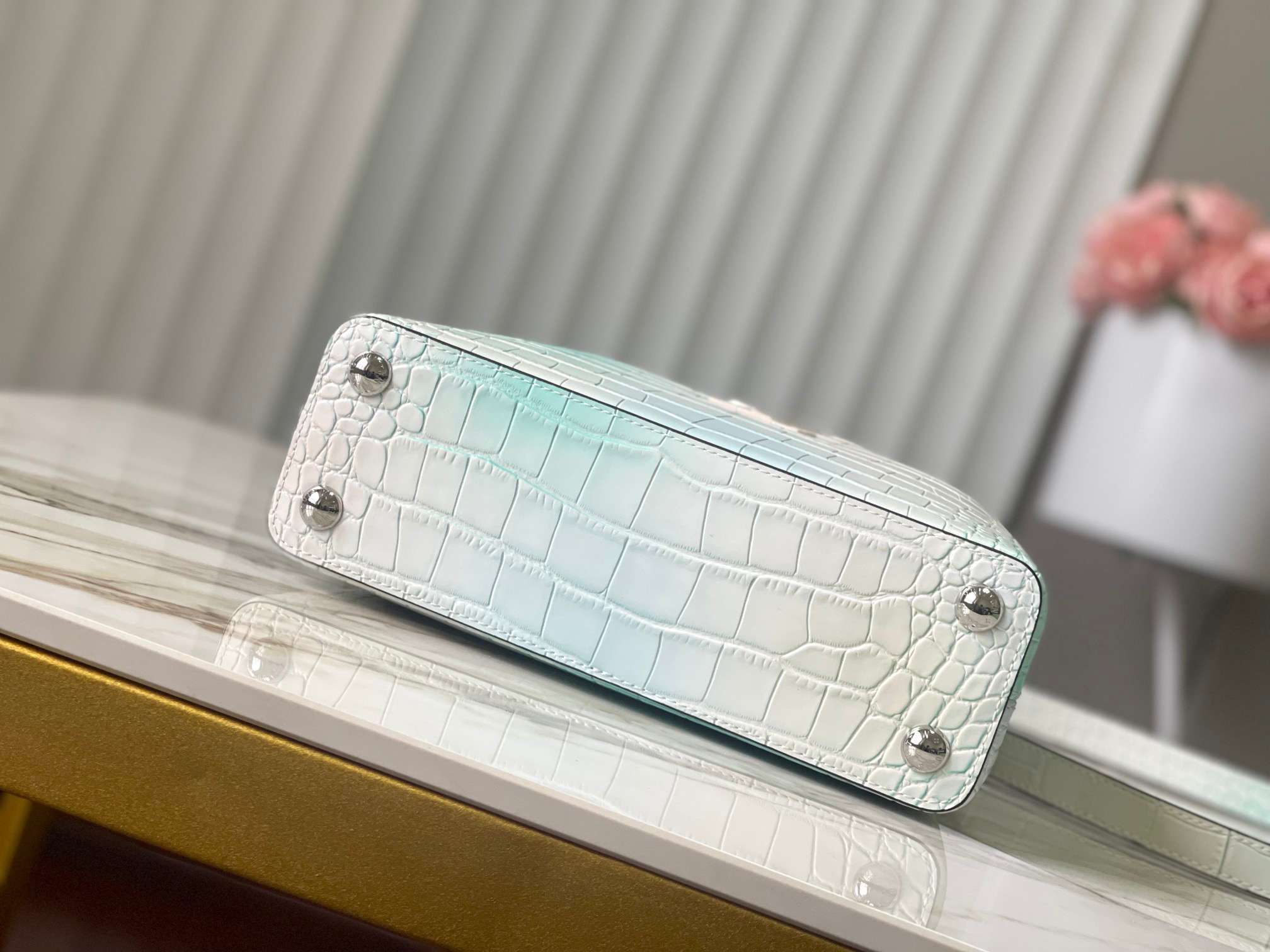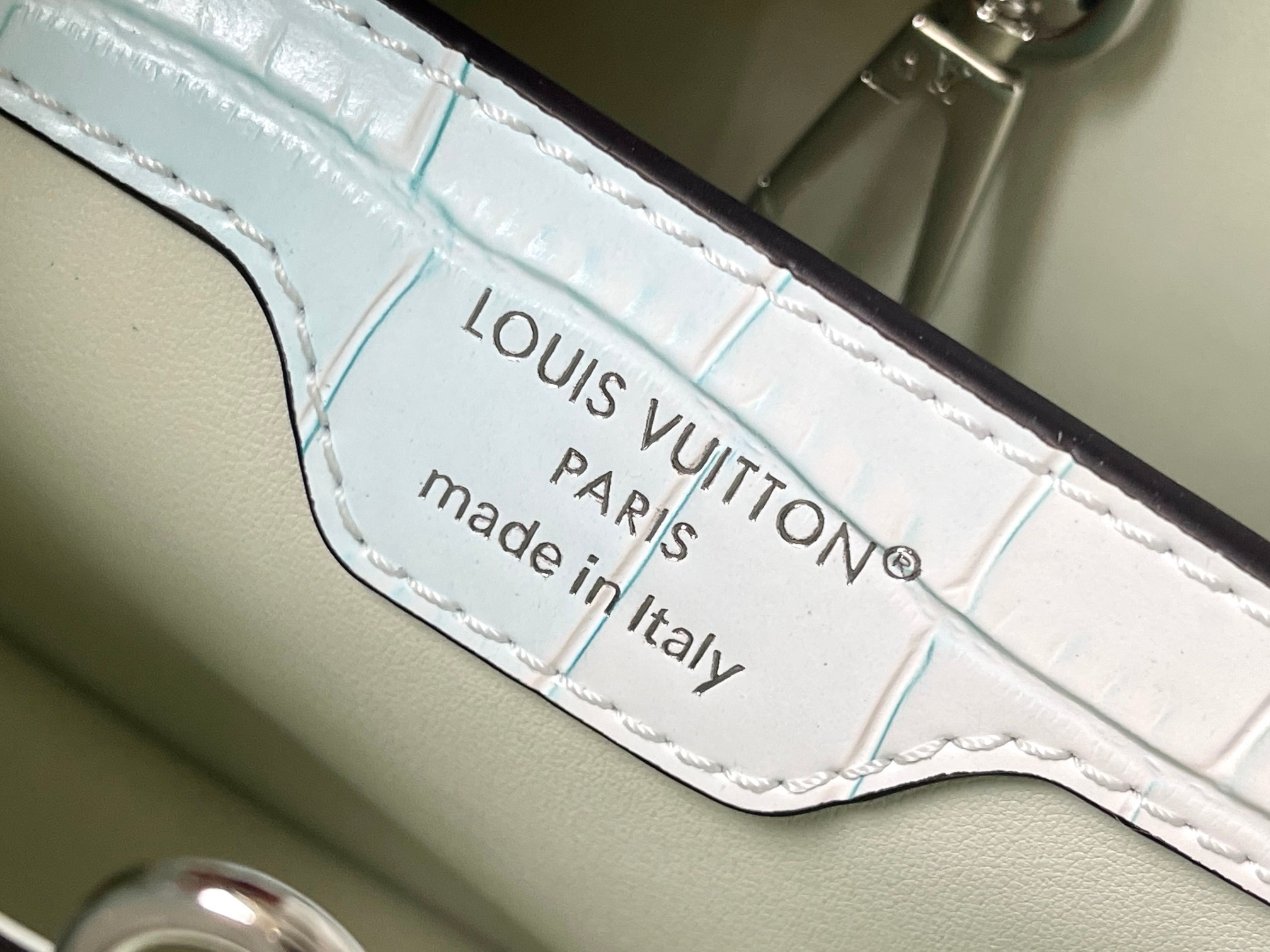 秋冬特惠💰1530 渠道级LV 新品🔸te级LV精品🔸N93163/M48865白拼绿鳄鱼纹🌟此款珍贵的Capucines手袋由鳄鱼皮纹 经上高光处理 闪耀迷人 奢华的山羊皮衬里与闪闪发光的金属饰件 特有的Capucines搭盖既可收入包内 展示字母标识 又可外翻 呈现Monogram Flower图案 出行的理想配饰 Size: 27*18*9CM
