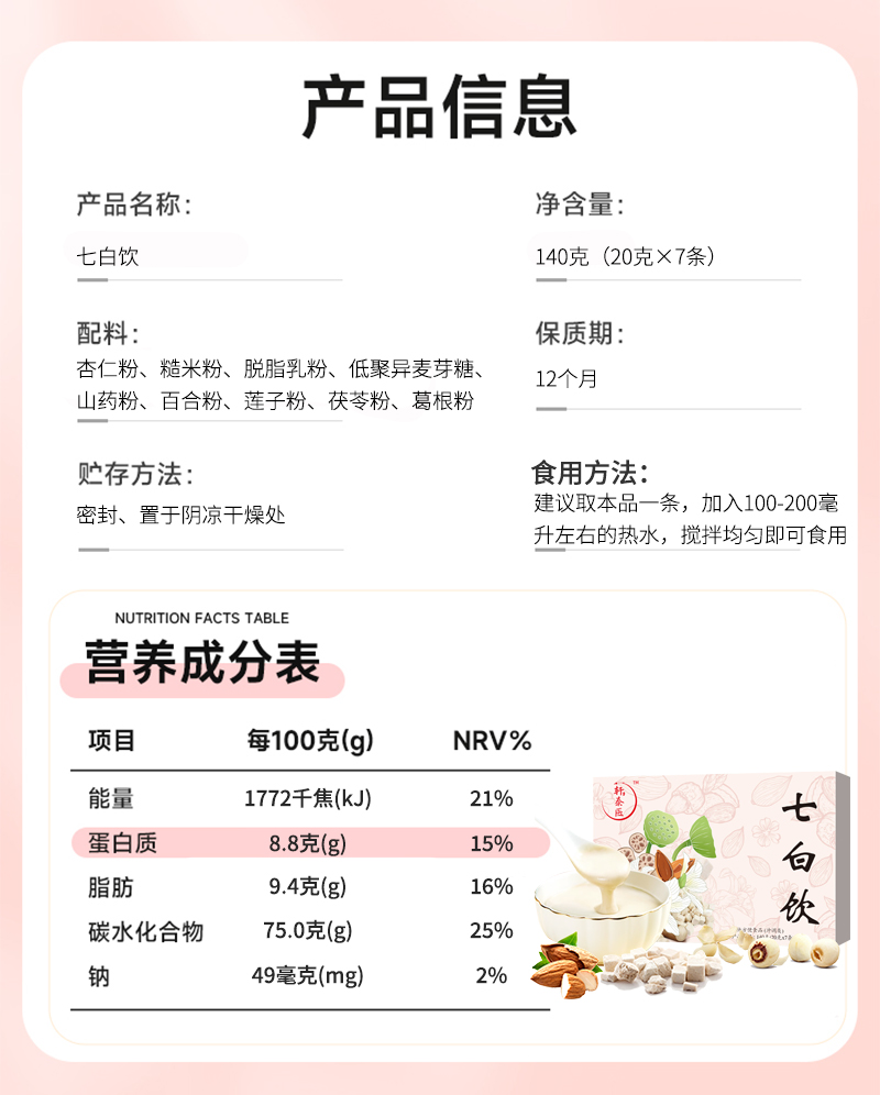 七白饮 选料上乘 地道药食同源不脱油不脱脂 140g/盒(20g*7条)