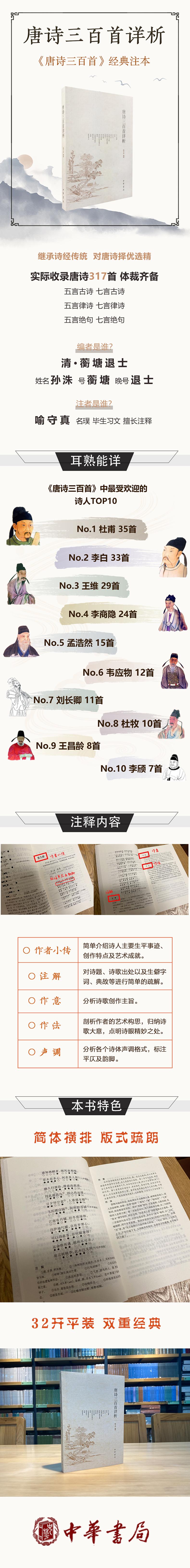 本书按乐府、五言古诗、七言古诗、五言律诗、七言律诗、五言绝句、七言绝句诸类编选。作者小传简要介绍有关诗人的生平 经历和艺术成就。“注释”侧重典故和生僻语词的疏解。“作意”。是对作品中心题旨的分析,言简意赅,要言不烦。“作法”则从技 法的角度,具体分析作品起承转合的逻辑关系和诗眼的精彩之处。五言古诗、七言古诗、五言律诗、七言律诗、五言绝句、七言绝 句诸类的第一首作品还附有“声调”,通过个案分析,介绍这些诗体有关声调的一般规则,详明易懂。