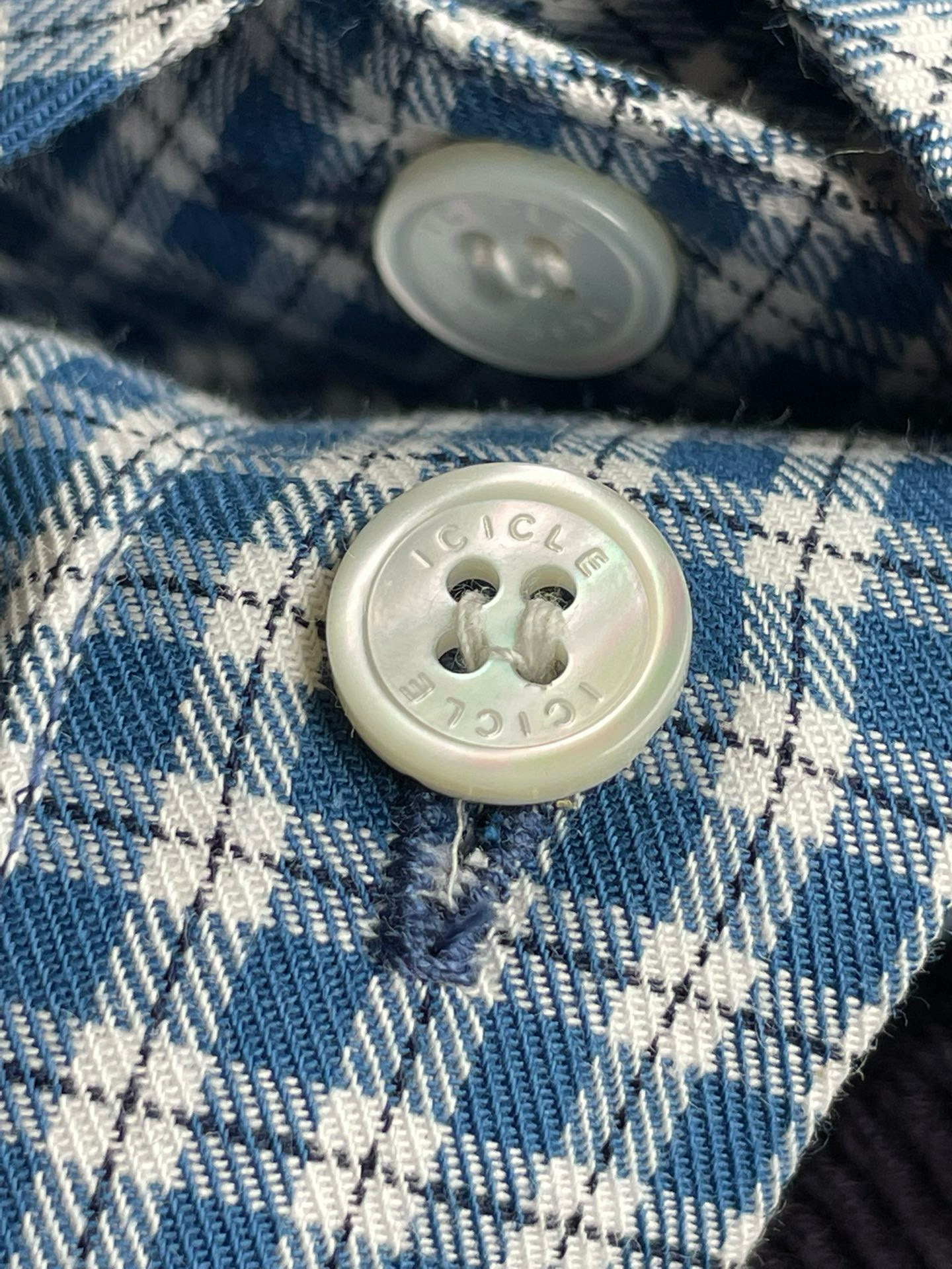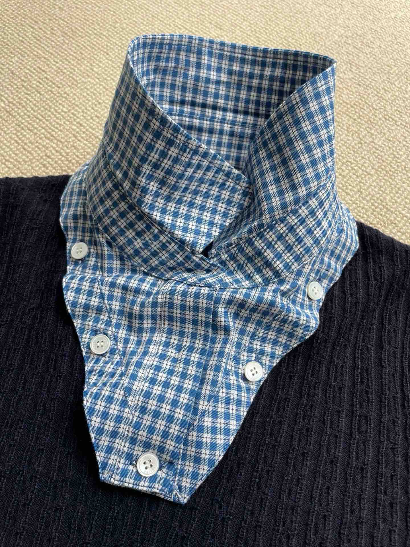 两款衣服的领子,都可以拆卸下来。小领子呢,还不是一个造型,所有的纽扣全部手缝,以避免翻面露针脚,全部客供贝壳扣,带logo的贝壳扣,一个萝卜一个坑,外面那些个同款,只能是同款而已。