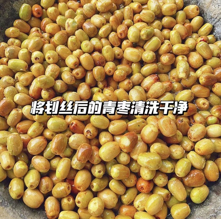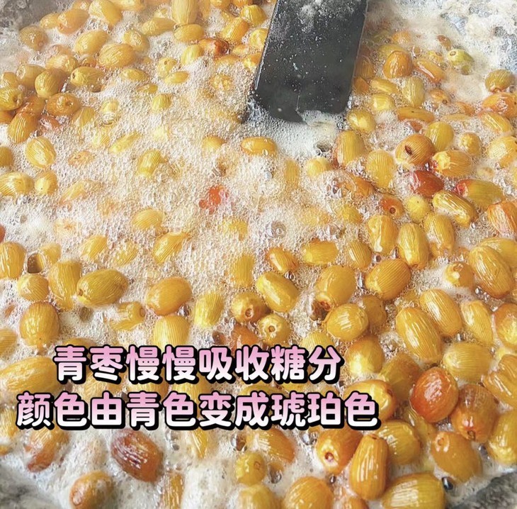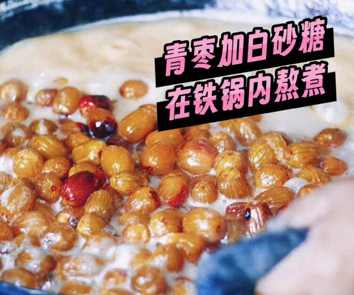 加入白糖,用旺火熬煮,青枣在铁锅内与白砂糖、水充分融合,慢慢吸足了糖分,颜色也由青绿色渐渐变成琥珀色,保持天然枣香。