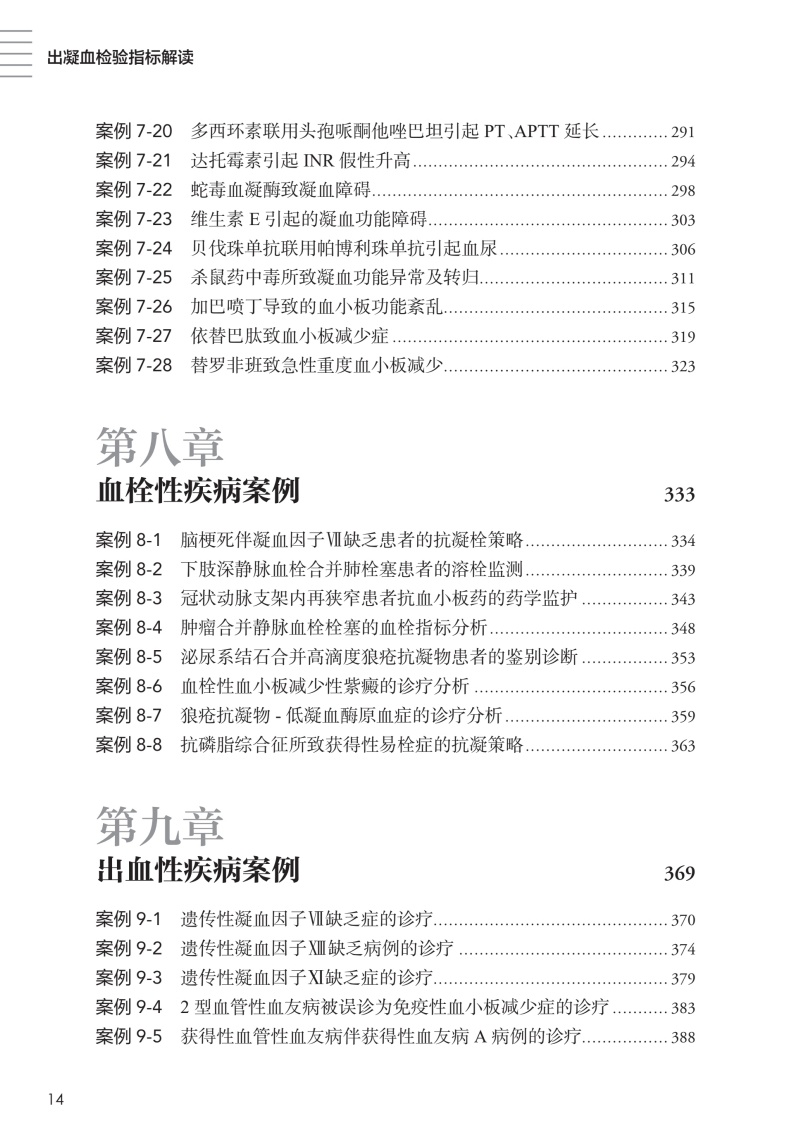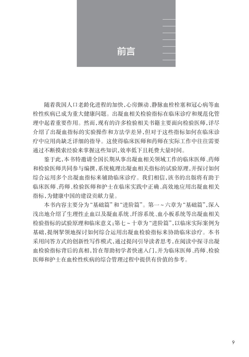本书内容主要分为基础篇和进阶篇,基础篇深入浅出地介绍生理性止血,以及内皮、血小板、凝血和纤溶等出凝血相关检验指标的试验原理和临床意义,进阶篇则以疾病(包括血栓性疾病、出血性疾病、血小板异常、DIC、药物引起的指标异常等)为基础,提纲挈领地探讨如何综合运用出凝血检验指标来协助临床诊疗。本书的撰写以案例导入,提出问题,对问题进行循证解答,引导读者思考,系统梳理出如何综合利用出凝血指标来协助临床诊疗。有鉴于此,本书邀请了全国长期从事于一线临床工作的医师、临床药师一同参与编撰,系统梳理出凝血相关指标的试验原理,以及如何综合运用多个出凝血指标来协助临床诊疗。