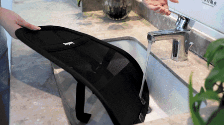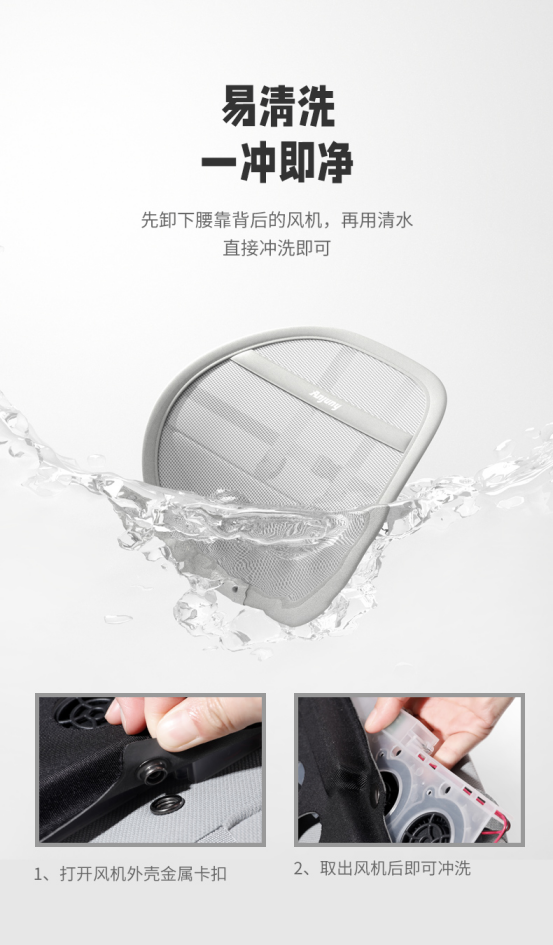 清洗起来也很方便! 腰靠后背设有按扣,只需轻轻一按,就能将风扇装置拆卸出来。