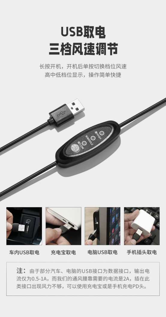 贴心的USB取电设置,多场景适用,更有三挡风速调节,更好的满足使用者的需求