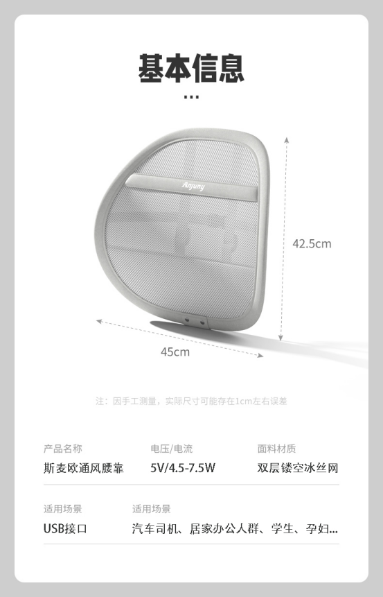 确认过眼神,和自然风吹动的风速相似,让人沉浸式体验风吹麦浪的惬意瞬间! 斯麦欧通风腰靠的材质还选用——双层镂空冰丝网~