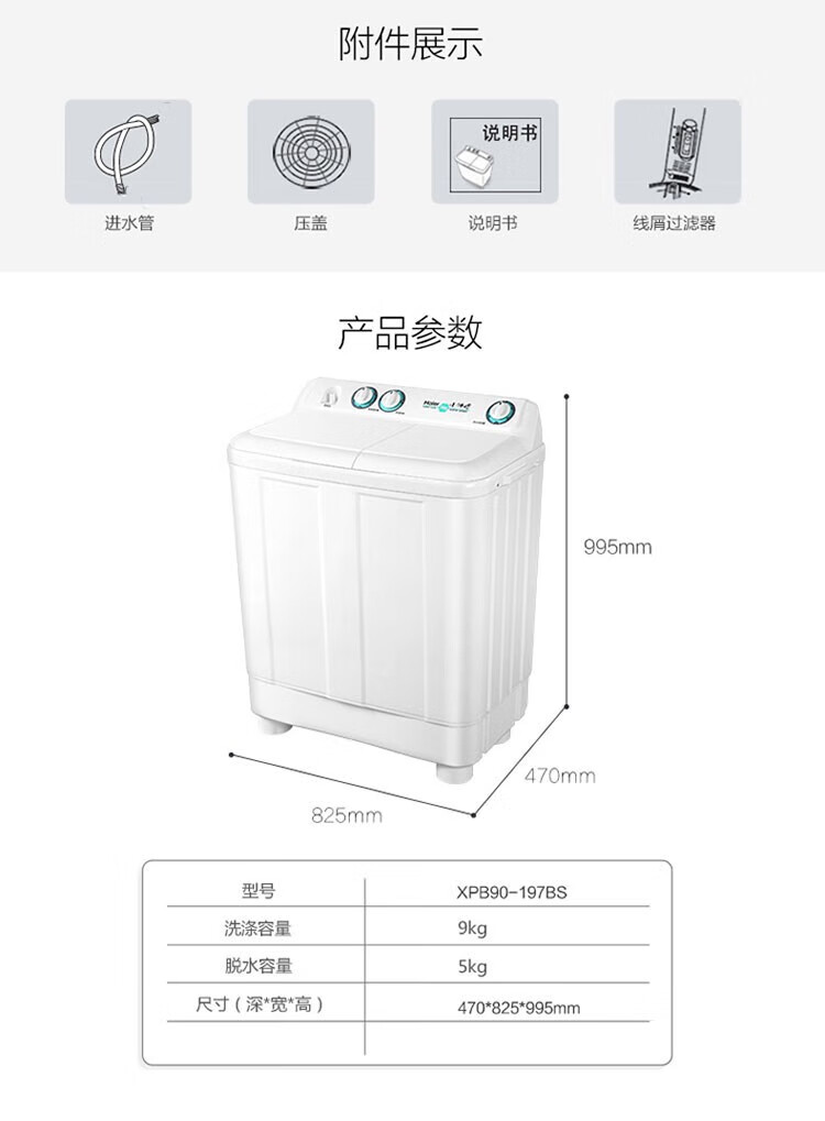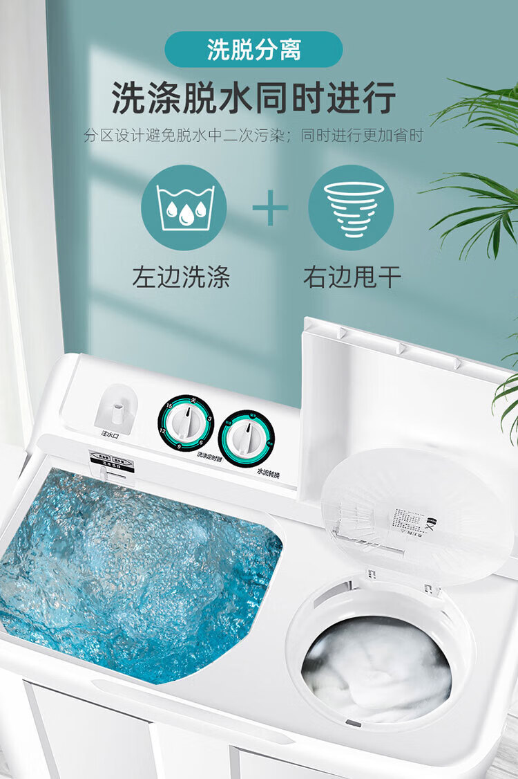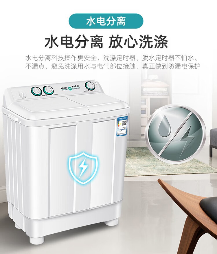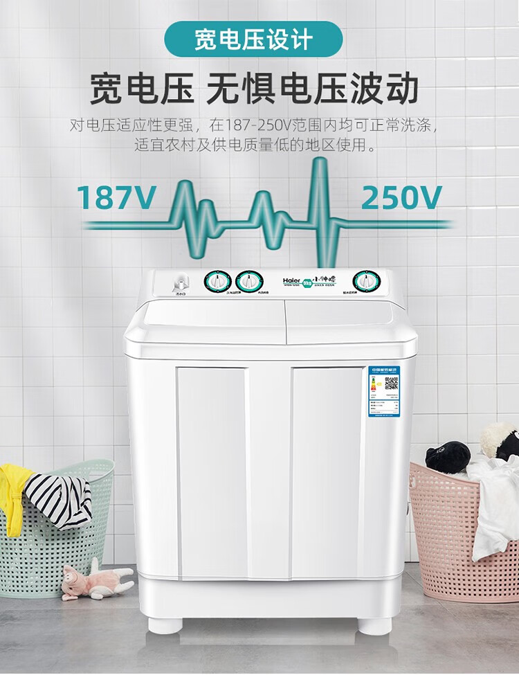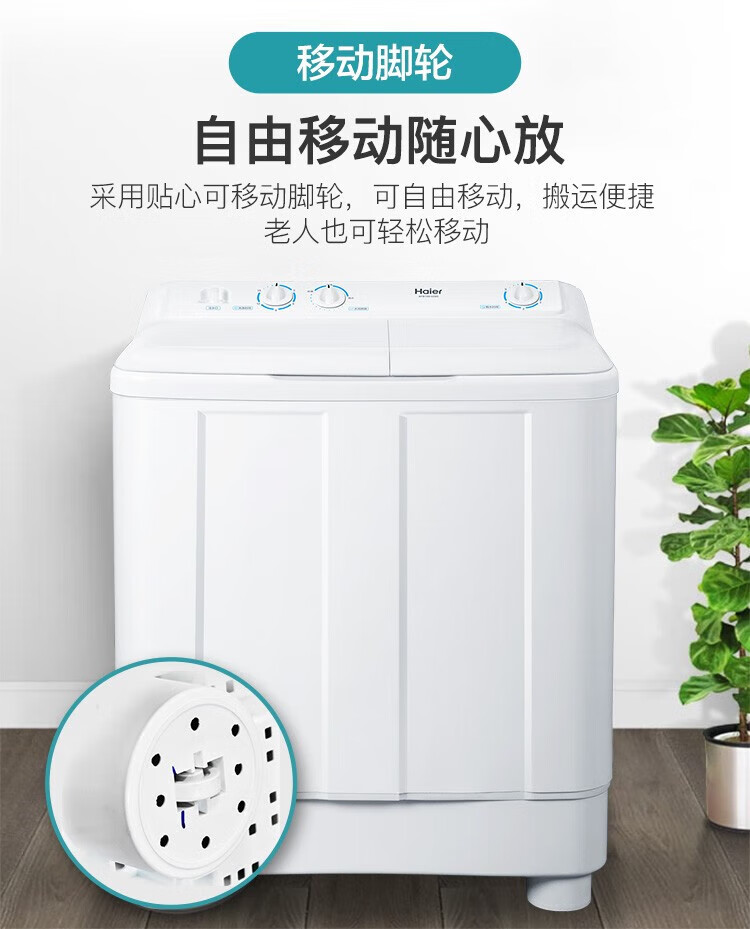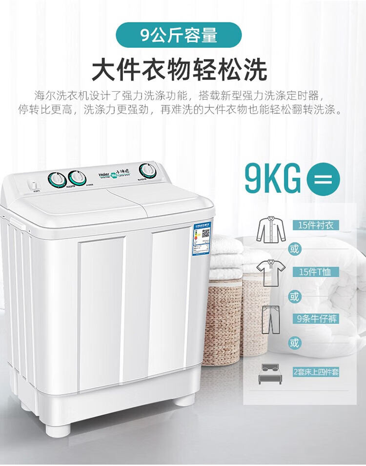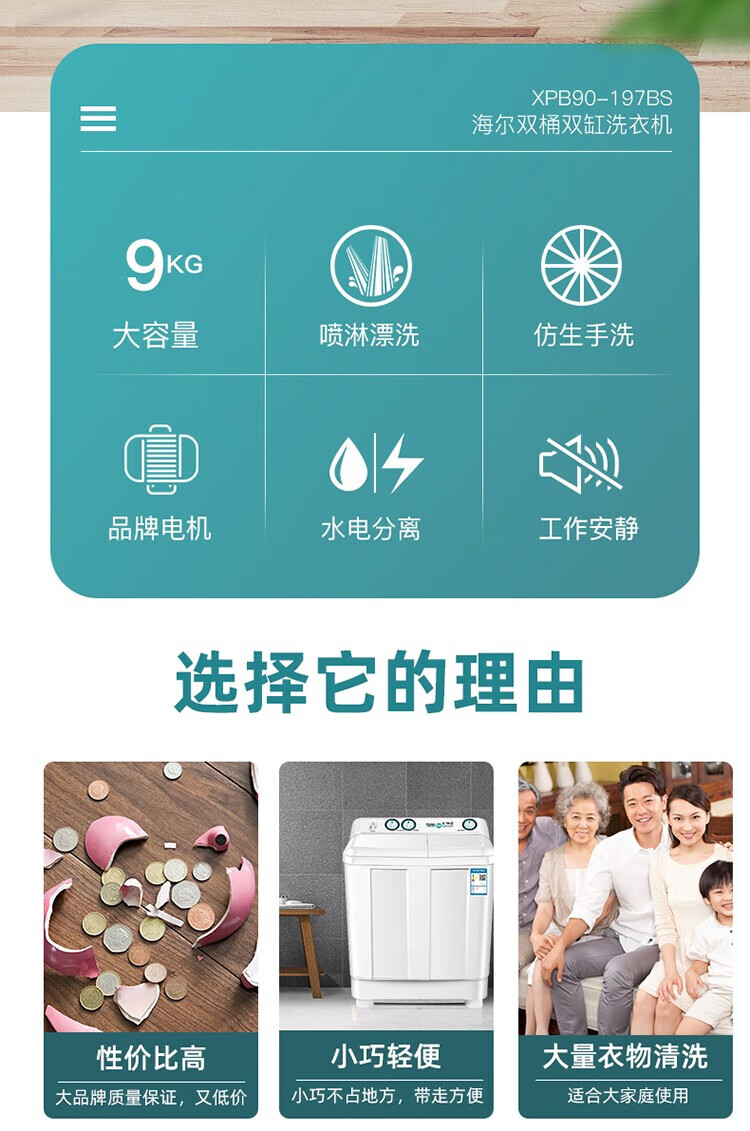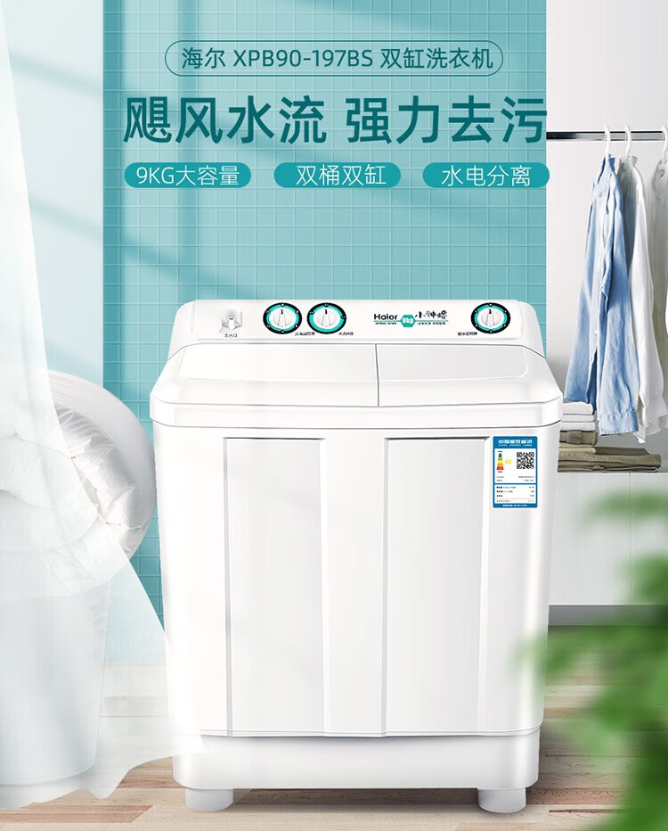 海尔(Haier)9公斤洗衣机半自动大容量强劲动力家用双缸双桶 双电机脱水甩干 老式双筒波轮水电分离197BS 【白色盖板】9公斤卓越型197BS