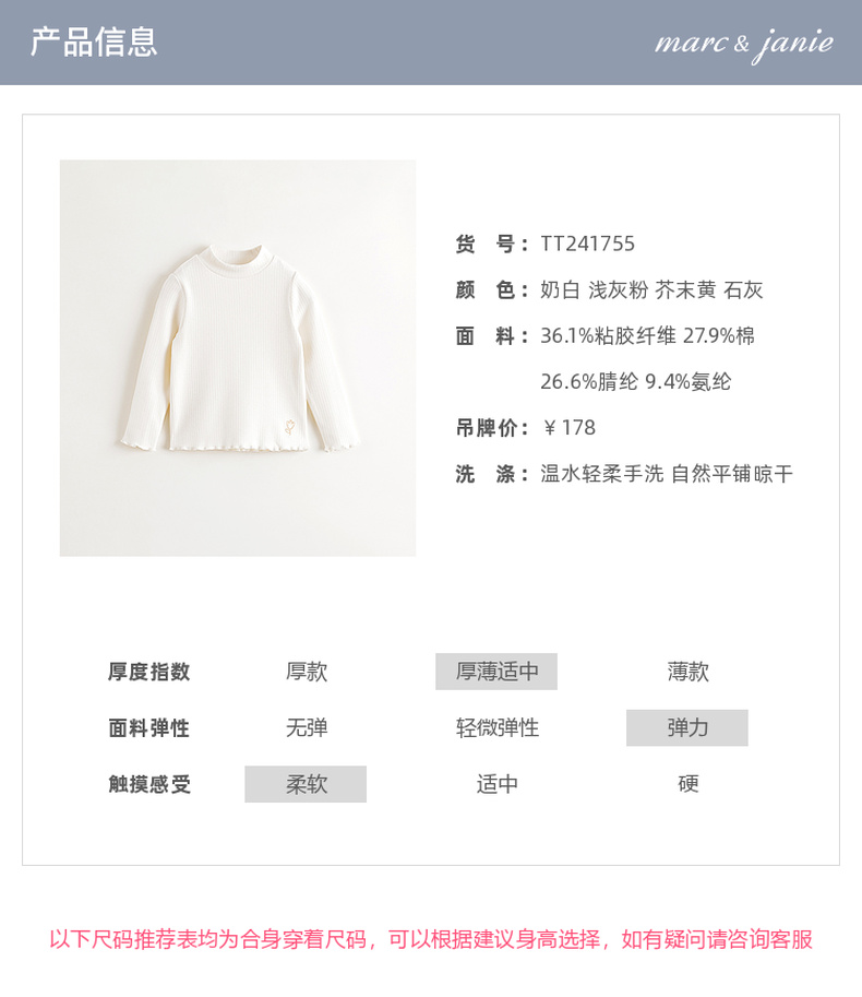 [科技发热]马克珍妮女童半高领打底衫儿童T恤2024秋冬新款241755