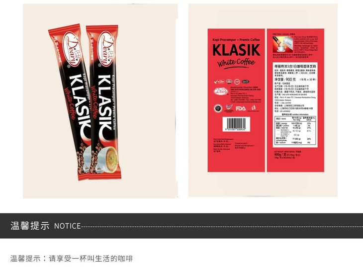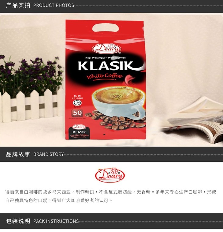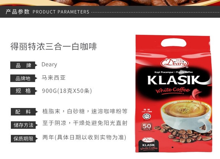 DEARY/得丽 马来西亚进口特浓3合1白咖啡速溶咖啡粉 条装 900G有票JPY带授权招加盟代理