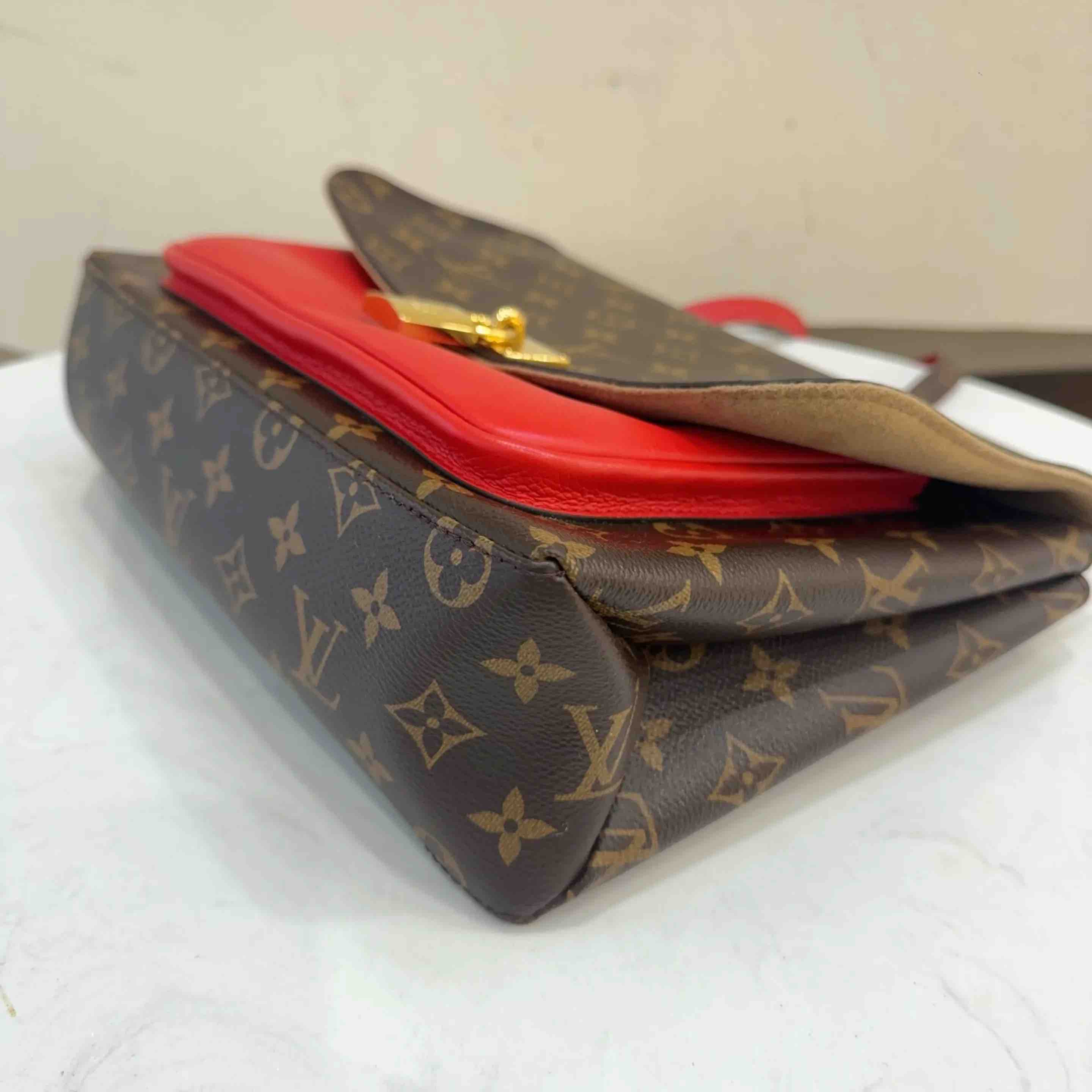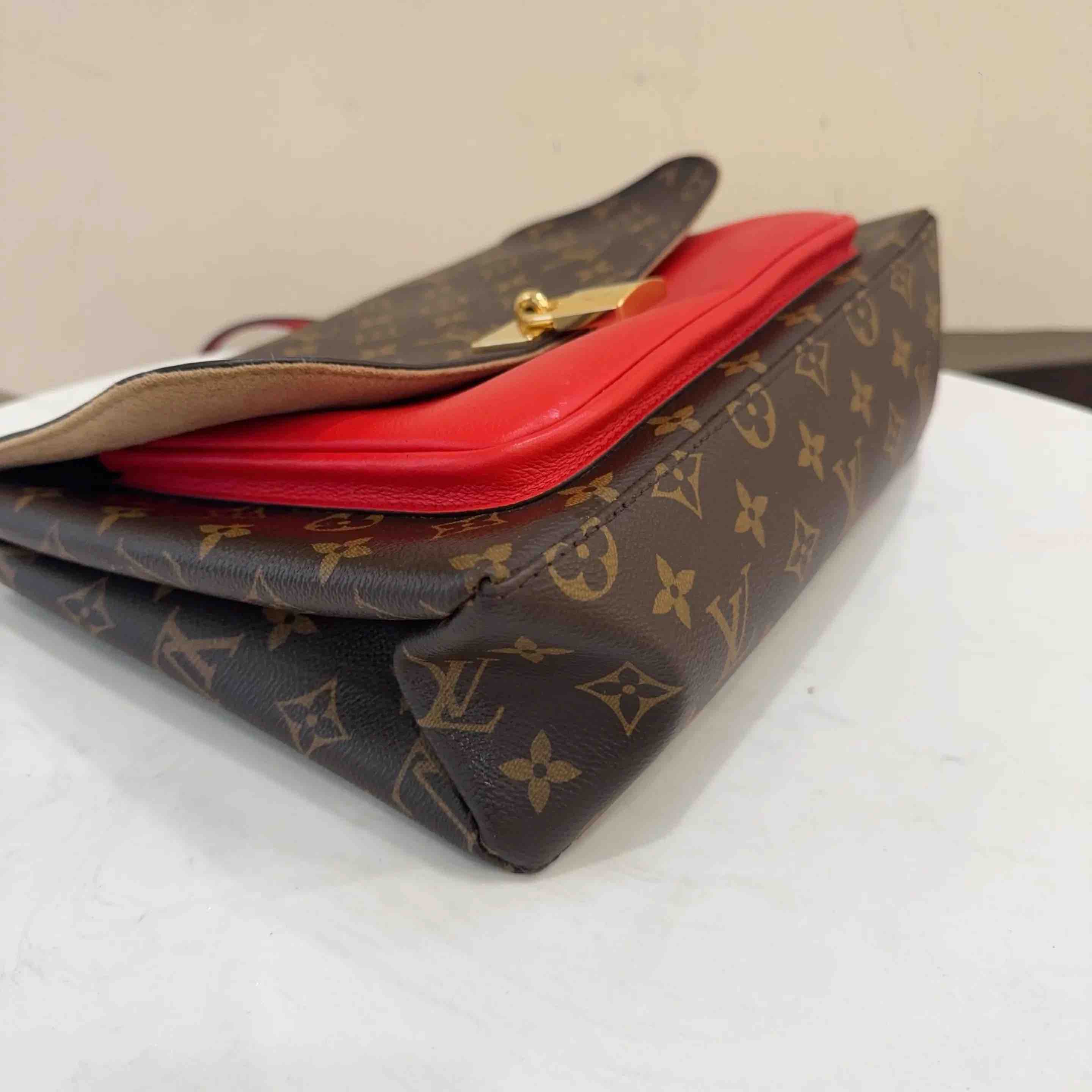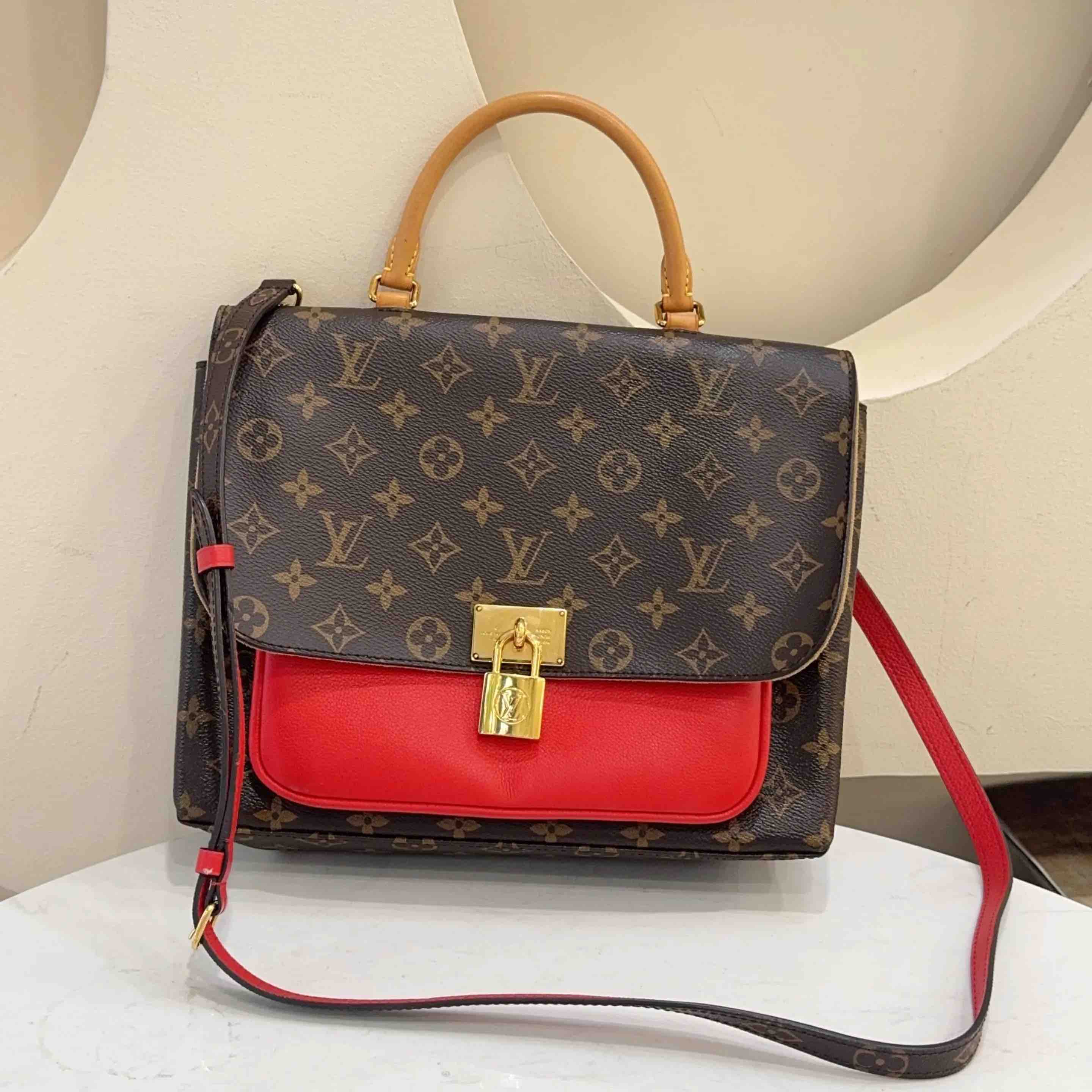 【商品详情】正品二手 LV Marignan 老花拼红 锁头 邮差包 👀 95新 28x22 配件:肩带。金属正常使用感。 情人节限定