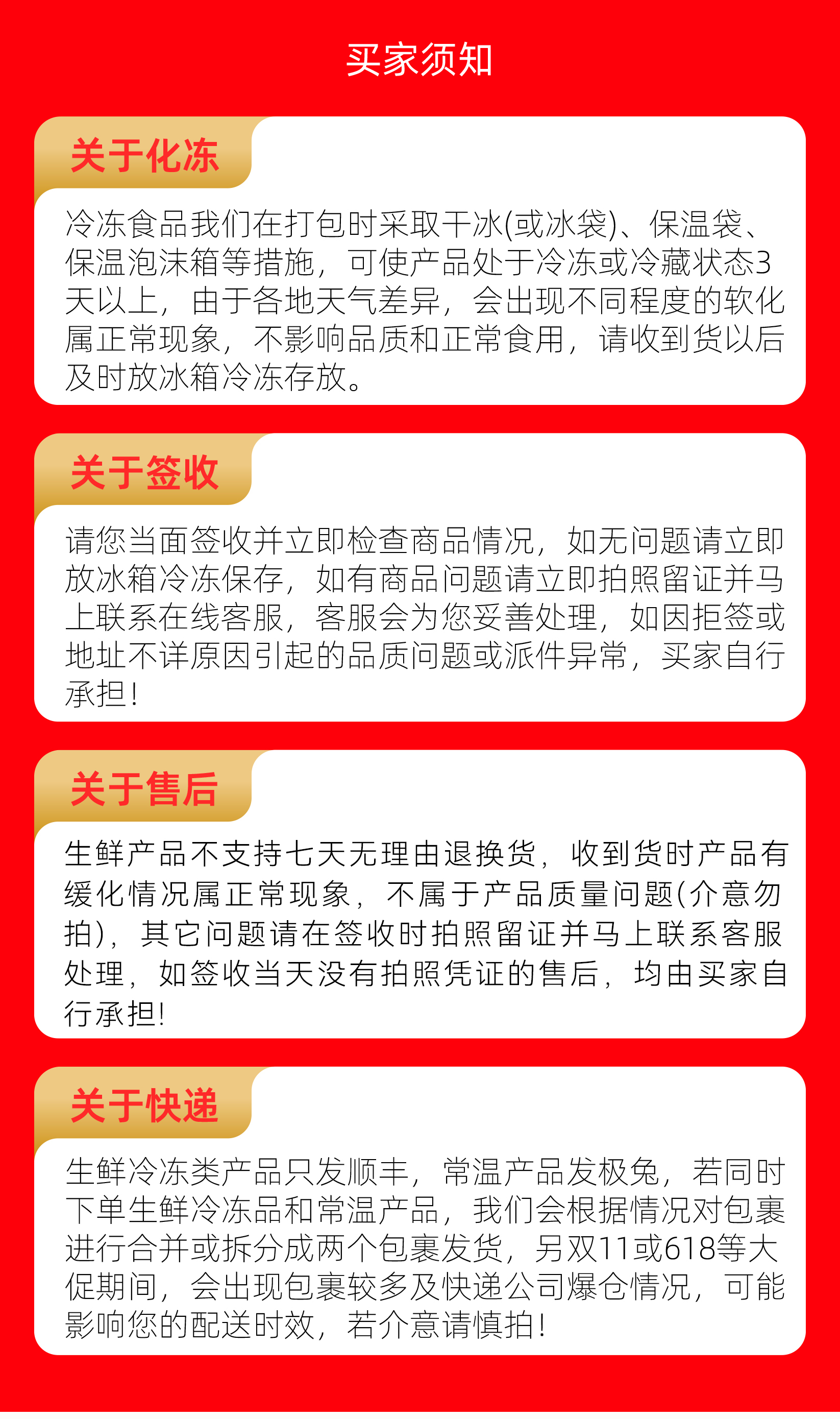 | 7、退货换政策:退货换政策:发货中途不支持拦截、拒收。食品不支持退换货,如有问题请在签收当天拍照联系客服反馈。冻品需放入冷冻保存,如因消费者个人原因导致的产品出现问题由消费者本人承担。感谢配合。 |