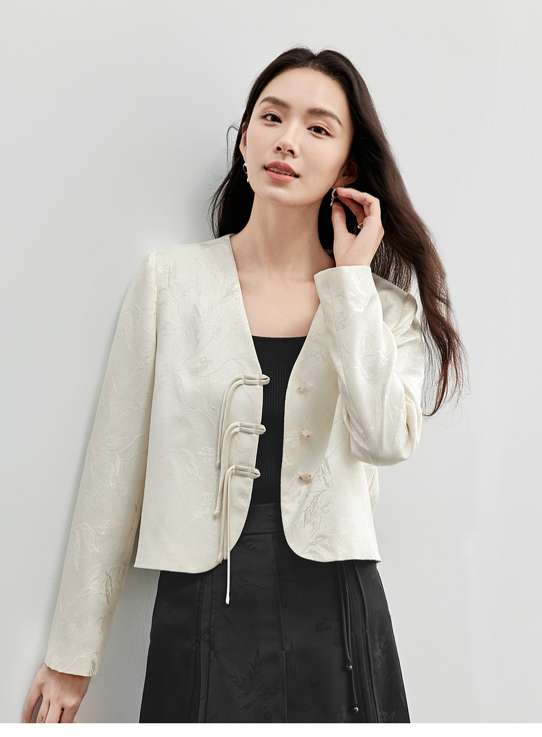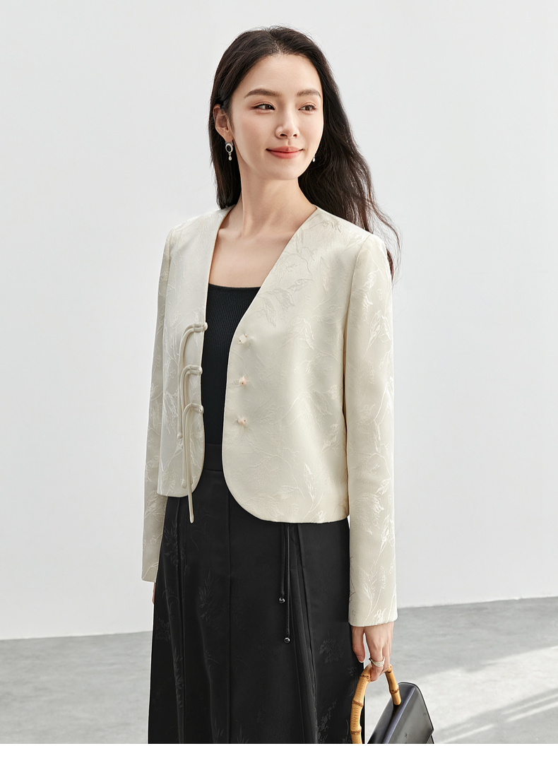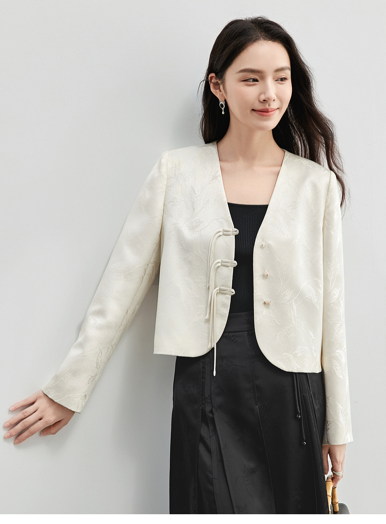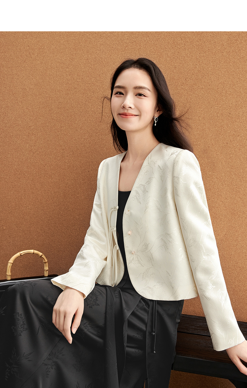 【内购】国风新中式树叶提花肌理流苏盘扣V领带肩垫小香风外套-151W56167