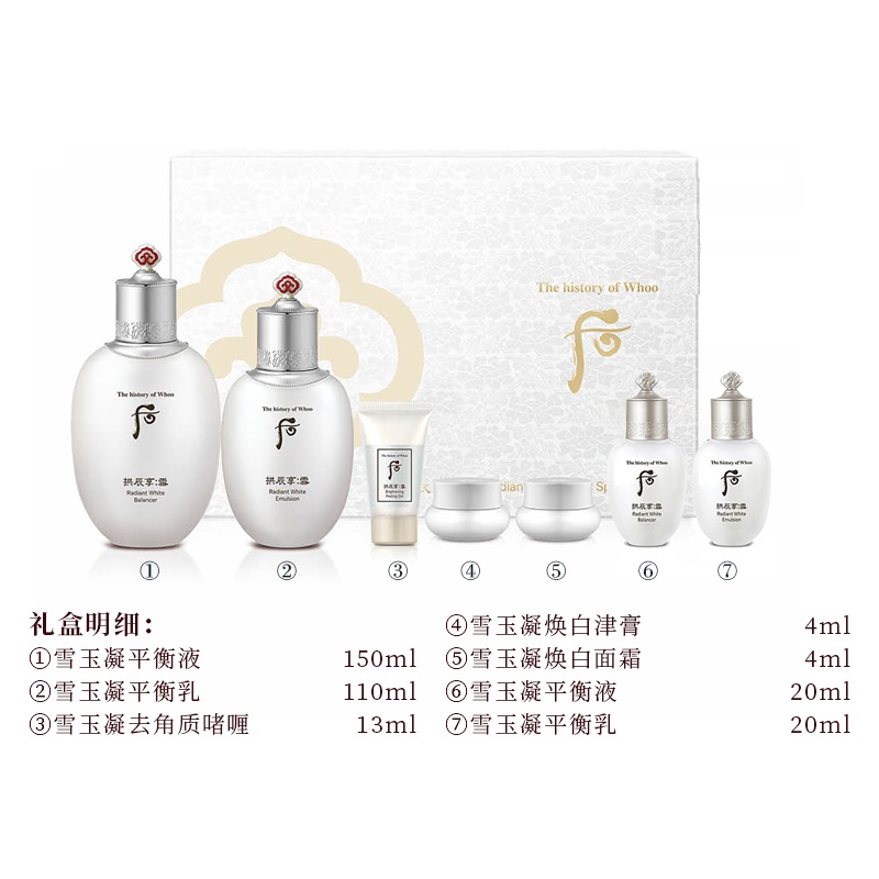 水150ml+乳110ml+水中样20ml+乳中样20ml+水分面霜中样4ml+美白津膏霜中样4ml+去角质中样13ml/套