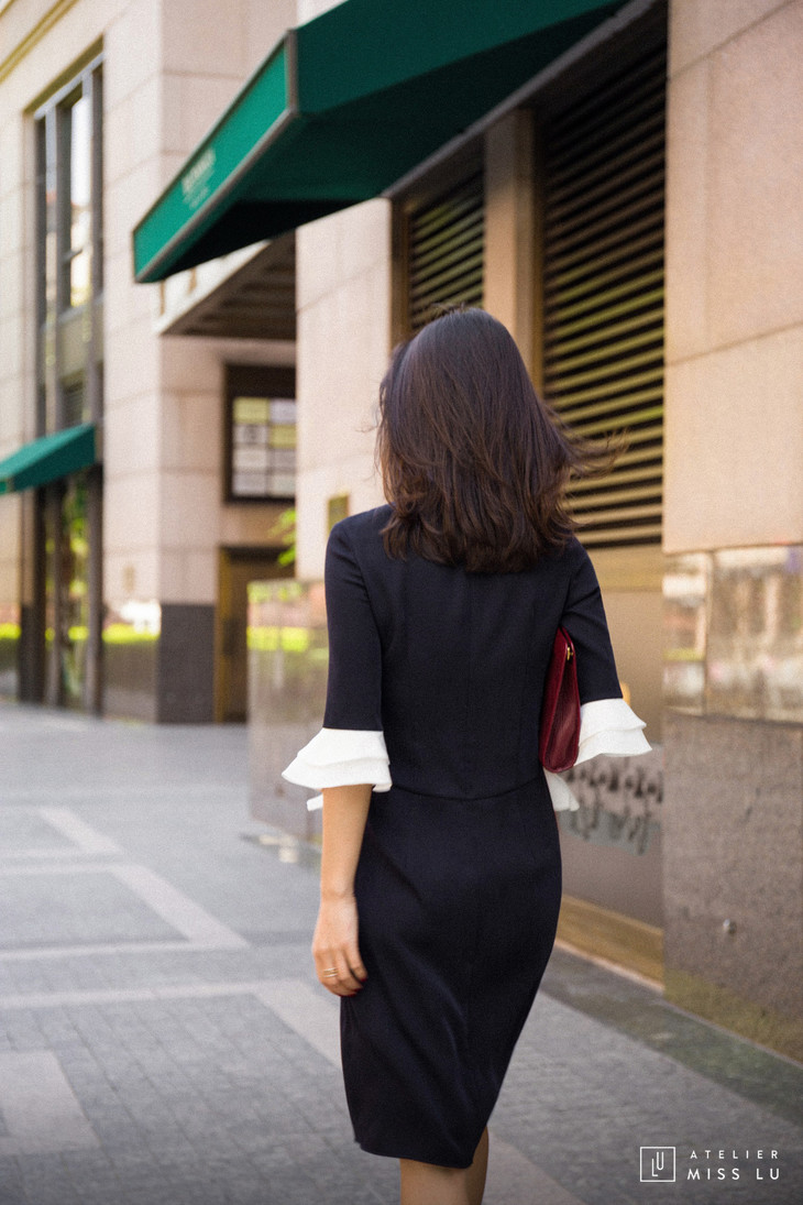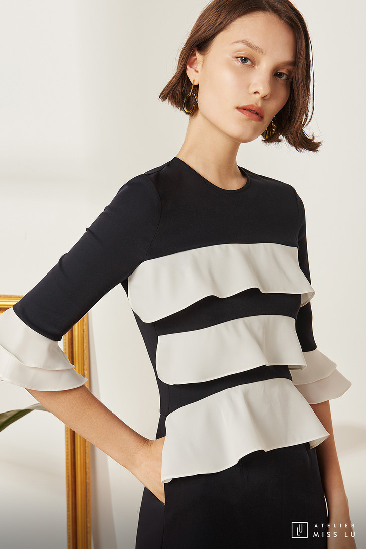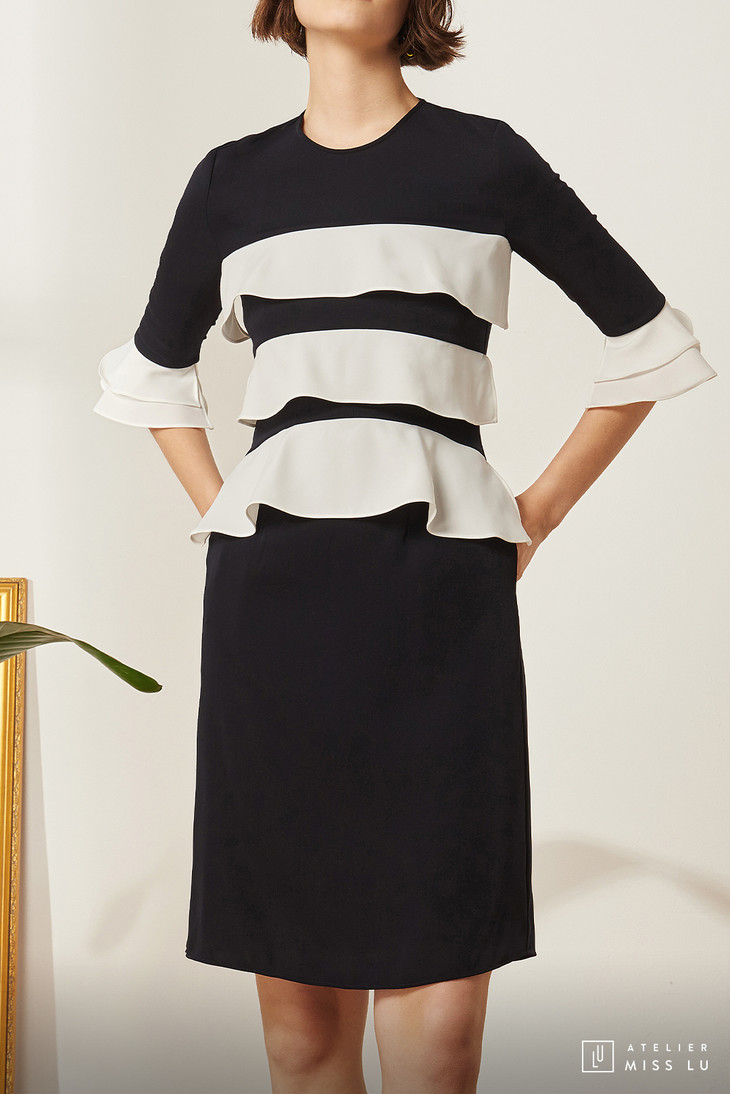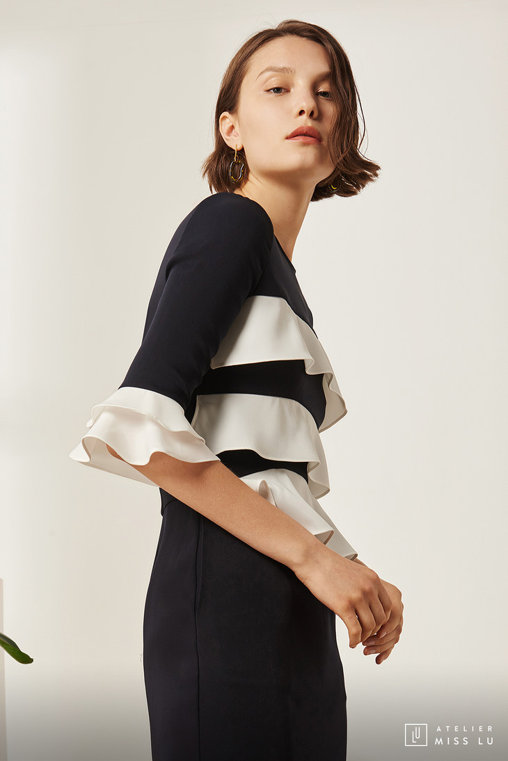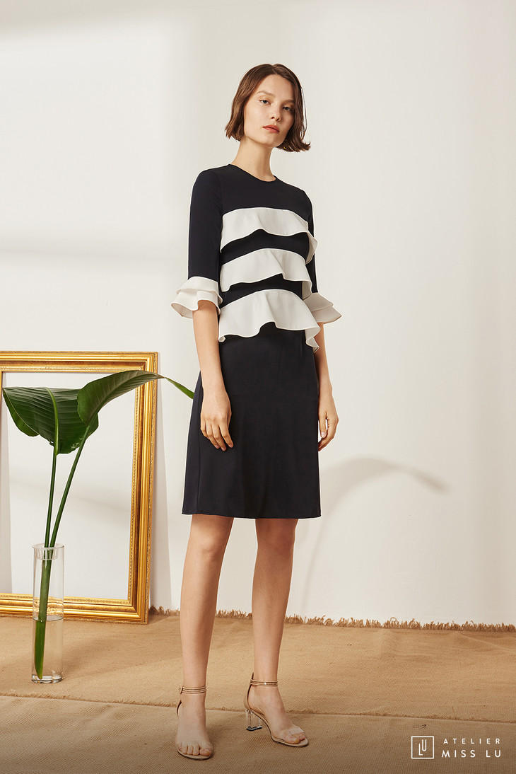 AtelierMissLu / Liz-藏青拼色荷叶边装饰连身裙