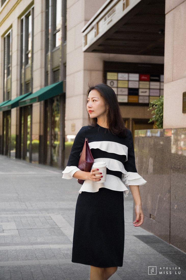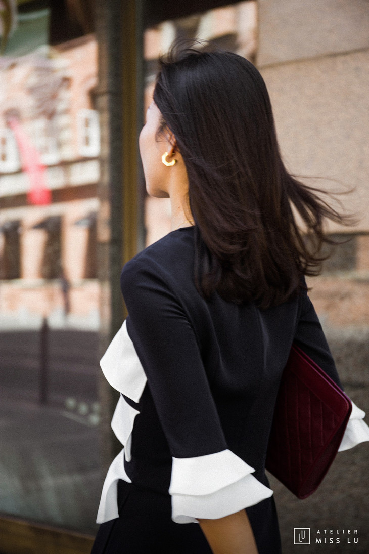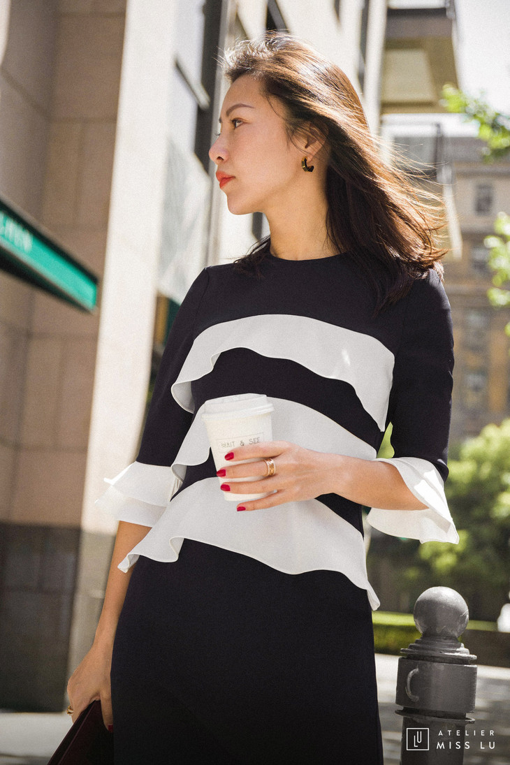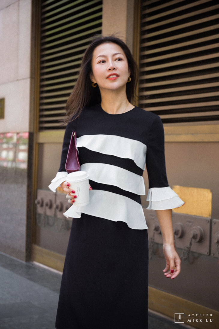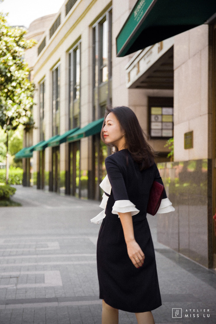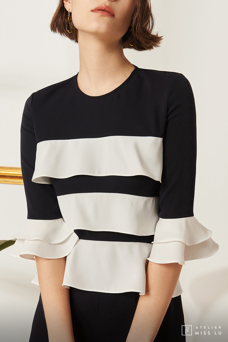 AtelierMissLu / Liz-藏青拼色荷叶边装饰连身裙