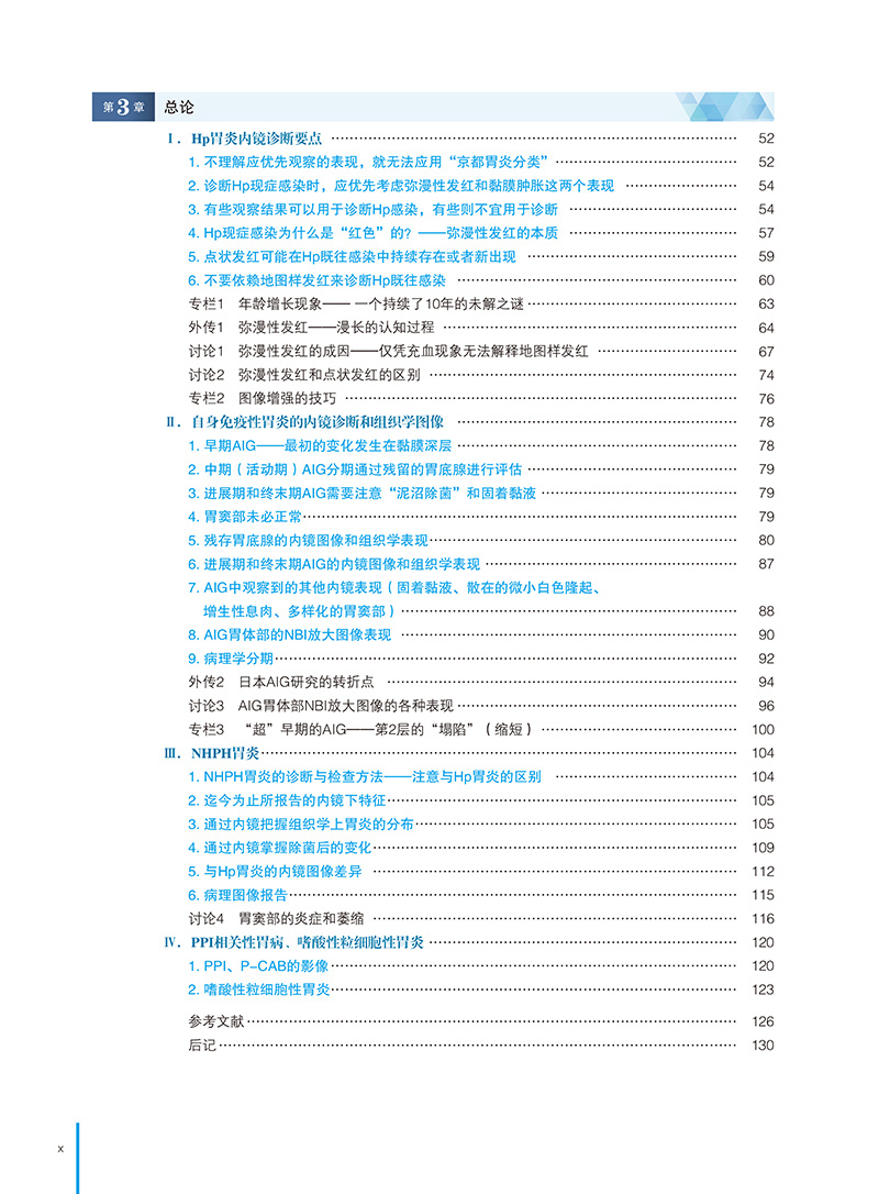 在本书中,专注于讨论那些常见的误区,并采用问答形式进行了深入的分析。对于自身免疫性胃炎和非幽门螺杆菌胃炎(NHPH)等新出现疾病,作者不仅将其纳入讨论,还特别强调了要提供全面的概述,以帮助读者获得清晰的认识。本书的另一显著亮点在于内镜技术与病理学的深度融合。九嶋亮治教授作为病理审核专家,为书中内镜-病理对照图像提供了严谨的学术支持。本书通过大量内镜案例与组织病理对照,动态呈现了胃黏膜炎症的演变规律。这种“宏观-微观”“内镜-病理”的双重视角,无疑是研究消化内镜学和消化病学的正确路径,对所有致力于消化内镜诊疗的医生而言具有重要的借鉴和学习价值。