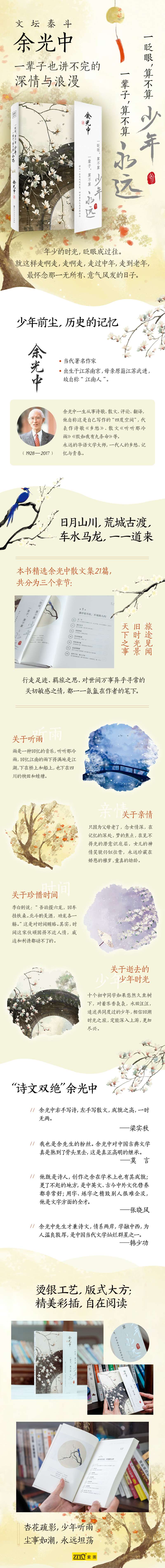 区别于市面上大量篇幅的堆砌,此版本散文精心选取余光中散文集中最具代表性的篇目,这些篇目既包括选入教材的经典篇目,像《听听那冷雨》,也包括其他脍炙名篇,如《花鸟》《故国神游》《猛虎和蔷薇》等。不仅篇目经典,章节划分也具层次性,选取的文章更是少年与回忆的交织,青春与成长的力量碰撞,思念与怀旧的流淌。