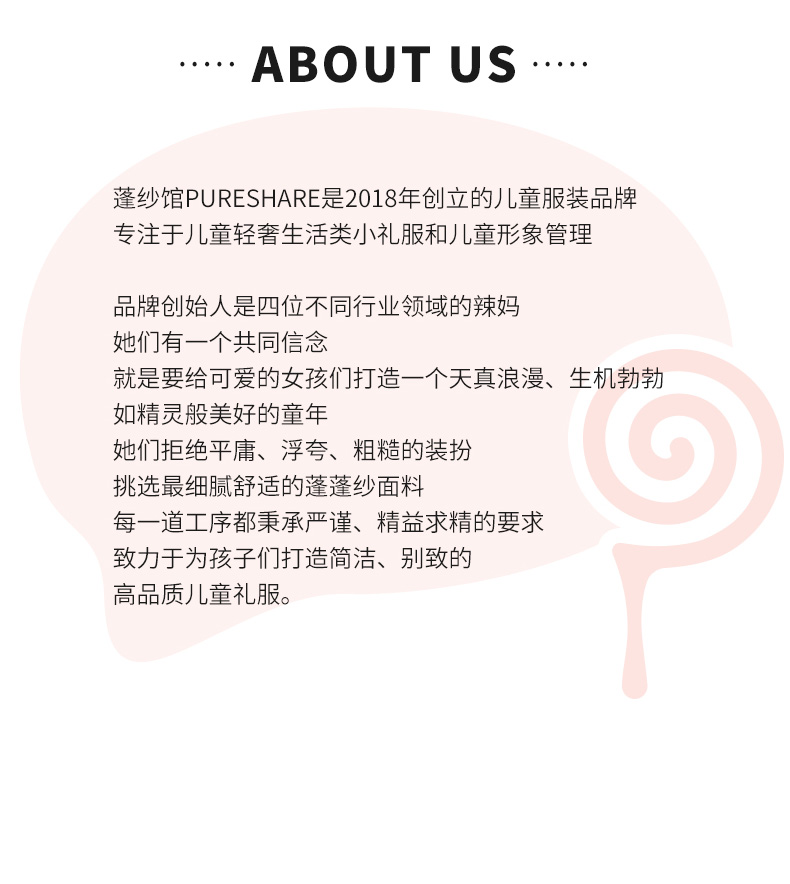 PureShare蓬纱馆,2018年创立的儿童服装品牌,专注于儿童轻奢生活类小礼服,主张“让孩子做最独特的自己”的品牌理念,为孩子们提供时尚简洁、优雅而又不失童真的生活类礼服。