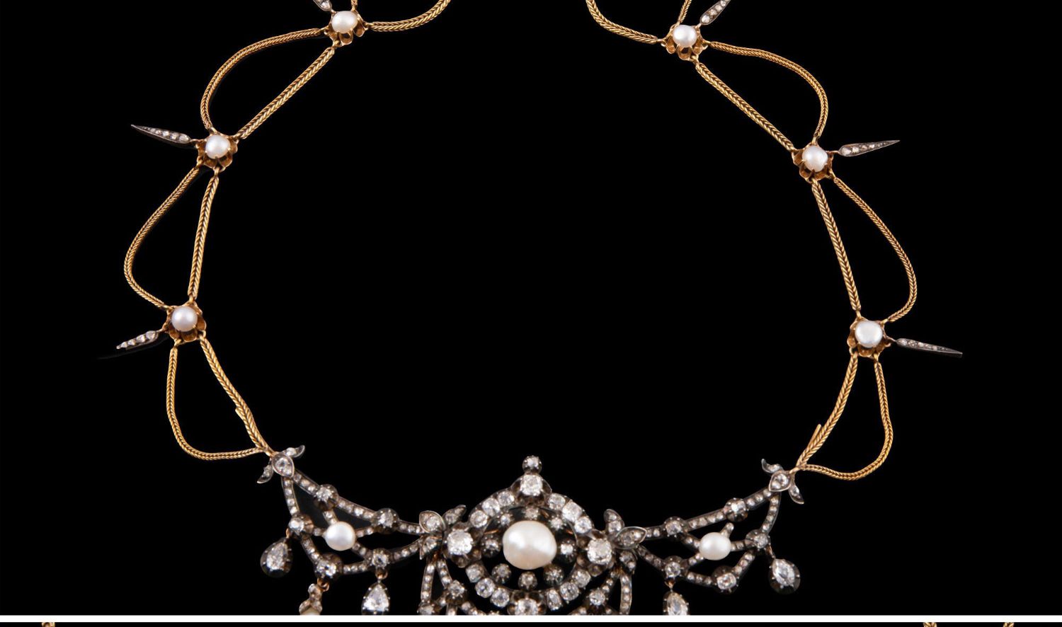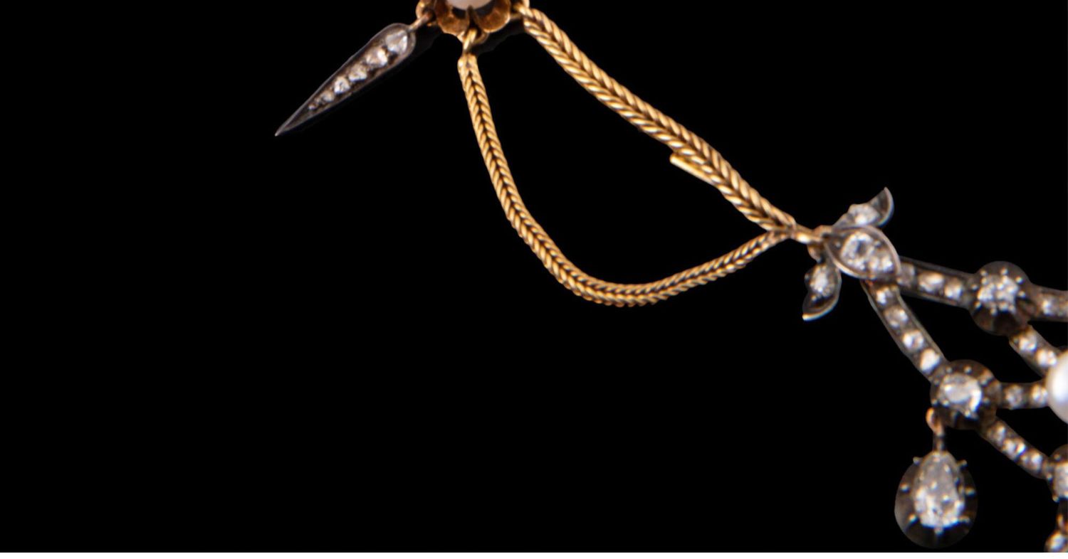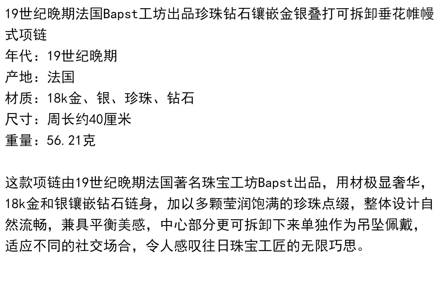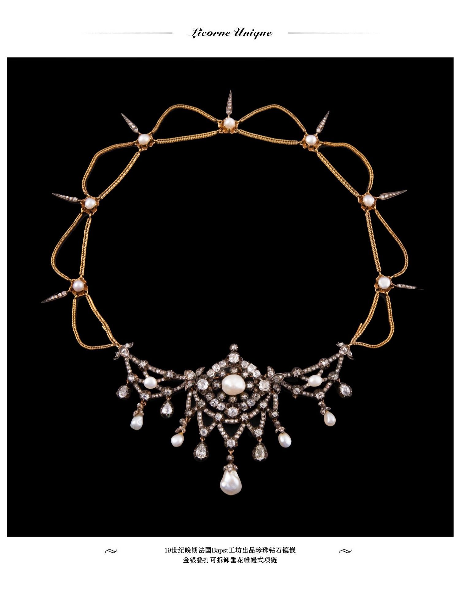独角鹿西洋古董首饰法国珍珠钻石金银叠打可拆卸垂花帷幔式项链