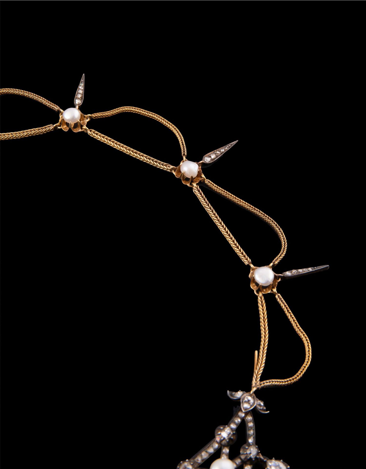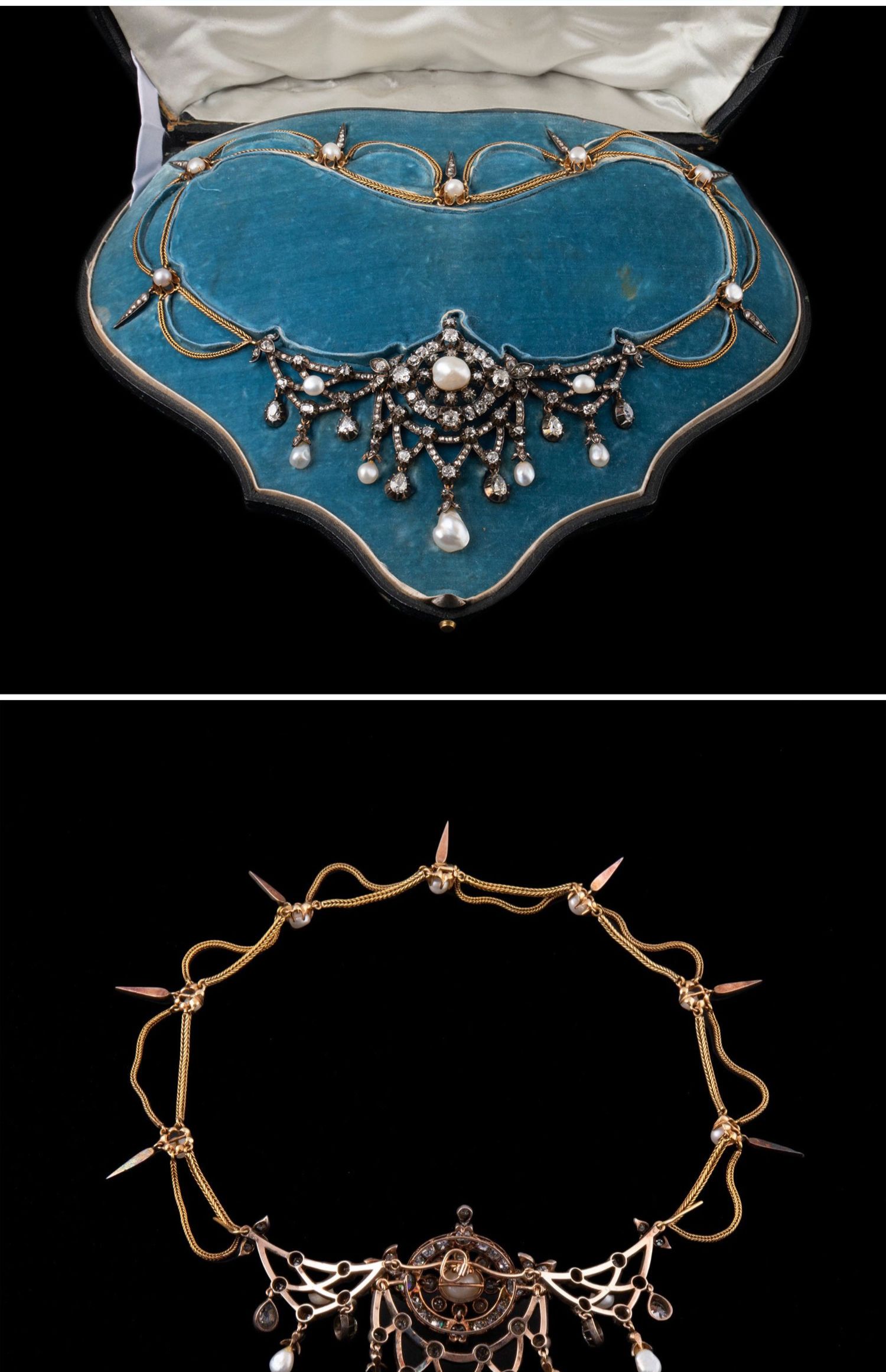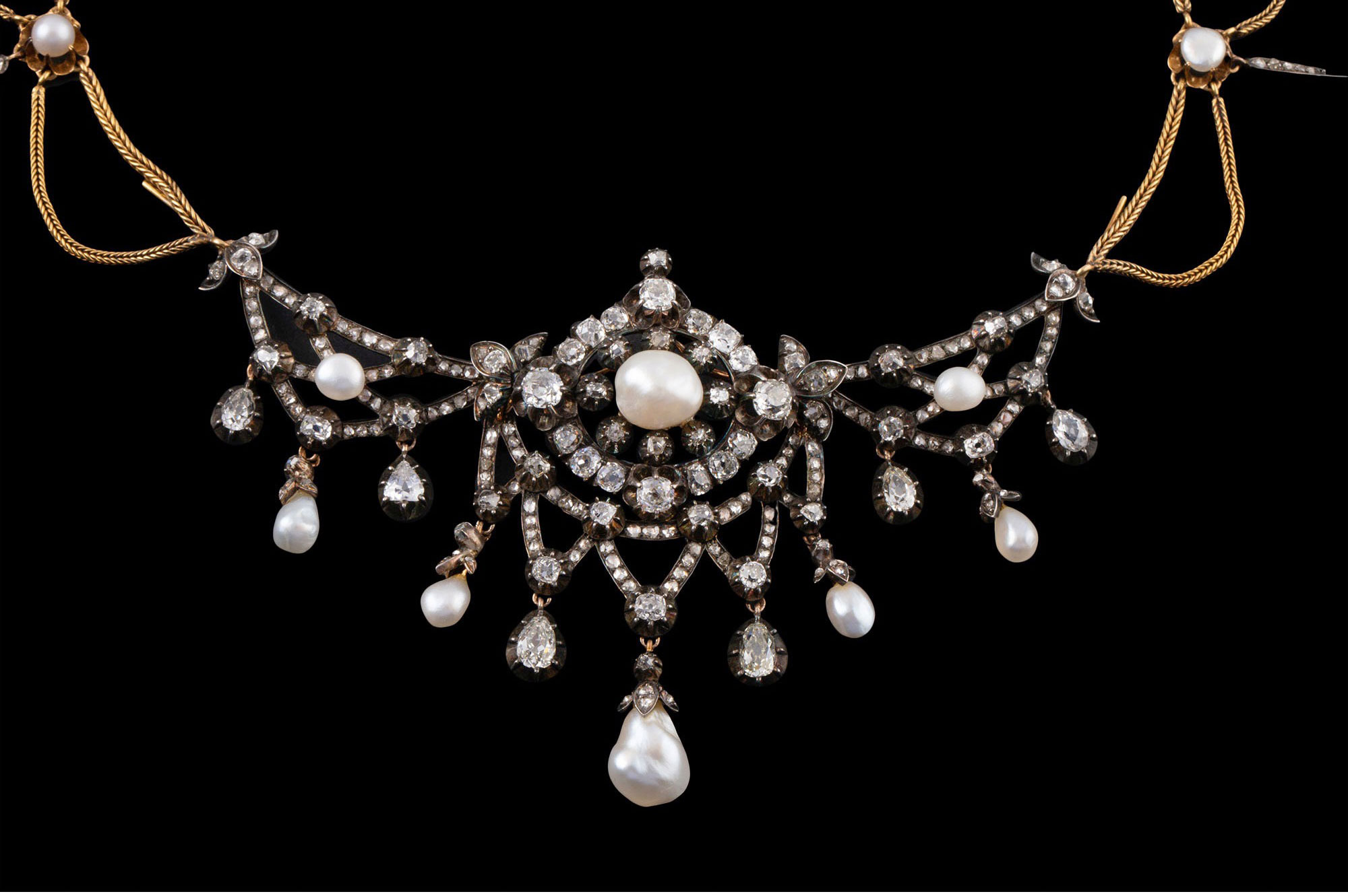 独角鹿西洋古董首饰法国珍珠钻石金银叠打可拆卸垂花帷幔式项链