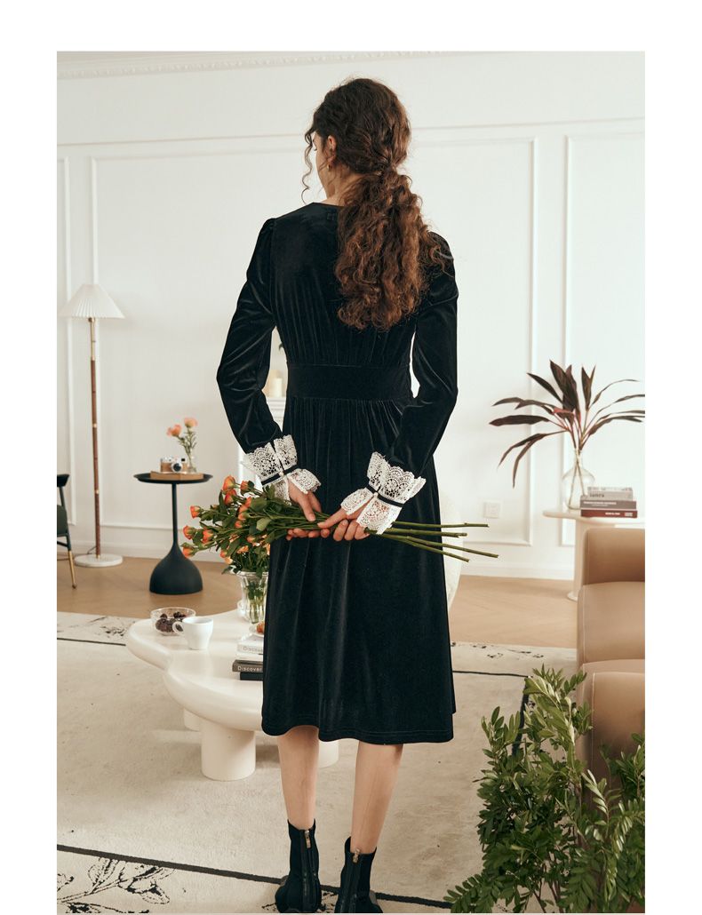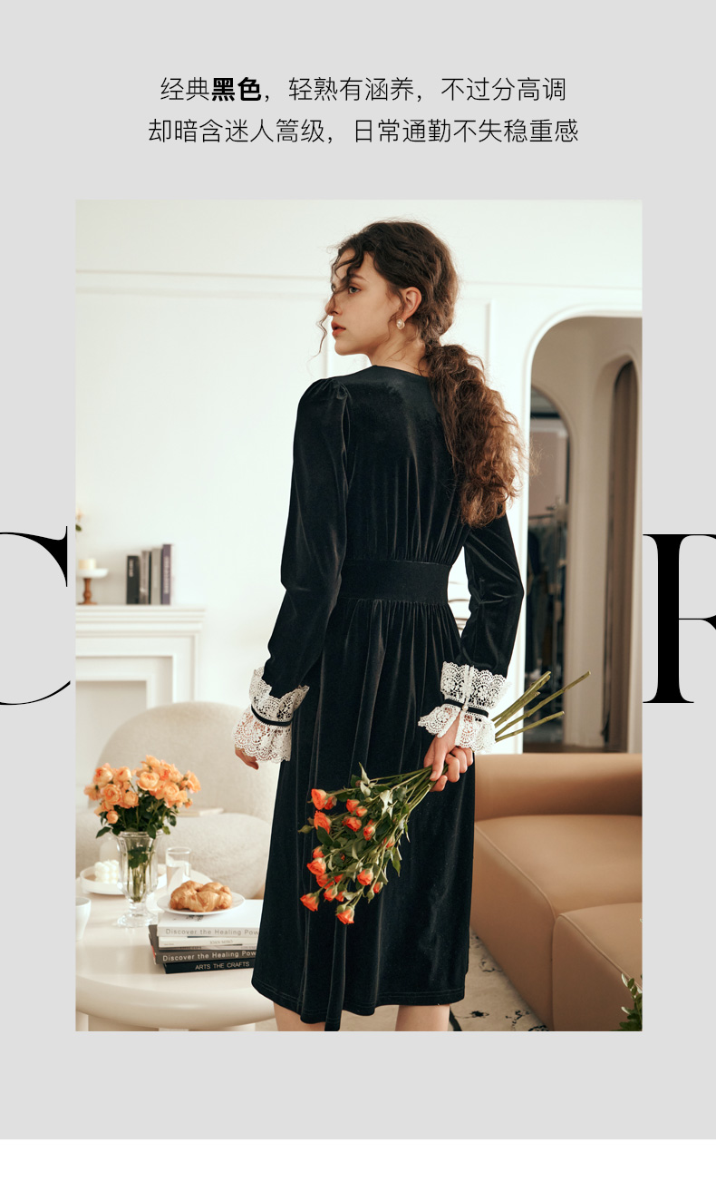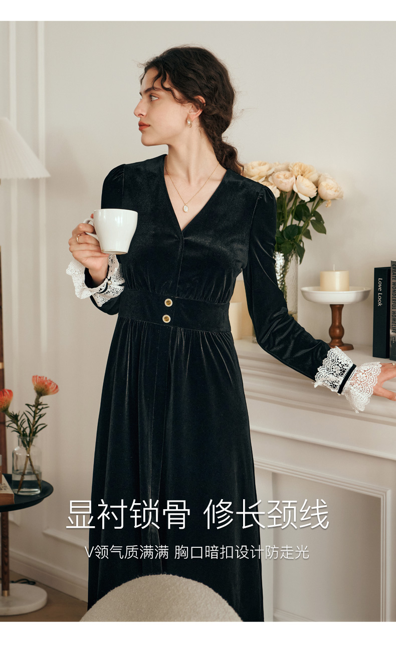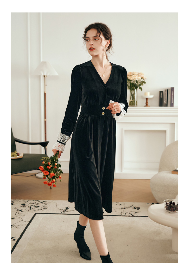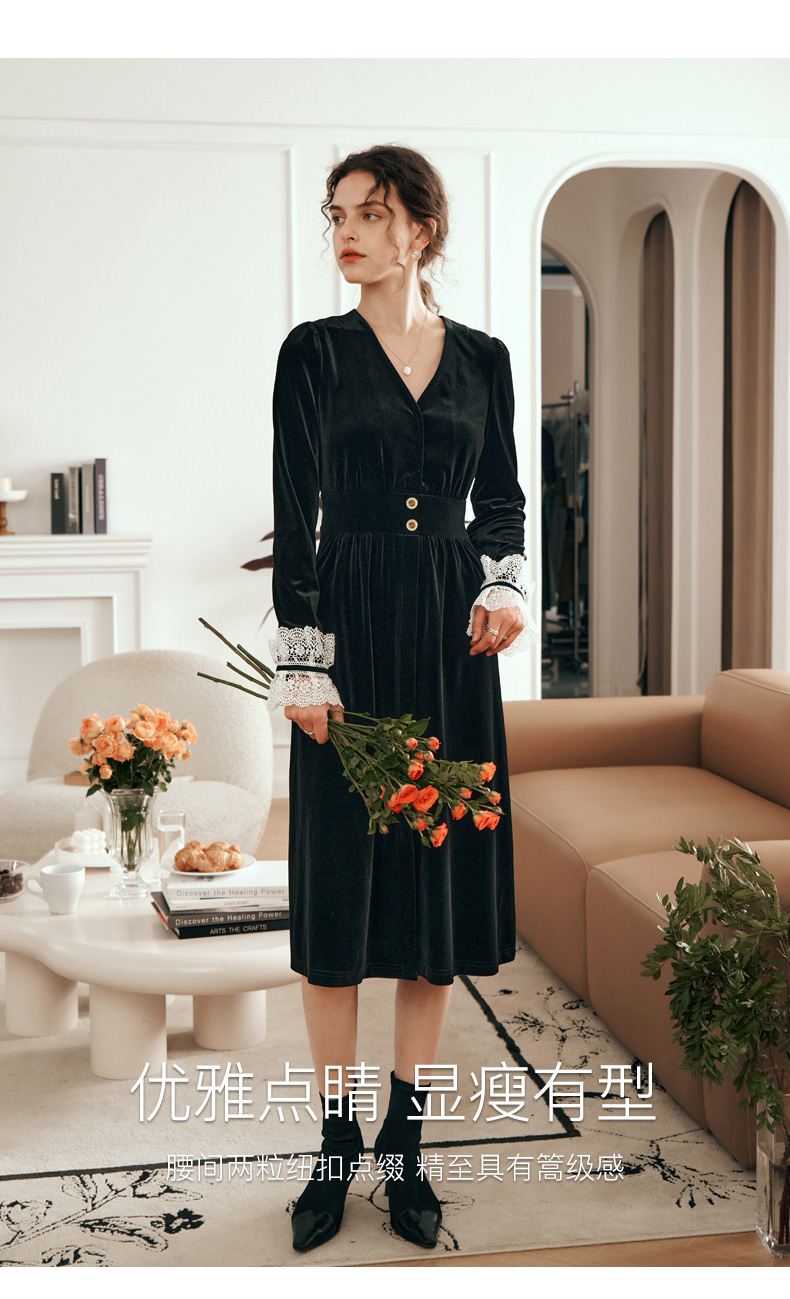 OLrain欧芮儿法式黑色连衣裙女春2025年新款气质V领显瘦裙子