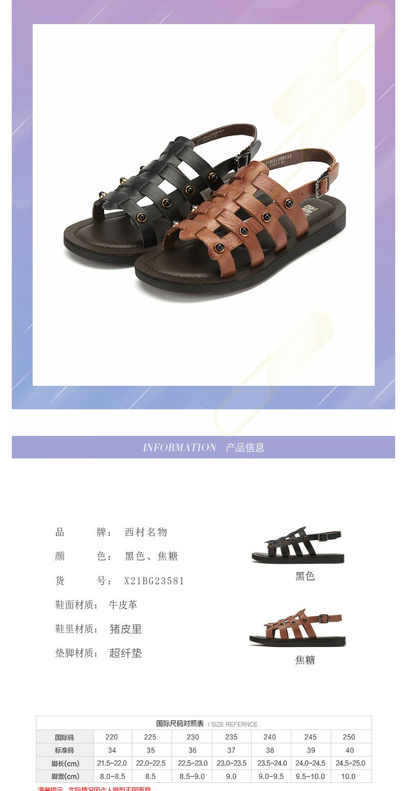 西村名物2022年夏季新款舒适牛皮平底休闲女凉鞋罗马风运动凉鞋23581