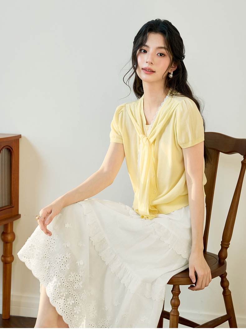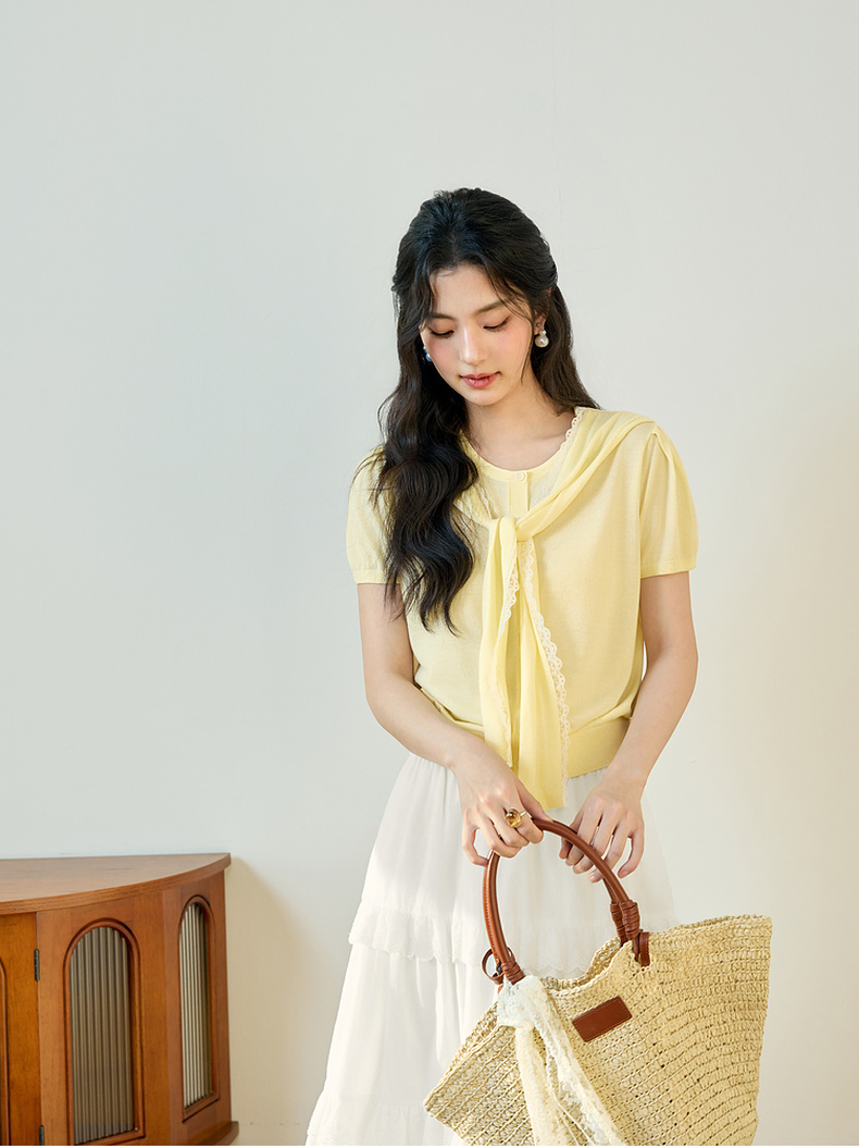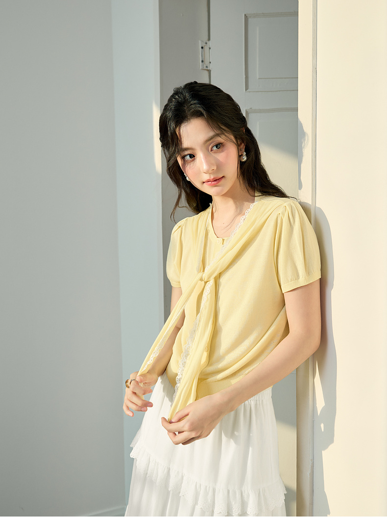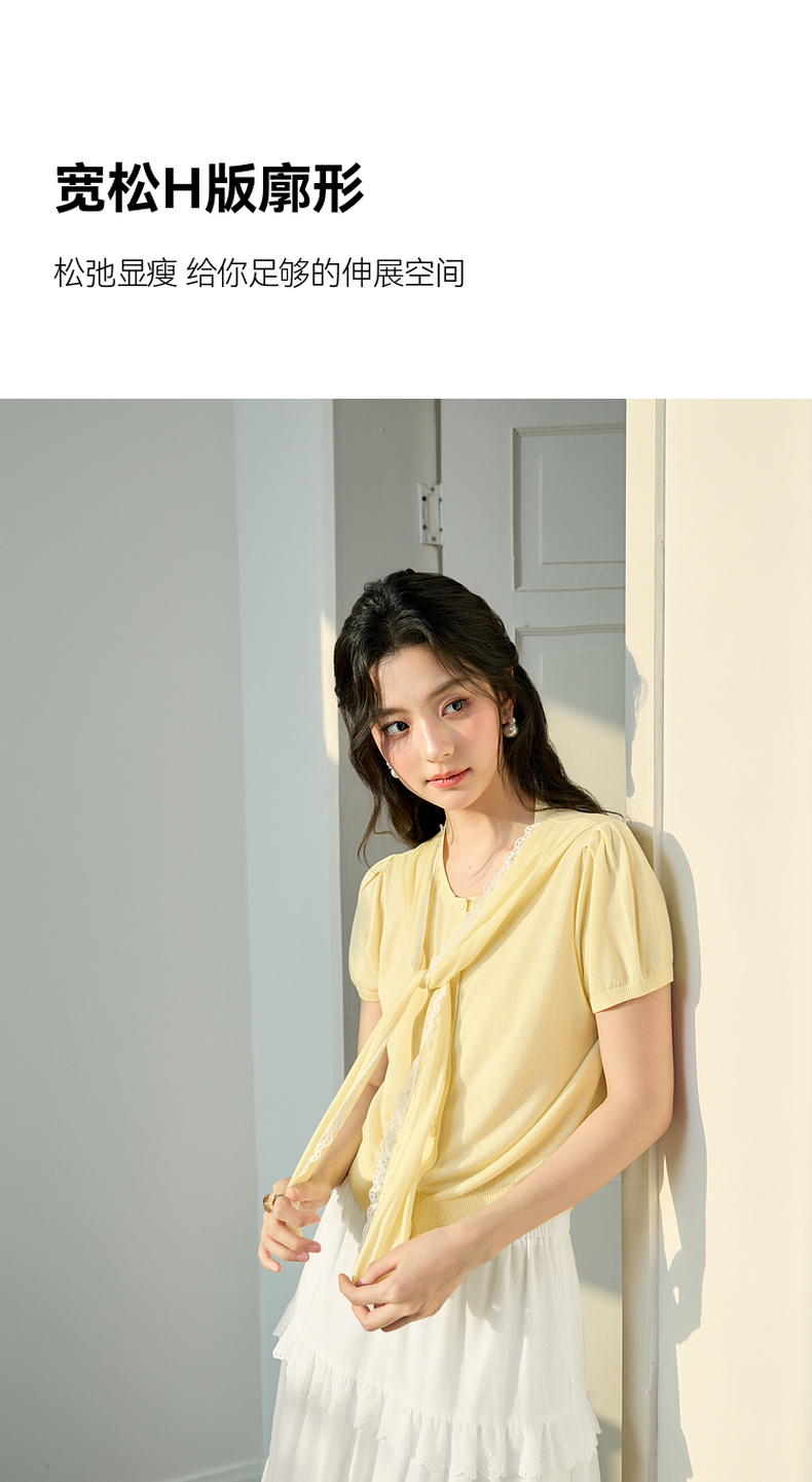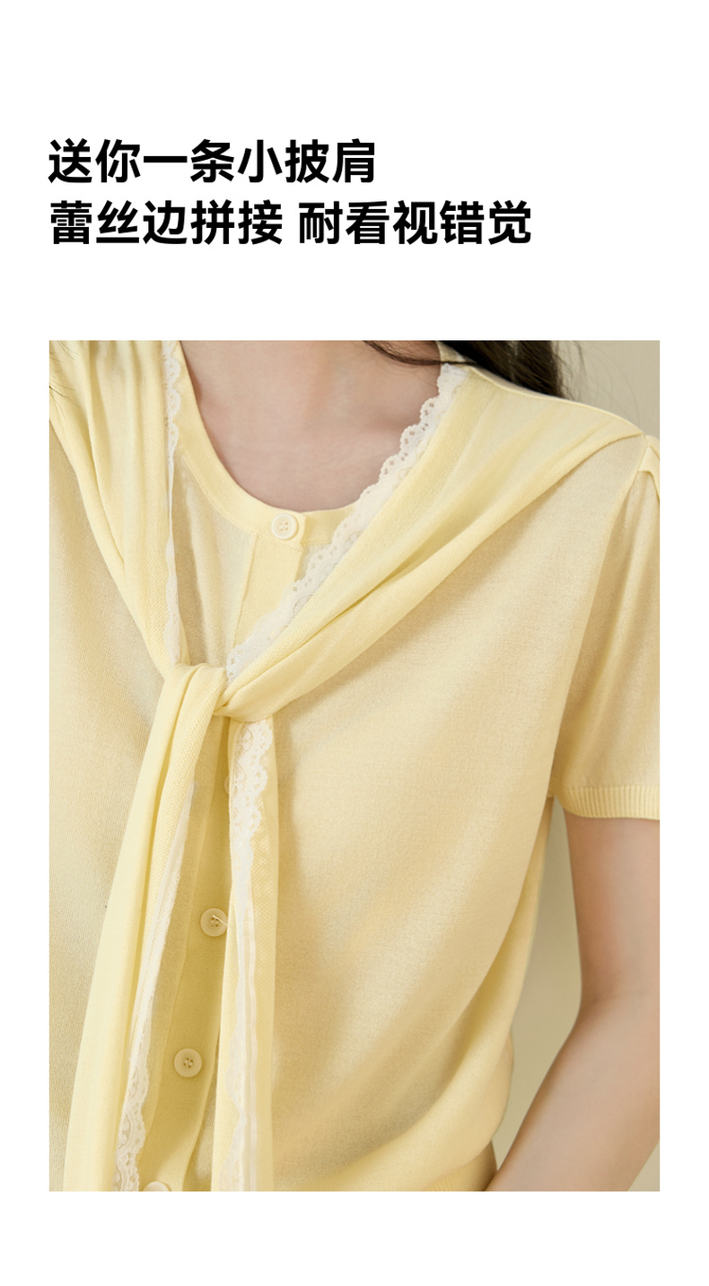 【严选】诗凡黎100%莱赛尔蕾丝拼接披肩针织衫25夏新款法式泡泡袖轻薄上衣7G4430701