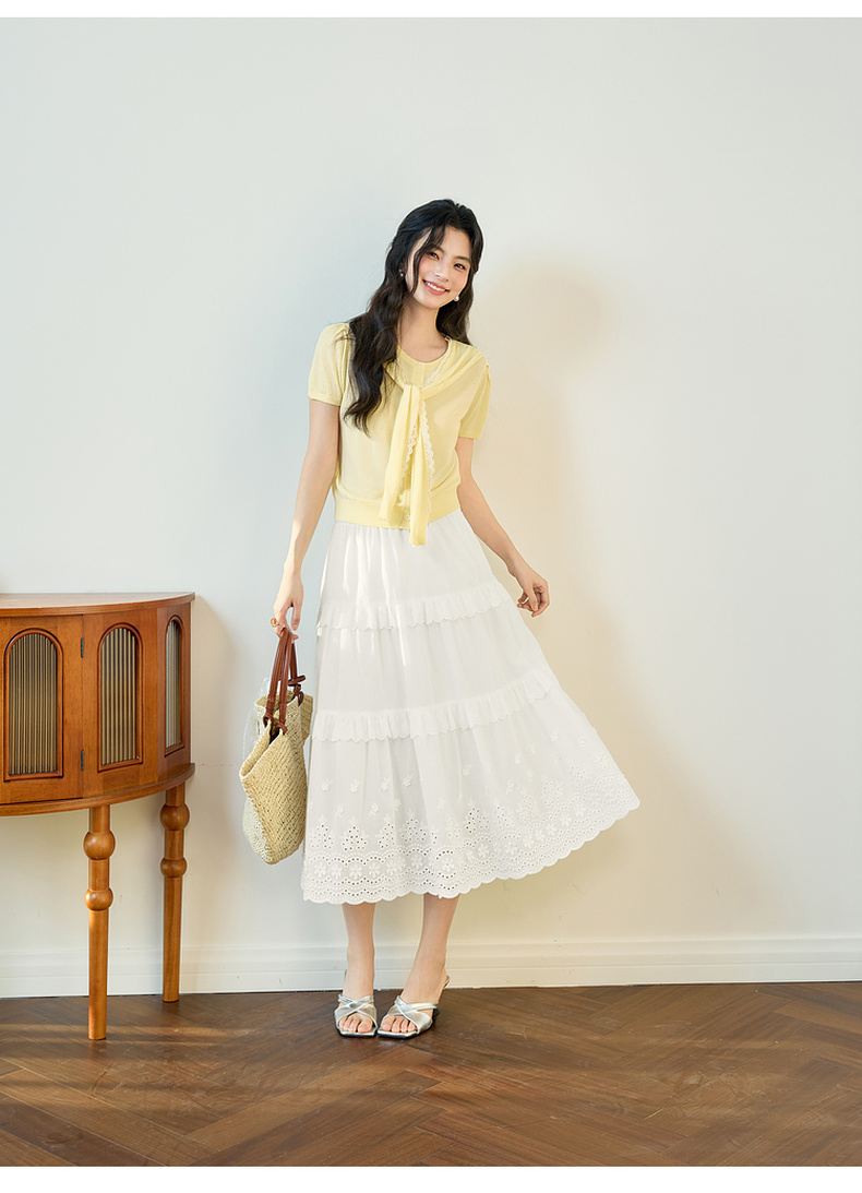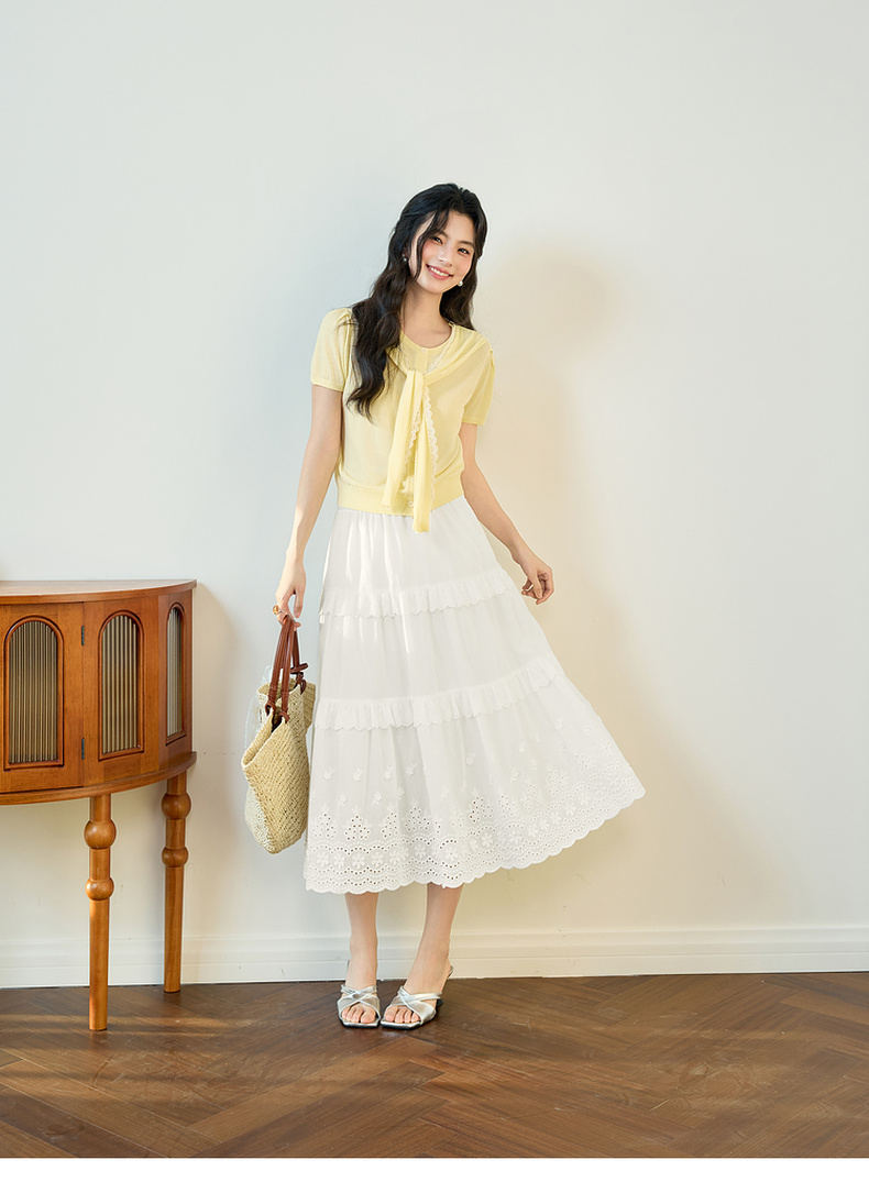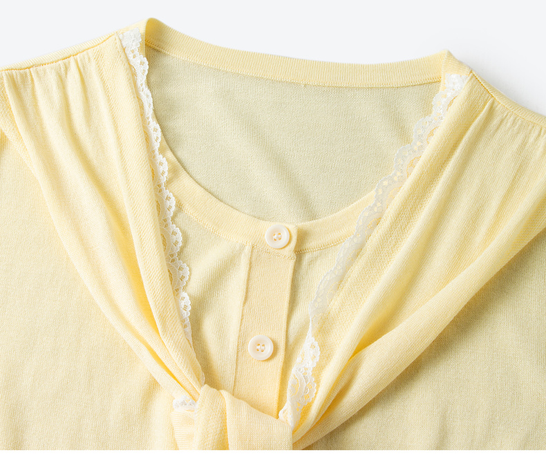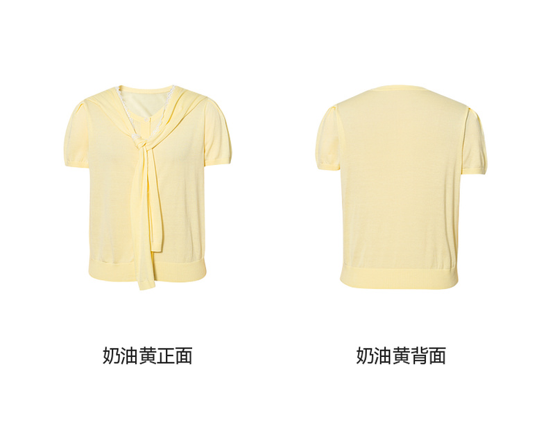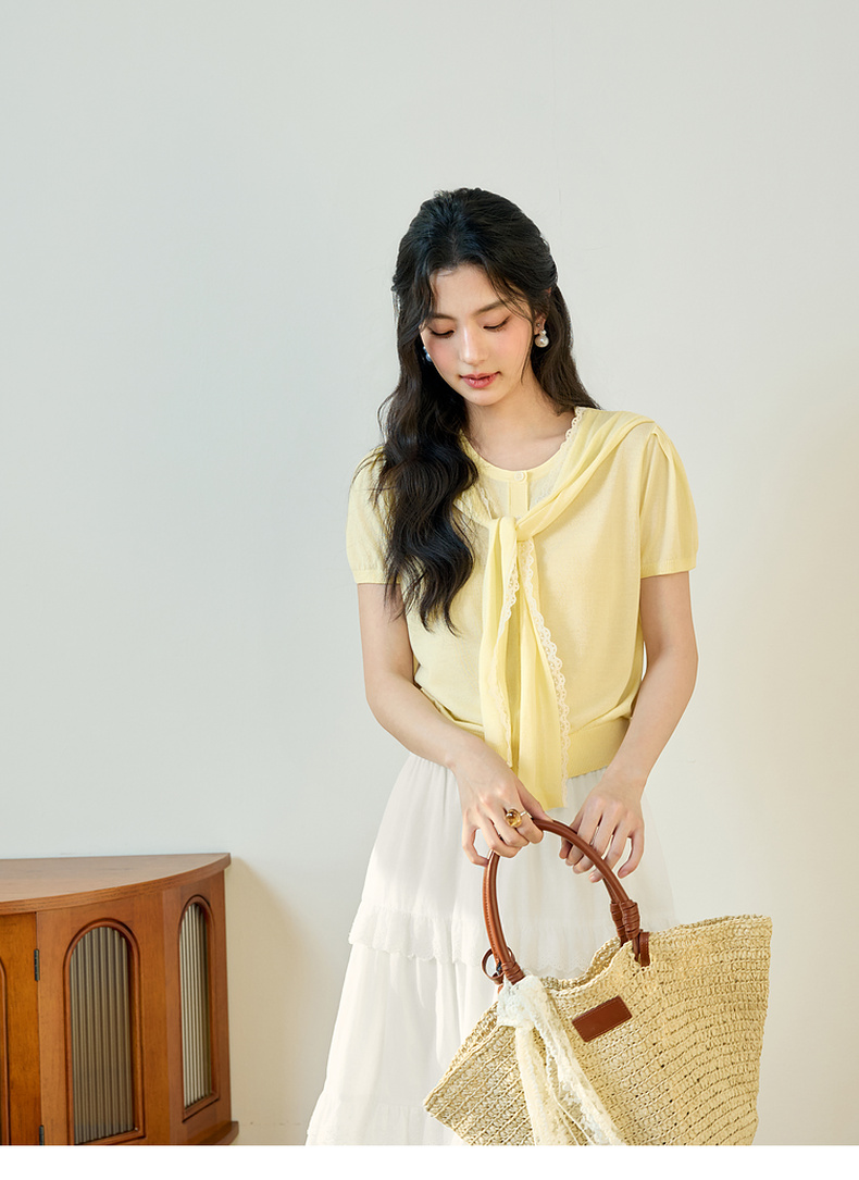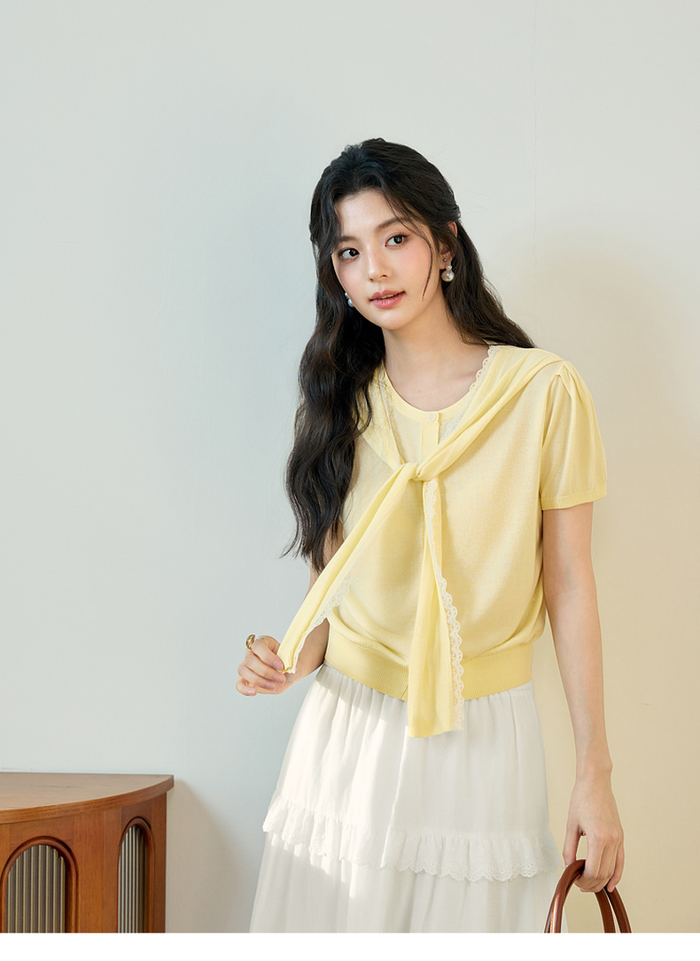 【严选】诗凡黎100%莱赛尔蕾丝拼接披肩针织衫25夏新款法式泡泡袖轻薄上衣7G4430701