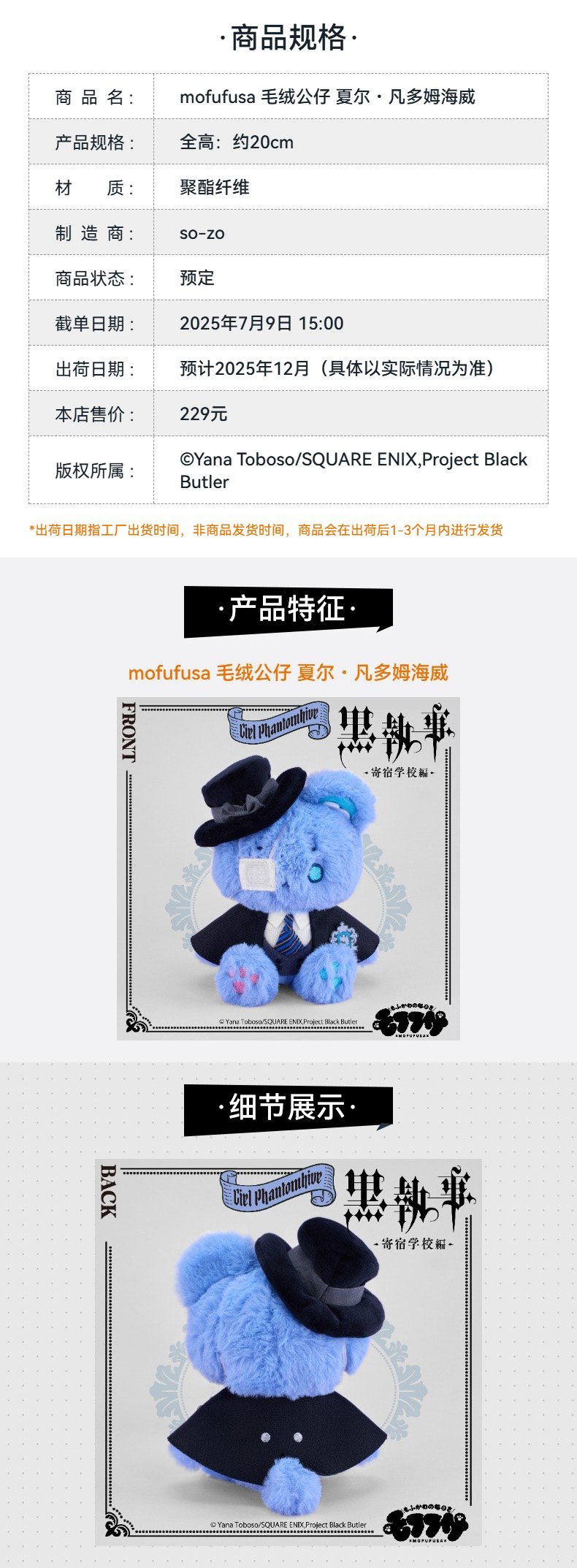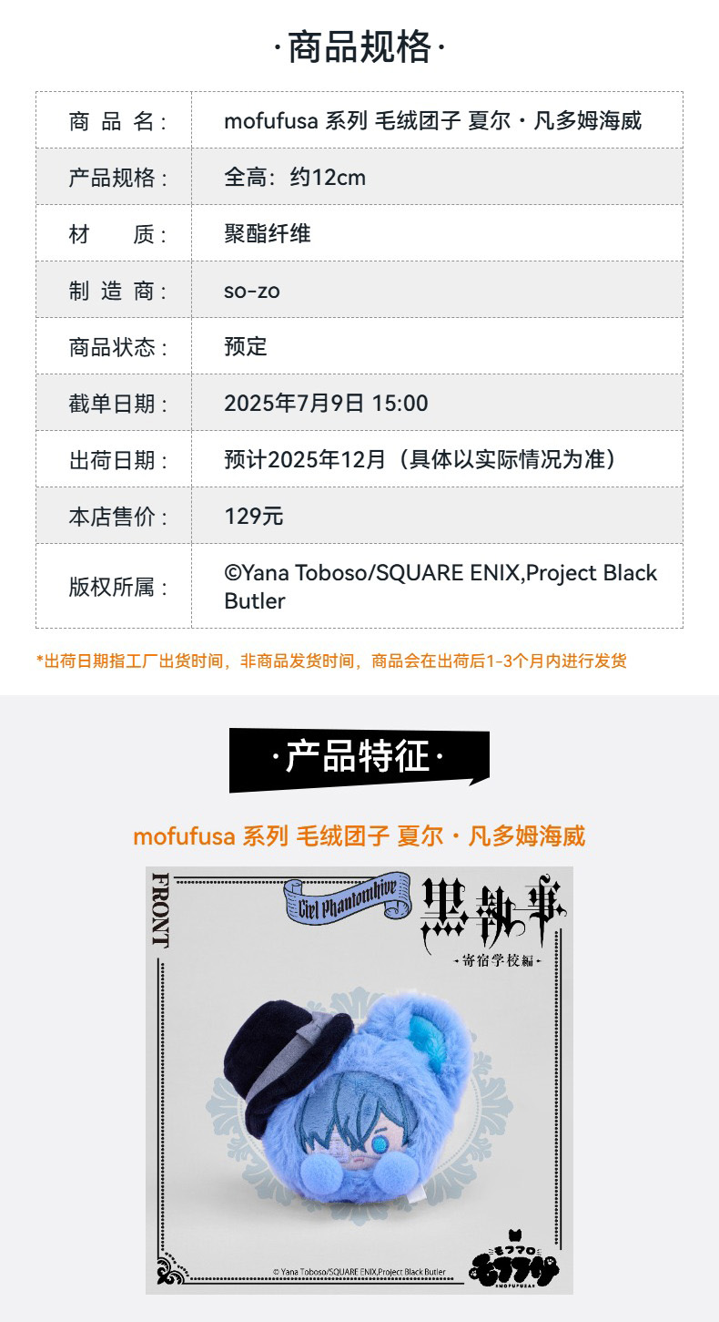 【GSC现货】mofufusa 毛绒公仔/团子 夏尔·凡多姆海威 黑执事