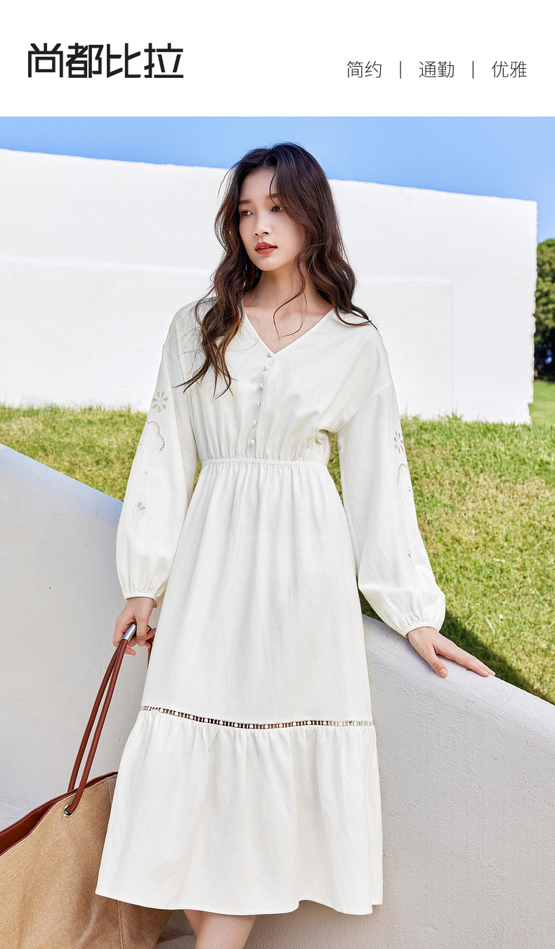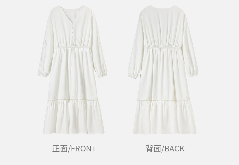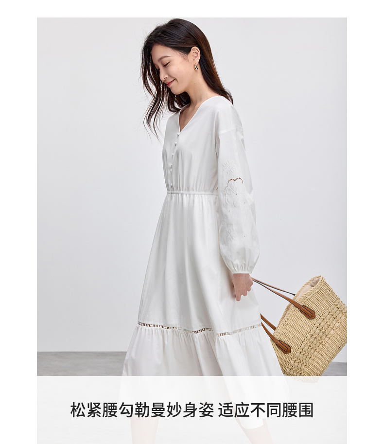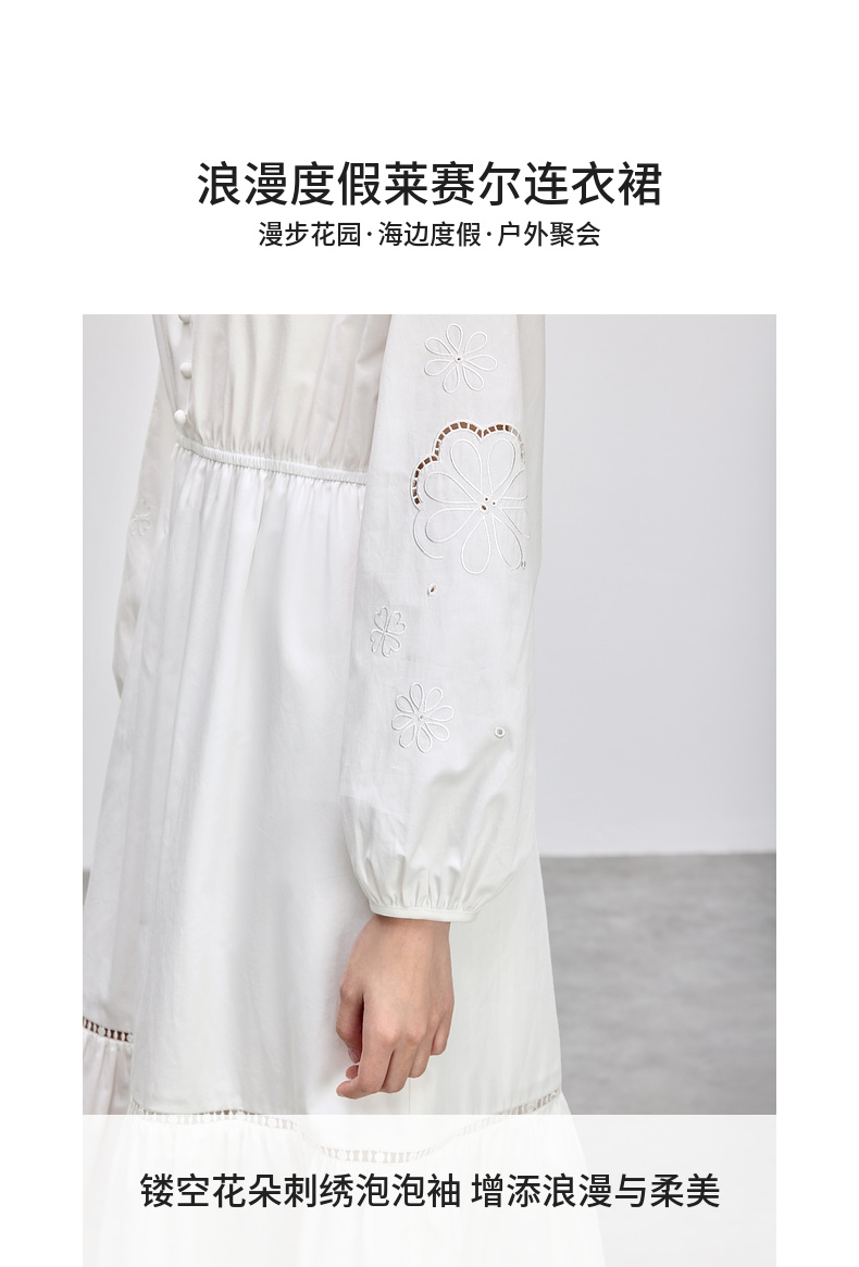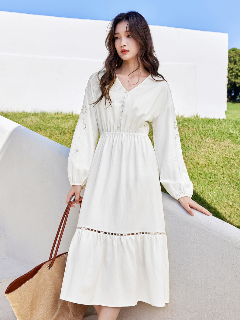 【内购】优雅浪漫度假V领落肩泡泡袖镂空显瘦中长连衣裙-151L58210