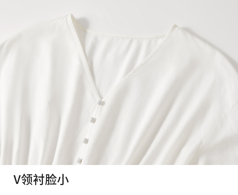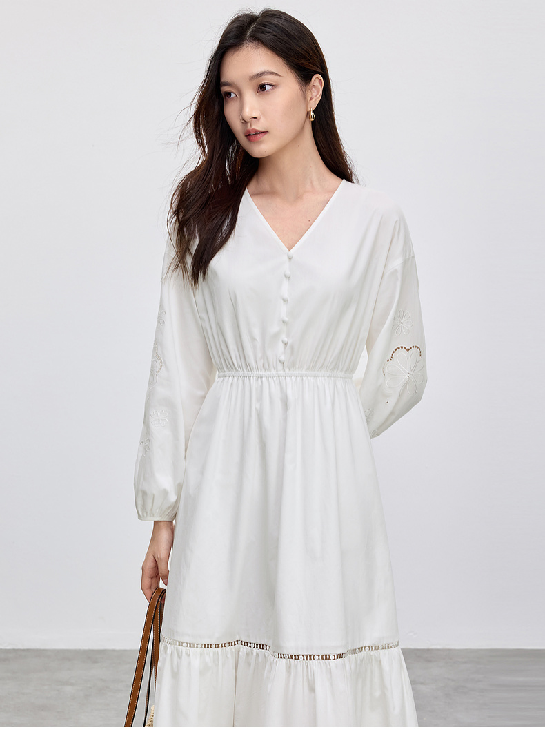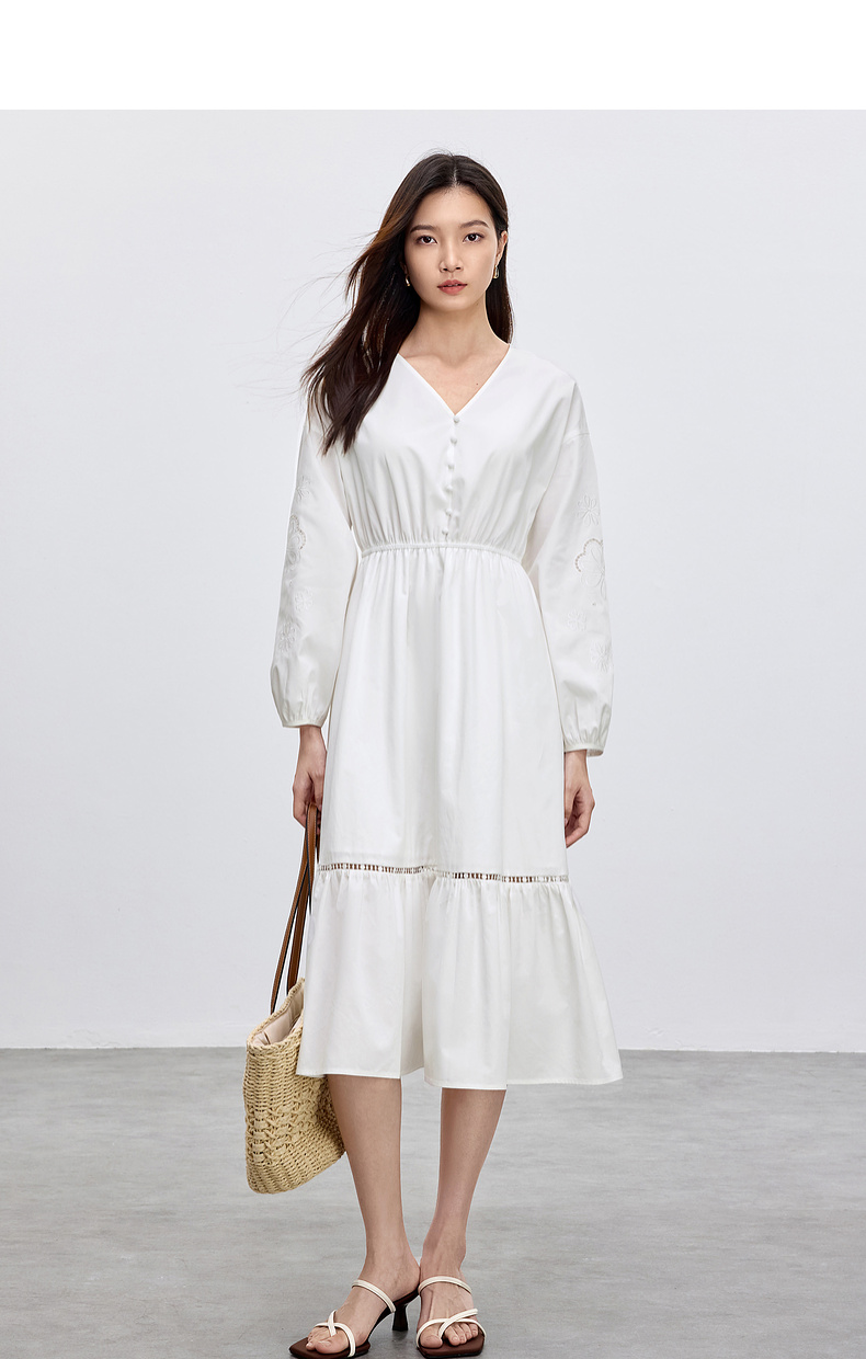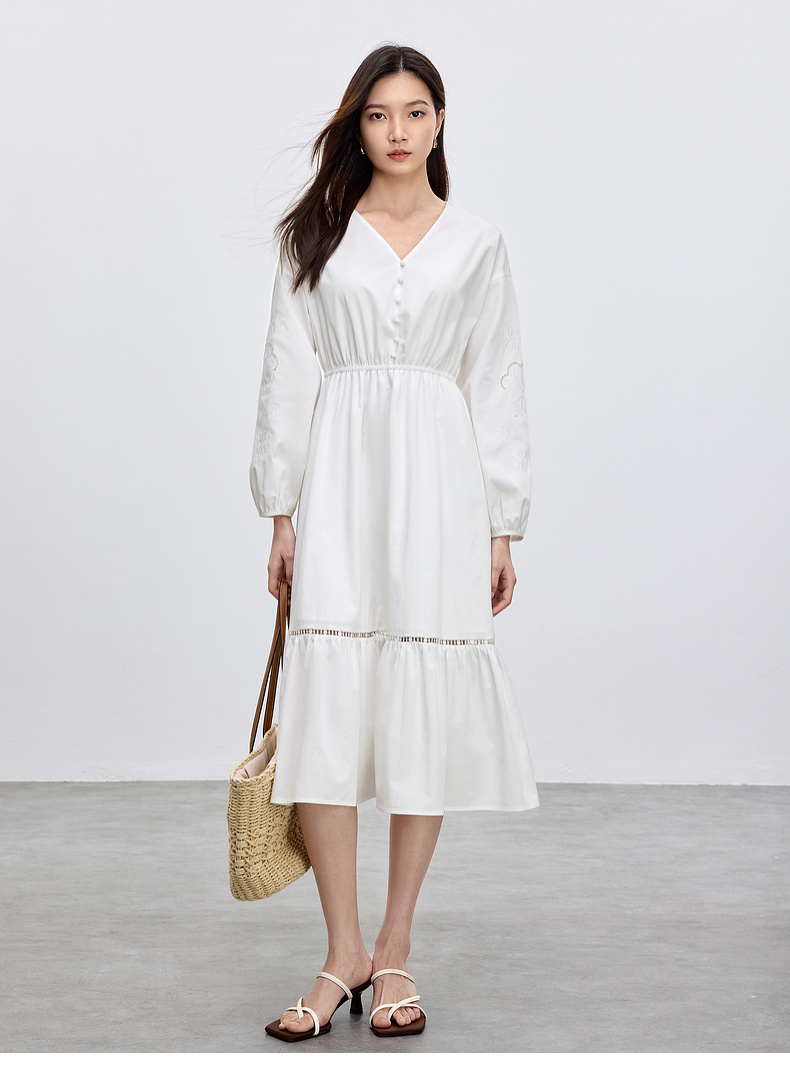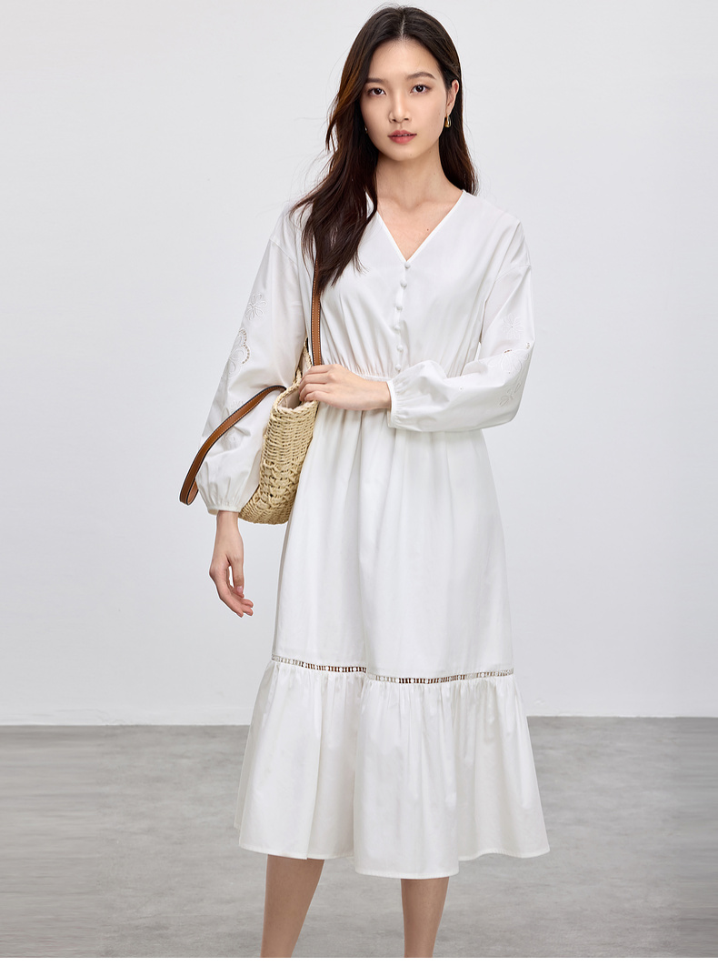 【内购】优雅浪漫度假V领落肩泡泡袖镂空显瘦中长连衣裙-151L58210