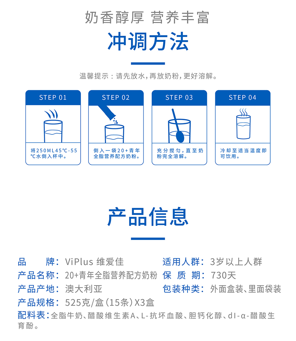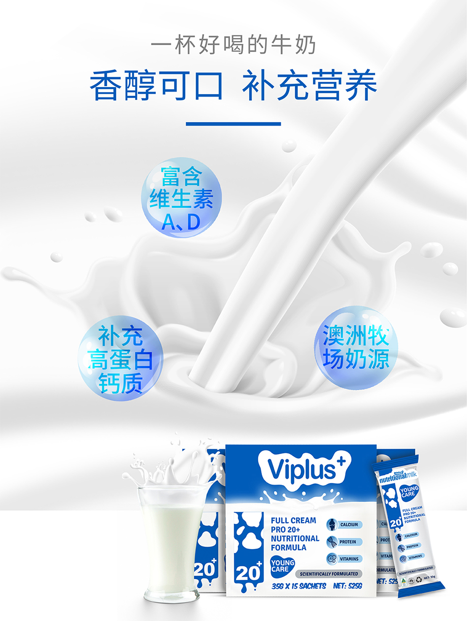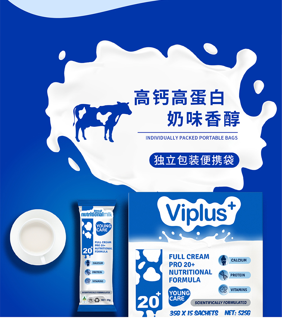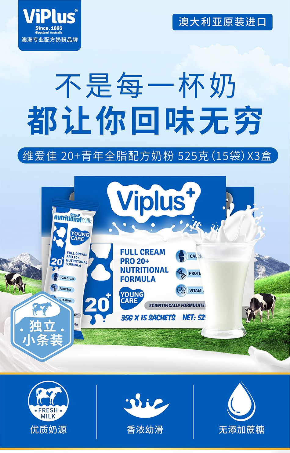 Viplus维爱佳澳洲进20+青年全脂配方奶粉成人高钙高蛋白学生速溶便携小袋装牛奶粉525g*1盒【维爱佳】