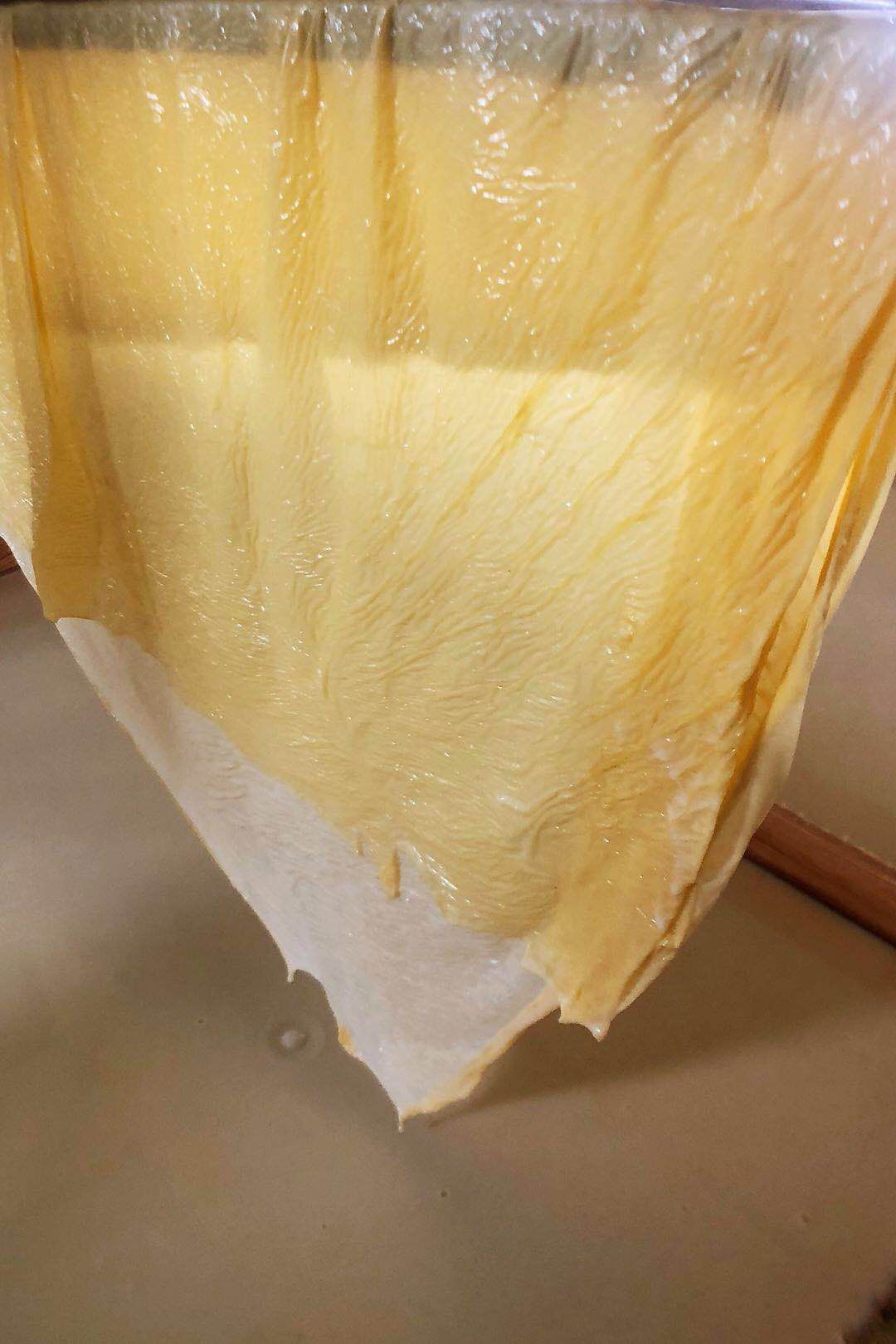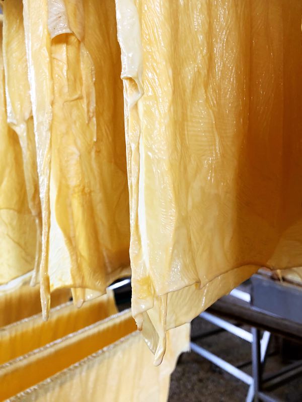 有人会问了,那剩下的豆浆不是浪费了?不是的,剩下的豆浆我们会用来做成豆腐,干豆腐皮等豆制品美食。但是最好的豆皮已经晾好,等待着熏制成为引人流口水的豆皮卷啦~