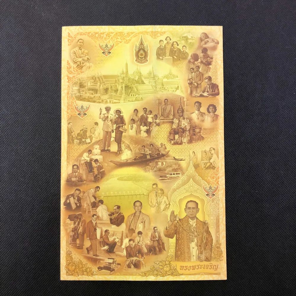 背面图案:描绘的是泰国国王青年时代、中年时代、老年时代的皇室活动等重大历史事件。三连体纪念钞组成一幅精美的画面,记录了国王一生的事迹。