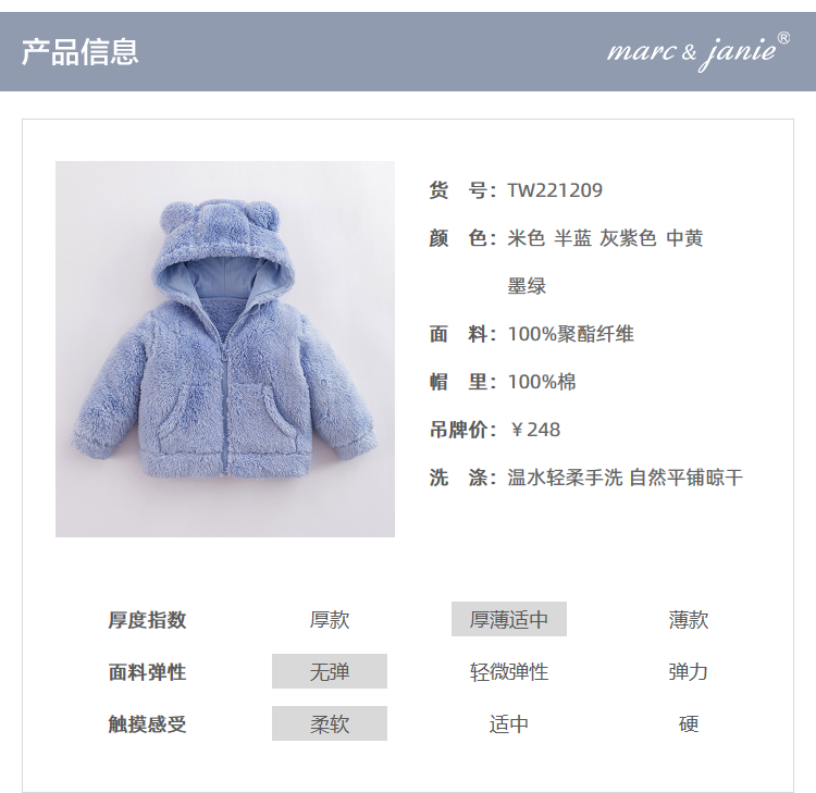 马克珍妮秋装新款 男女童双面舒棉绒连帽外套221209
