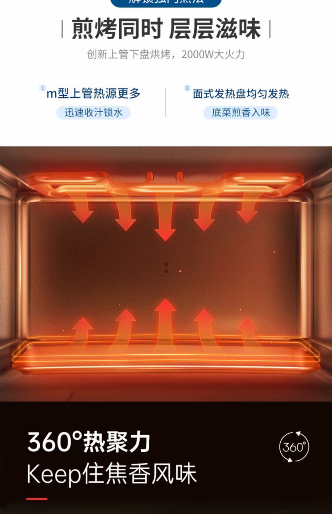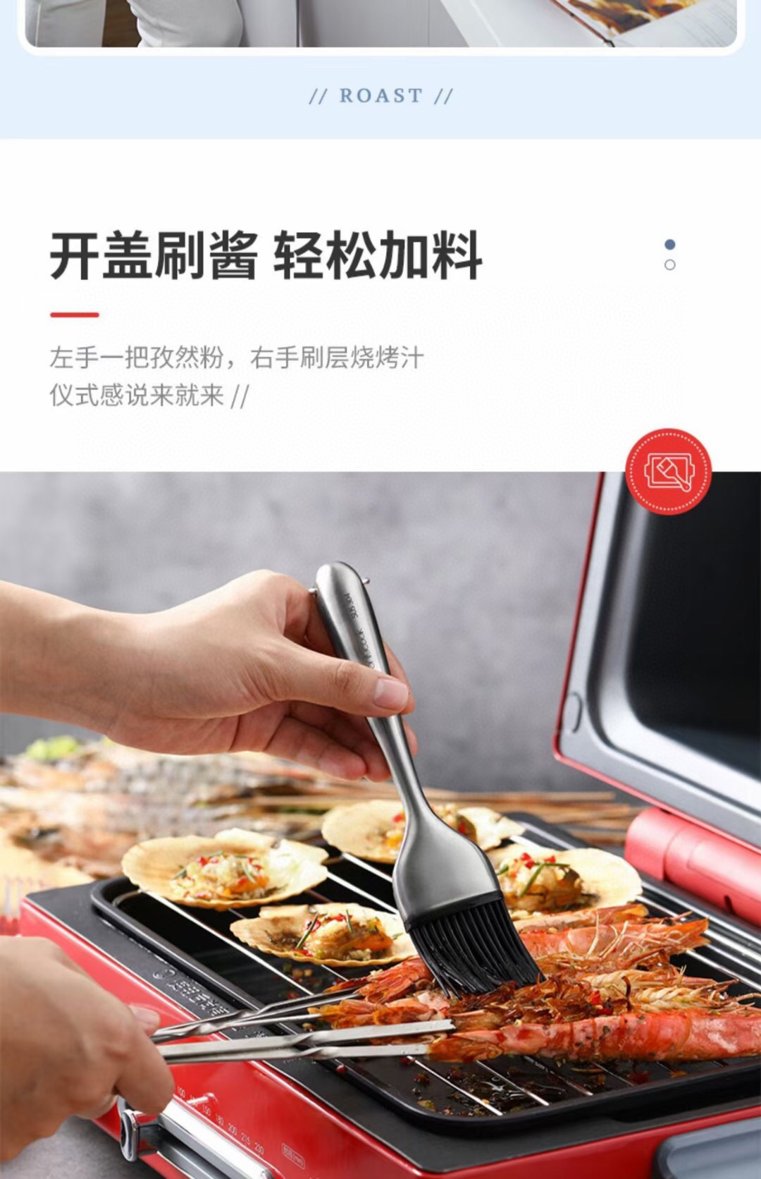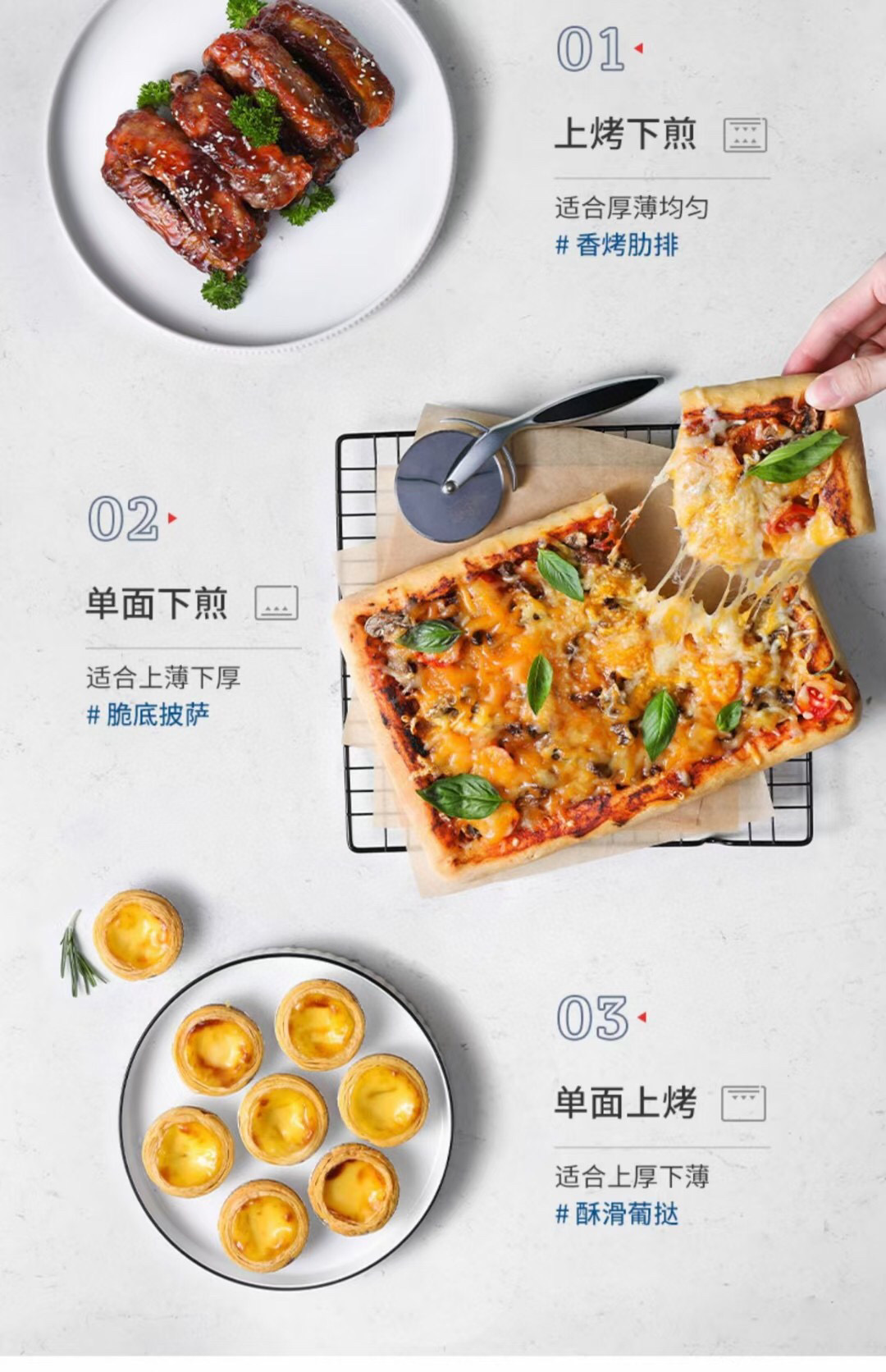 烘焙:双层独立控温,口感随心把控煎烤:灌包面式发热盘,高热效更安全烧烤:开盖刷酱,轻松切换烧烤模式!